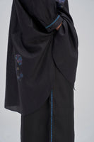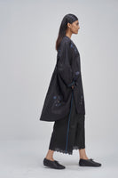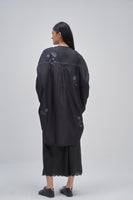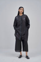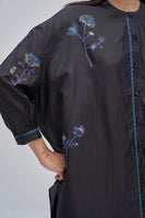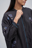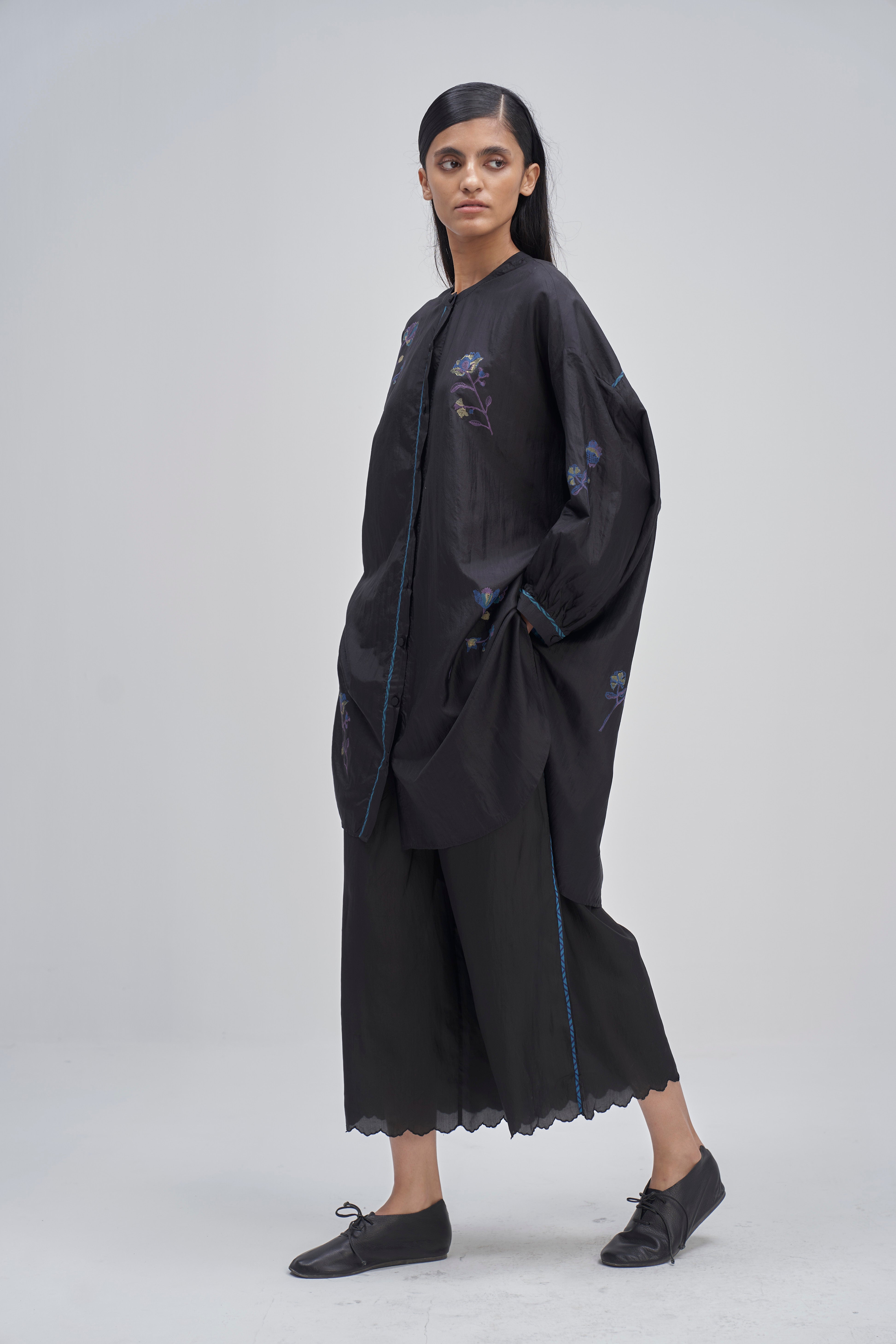 Oversize fit front open button down mandarin collar long shirt-top with light puff on the sleeve and curved hem detail. Constructed in solid 100% silk fabric with multicolor placement floral handblock print detail all-over. Finished with contrast handblock print piping detail on placket and cuff and multicolor collage handblock print facing detail. Comes with solid relaxed fit trouser with scalloping detail on hem finished with contrast handblock chevron print piping detail on side seams.