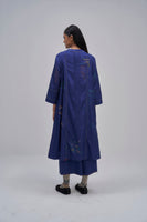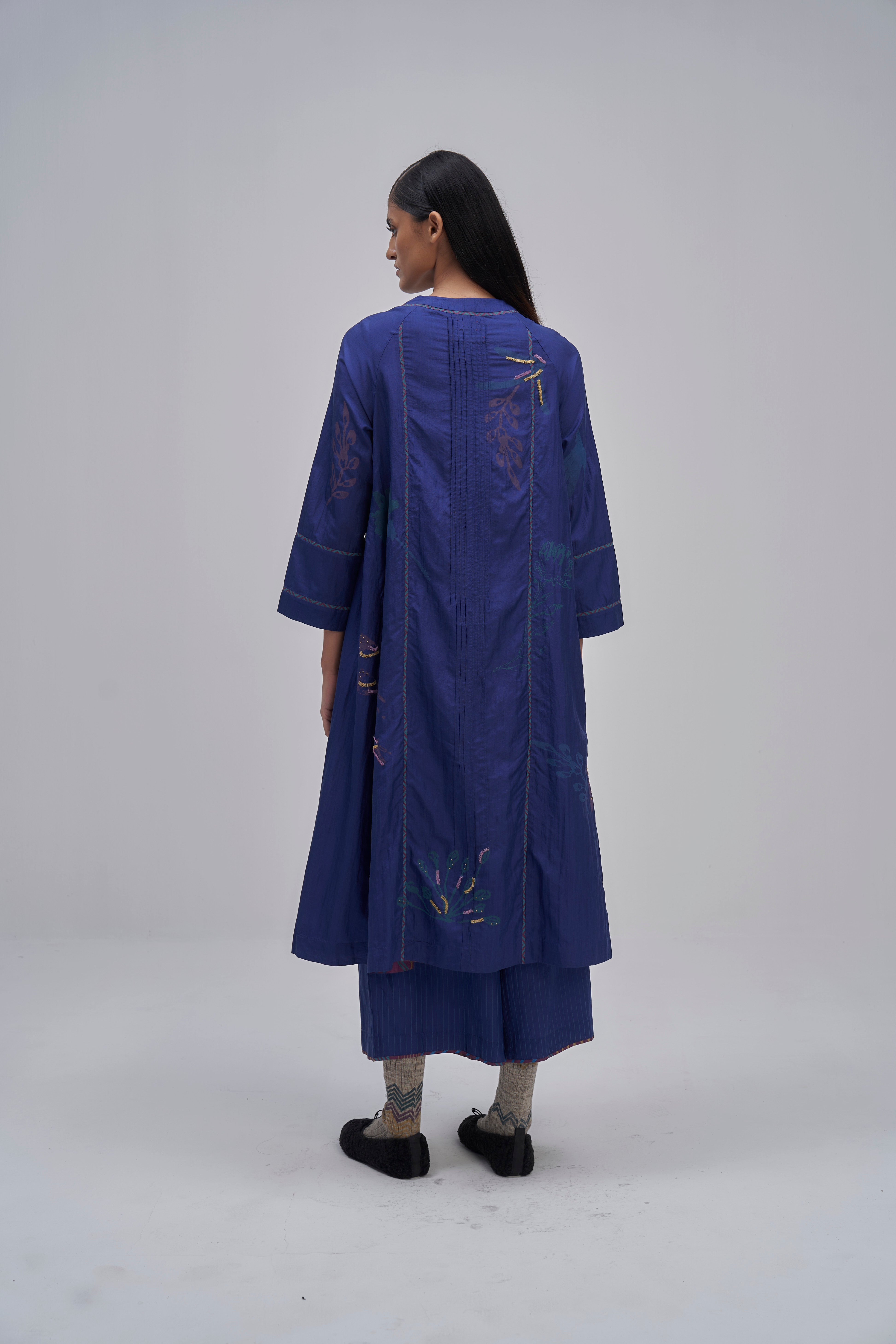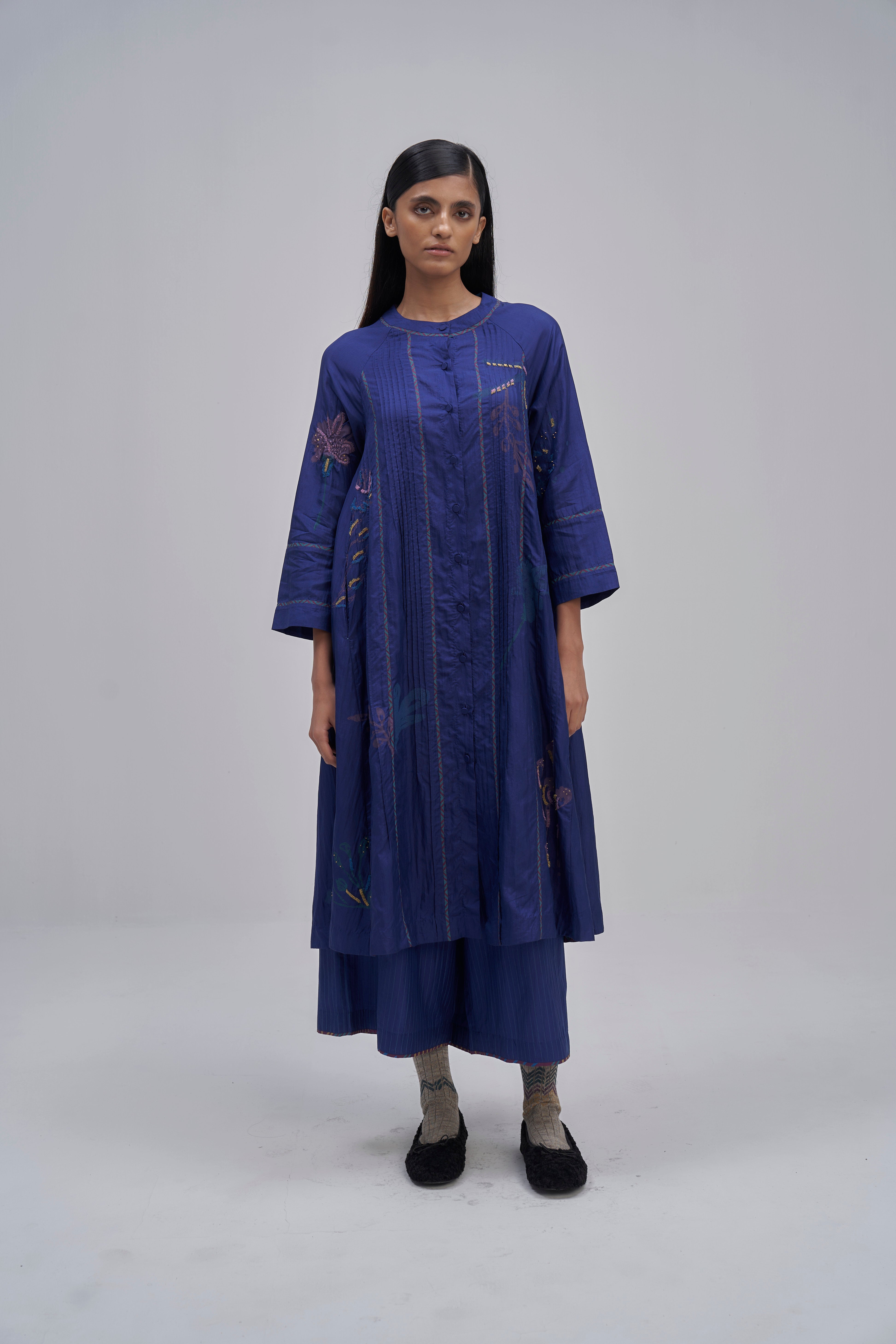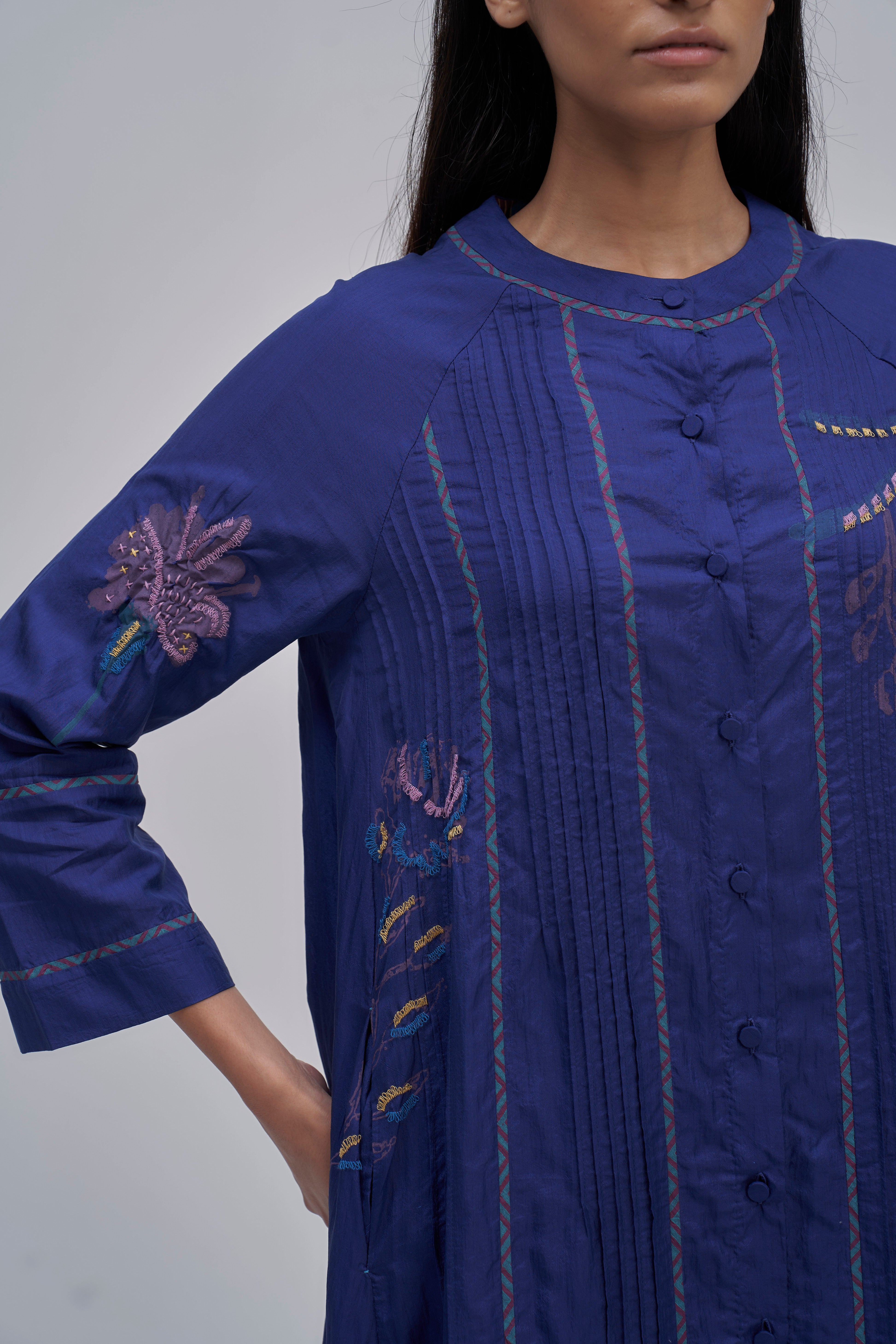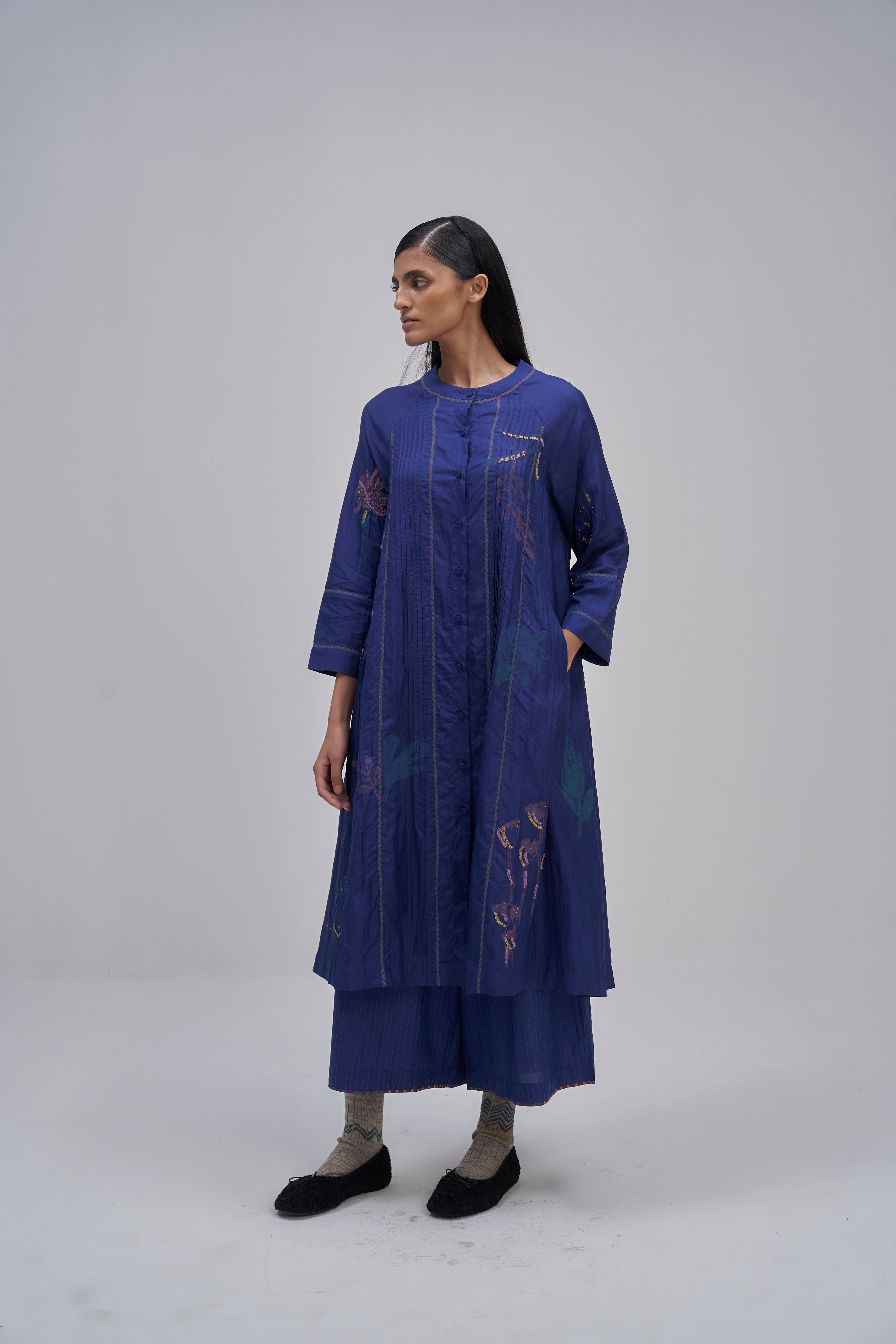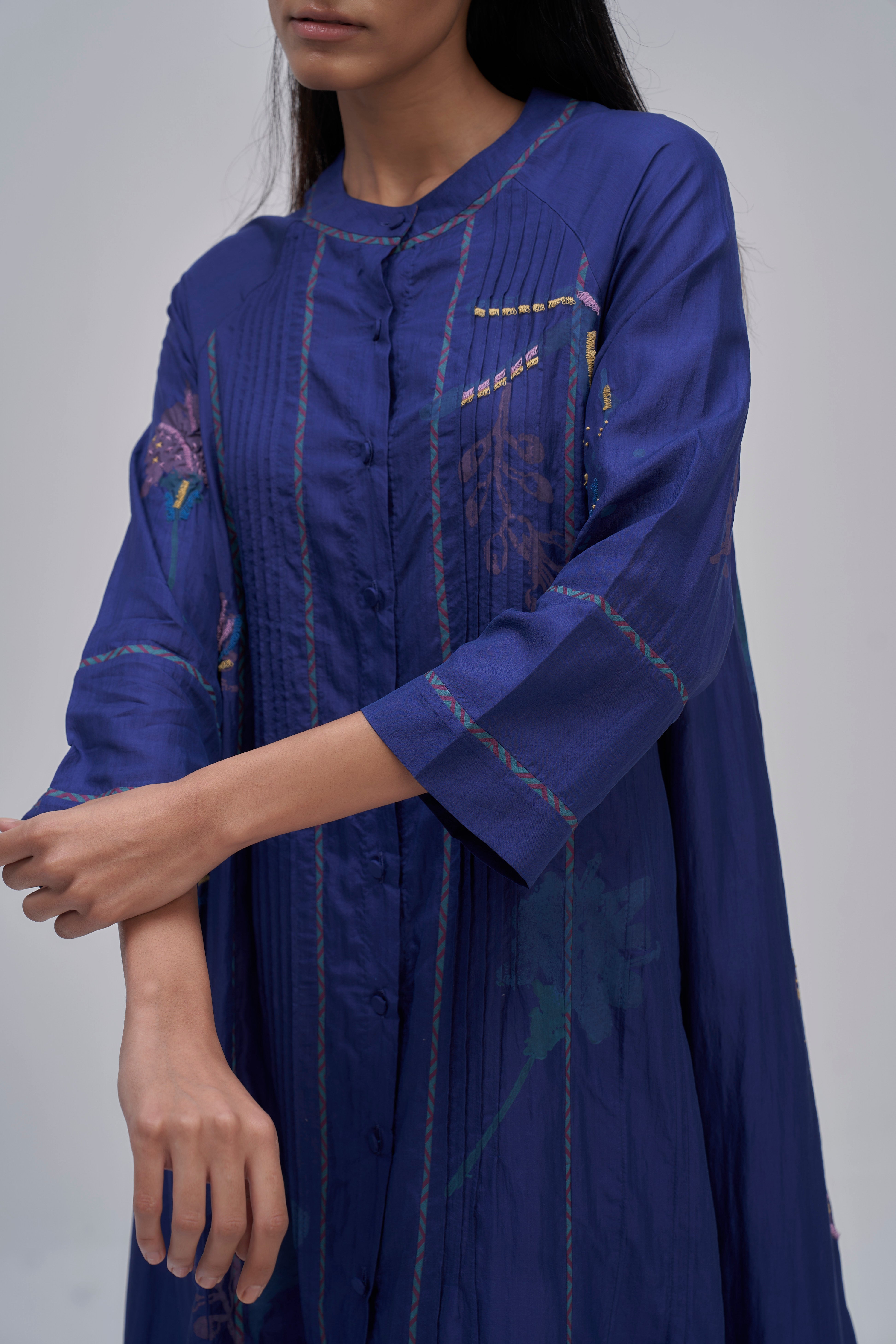 Mandarin collar raglan sleeves front open button down A-line fit midi length panelled dress. Constructed in contrast chunky floral placement print with hand embroidery detail 100% silk fabric. Finished with contrast handblock print piping and facing detail. Comes with tone-on-tone handblock print striper 100% silk relaxed fit trouser, finished with contrast multicolor handblock print facing detail.