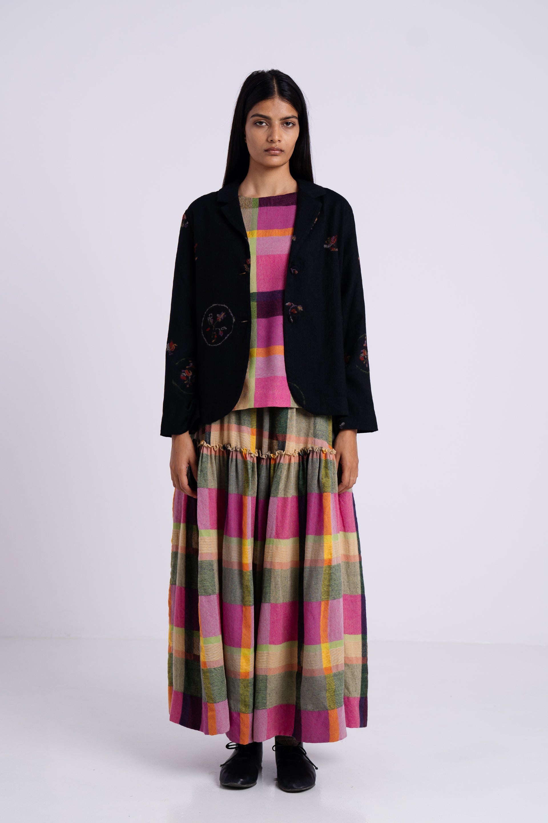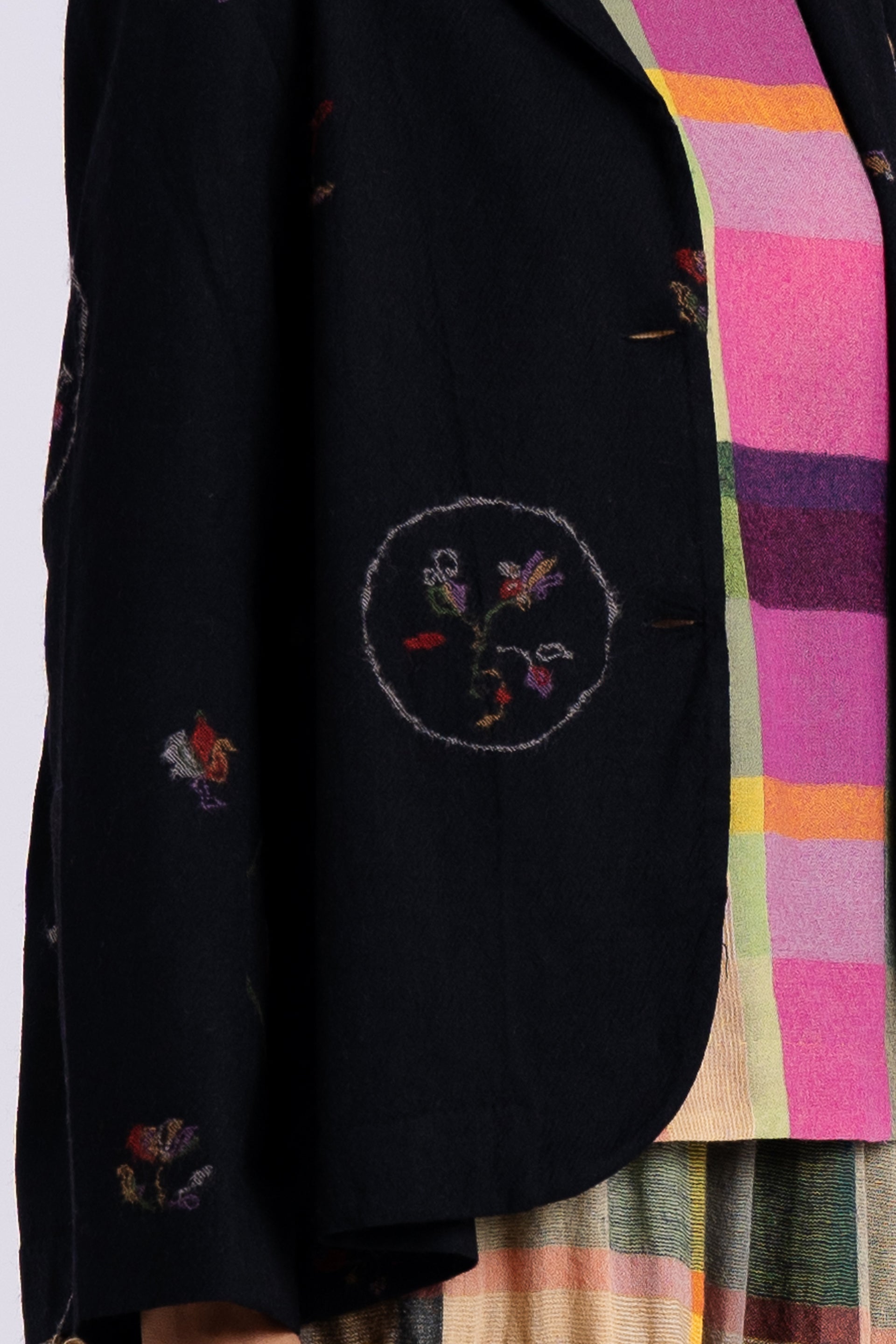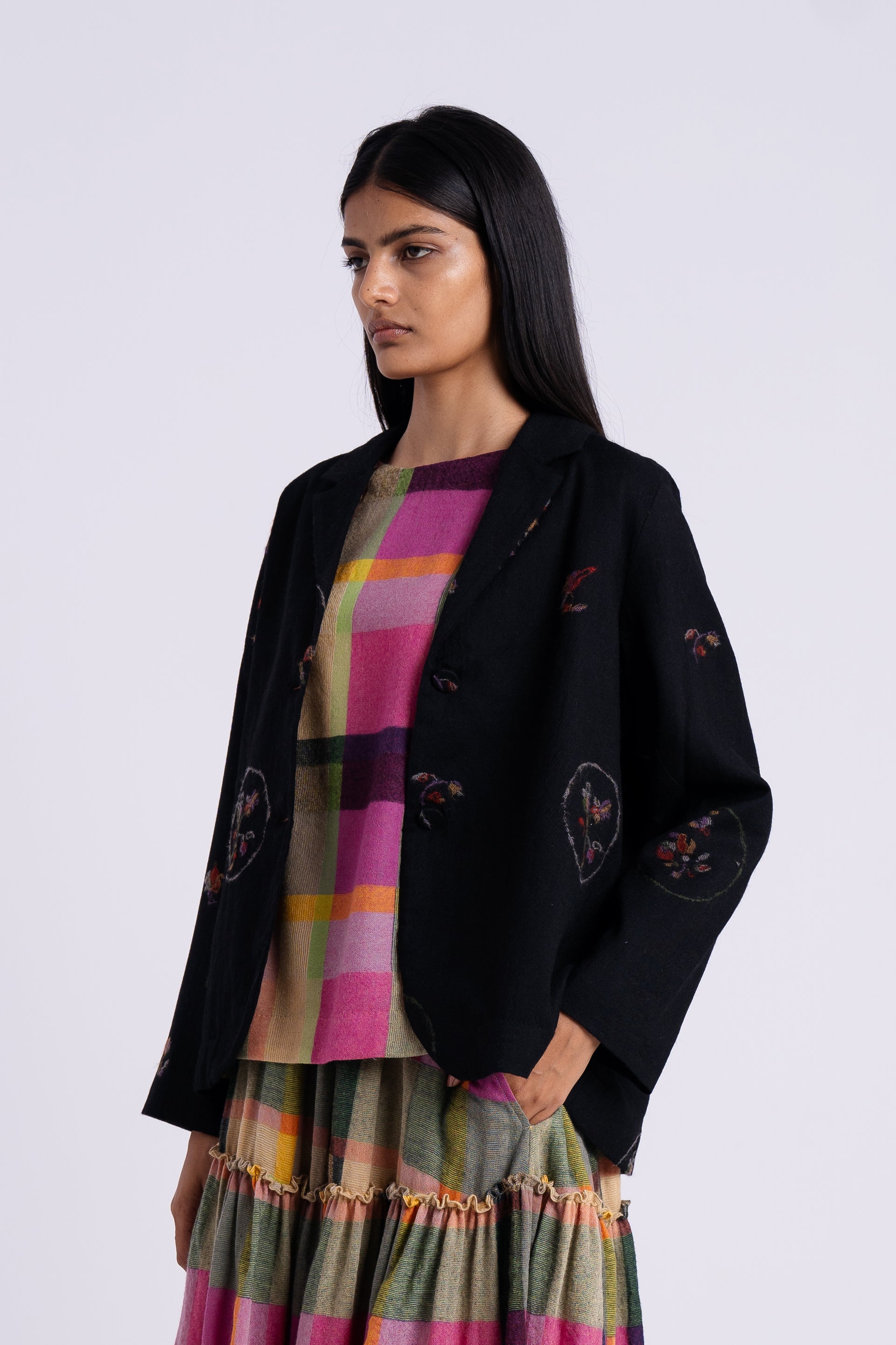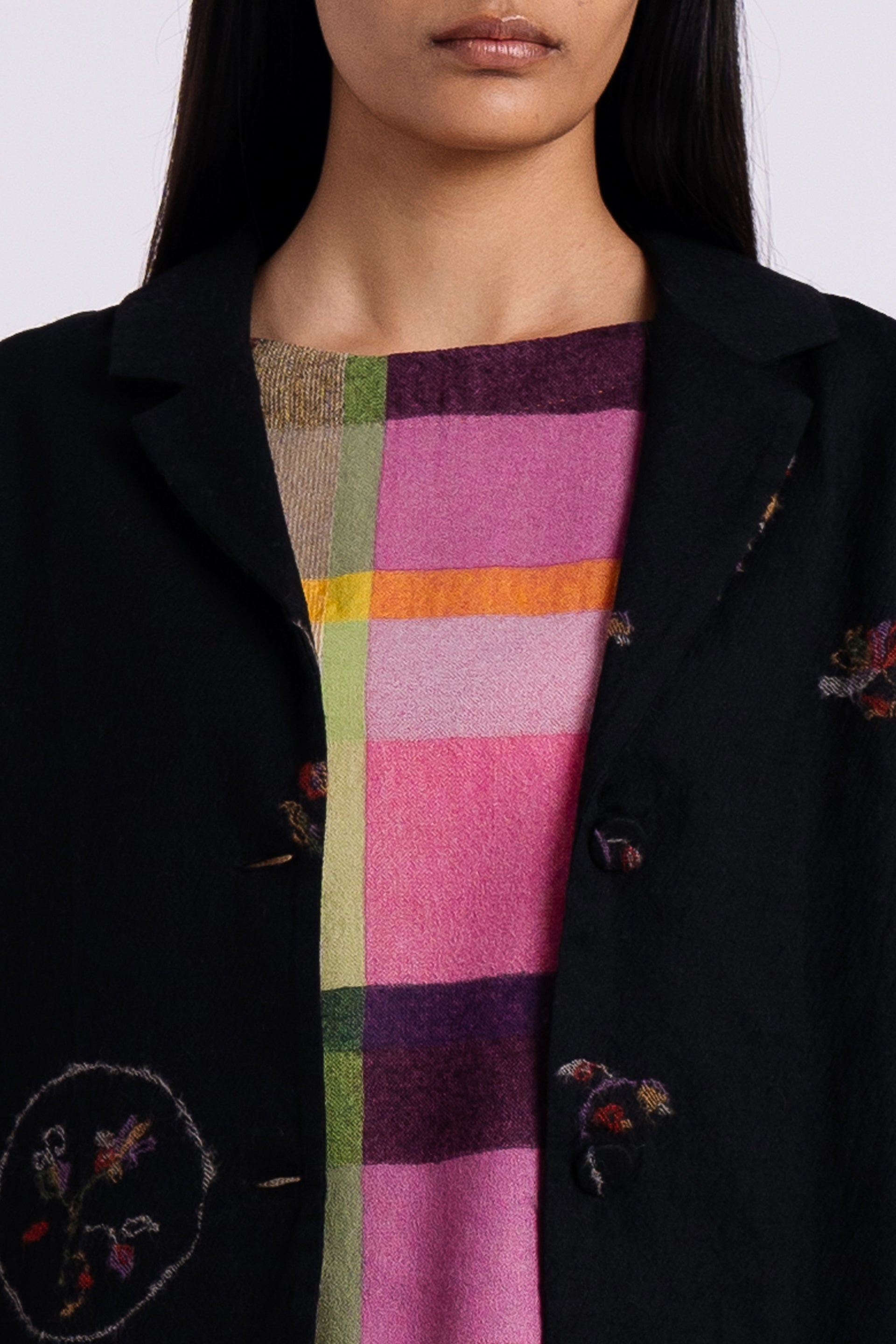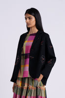 Notch collar straight fit front open short jacket with centre back pleate , basic full sleeves and curved placket detail. Constructed in placement jacquard motifs 100% merino wool. Finished with attached contrast collage handblock print lining detail.