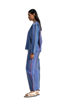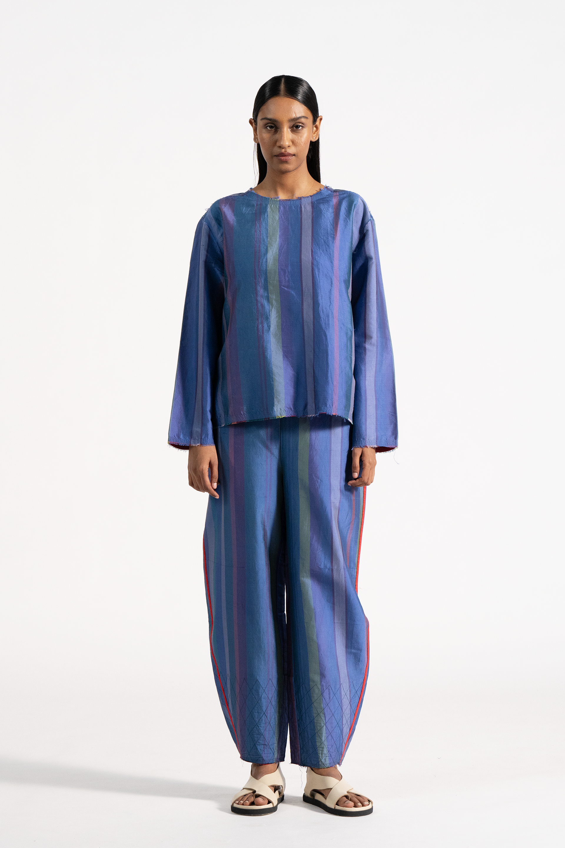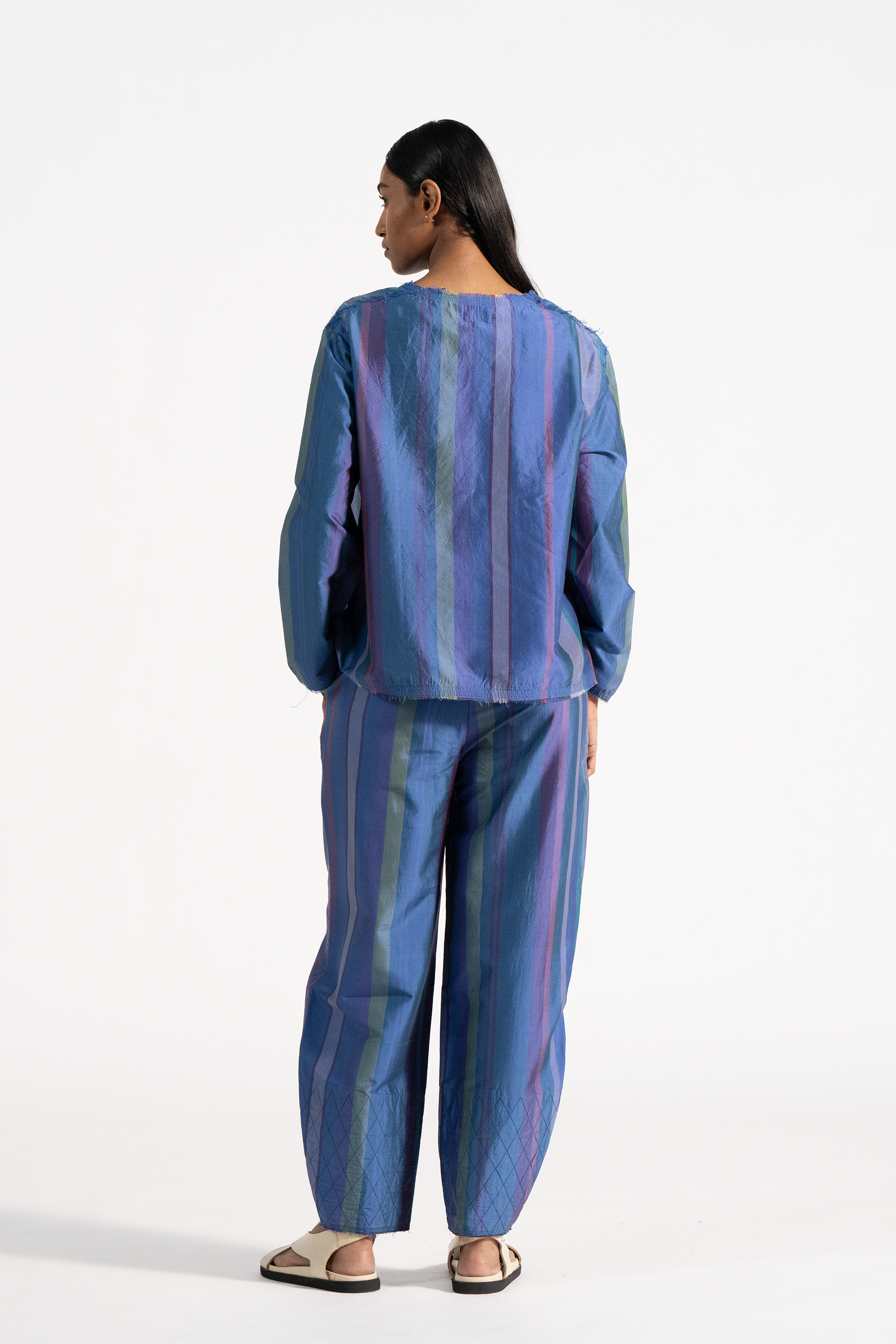 Relaxed Fit Round Neck Top With Raw Edges In Tonal Self Striper 100% Silk