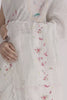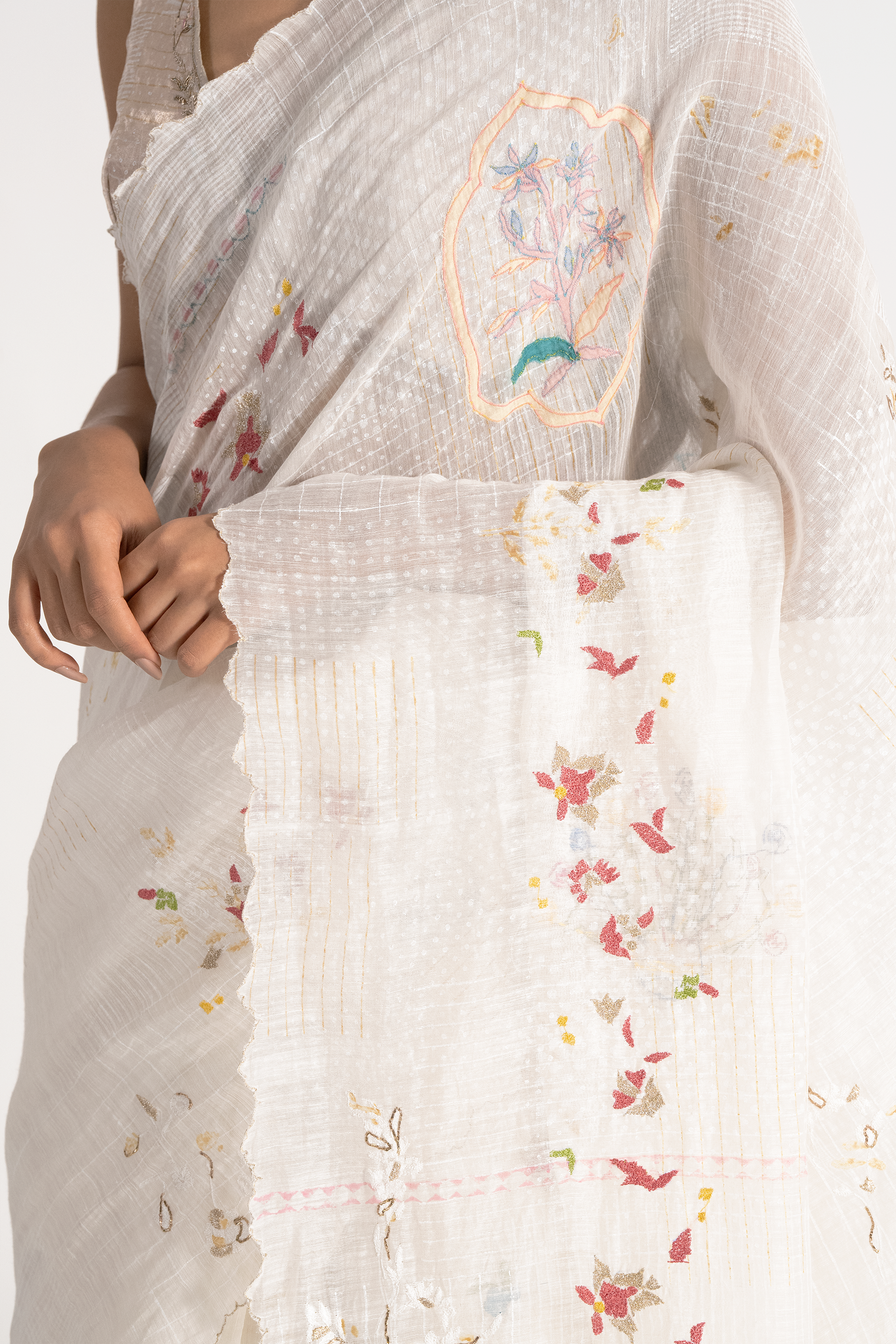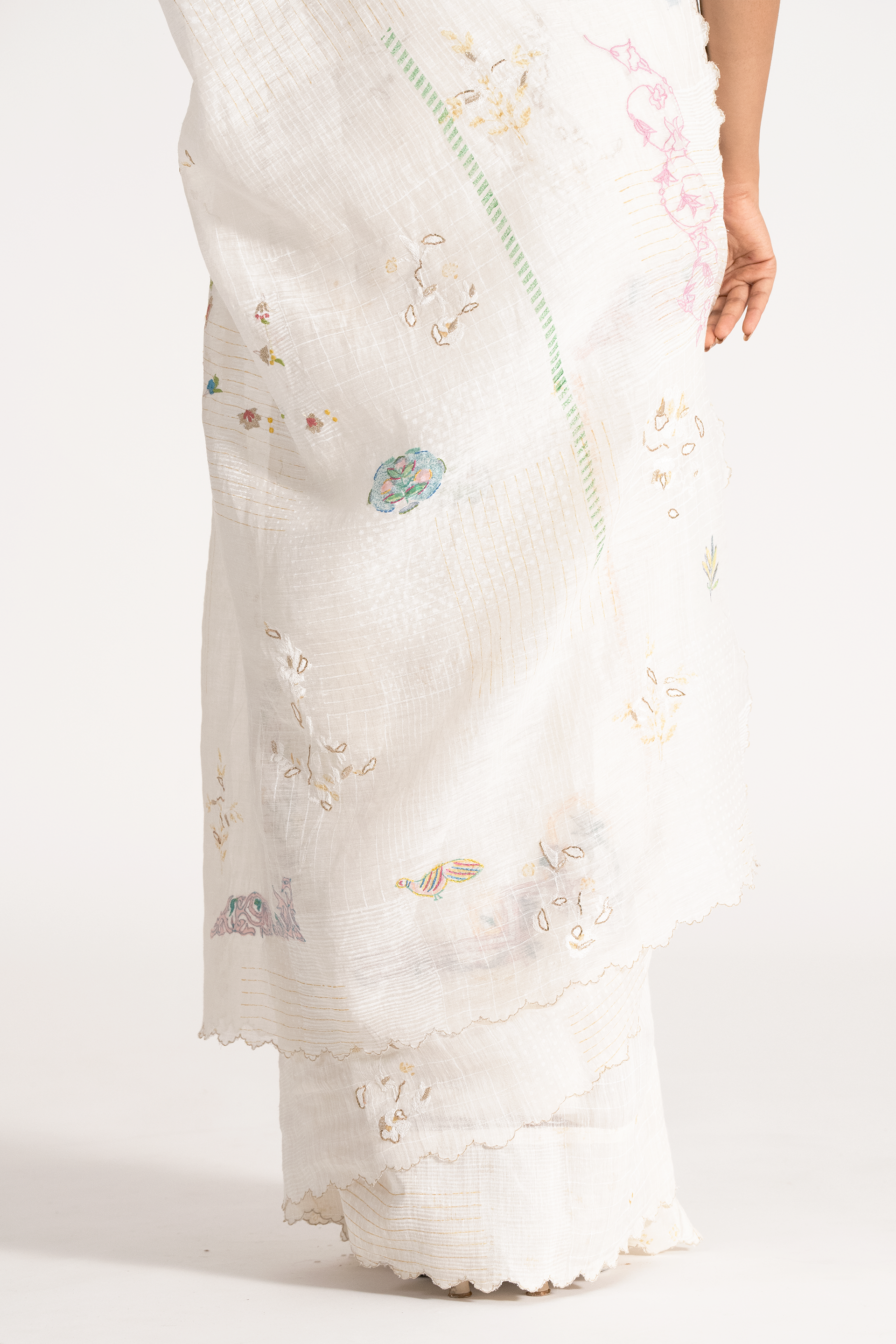 Handblock Stripe Printed Saree In With Floral Embroidered Details And Scalloped Border.