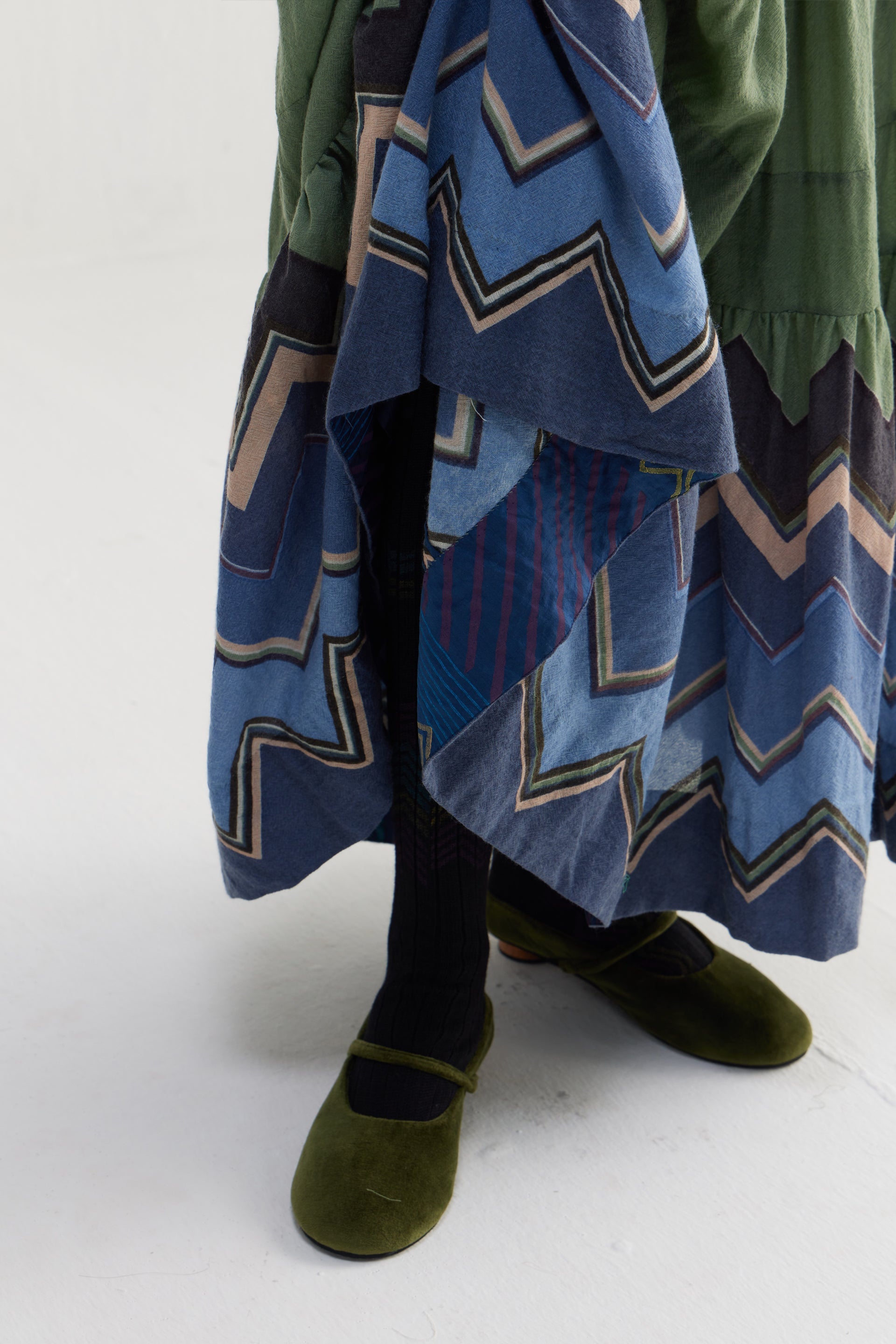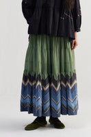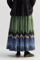 High waist tier with fine gathers maxi skirt with pintucks detail and side pockets. Constructed in multicolor chevron border print in 100% merino wool fabric. Finished with attached solid 100% silk lining.