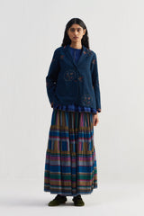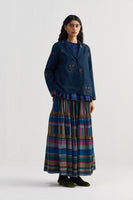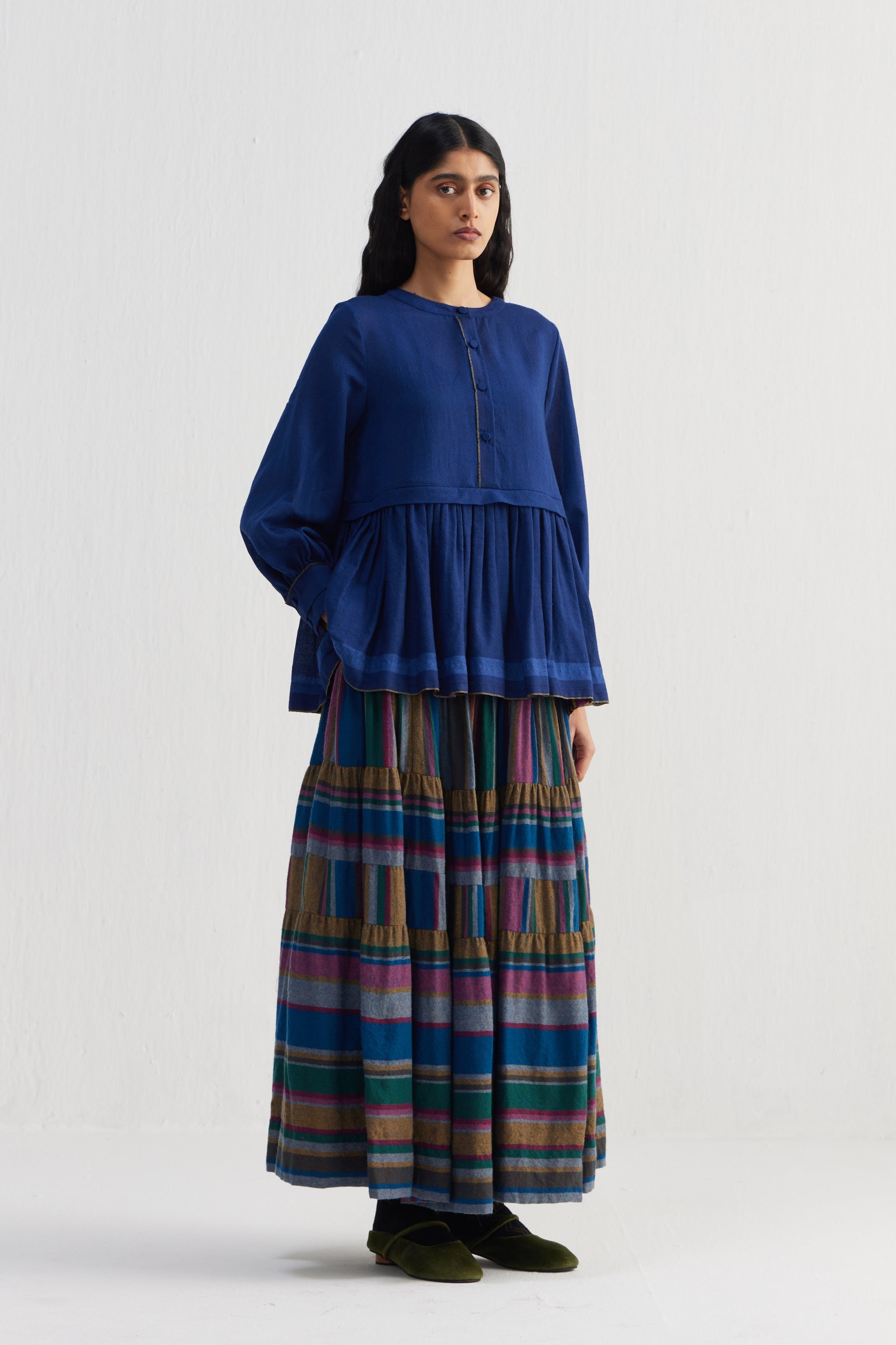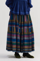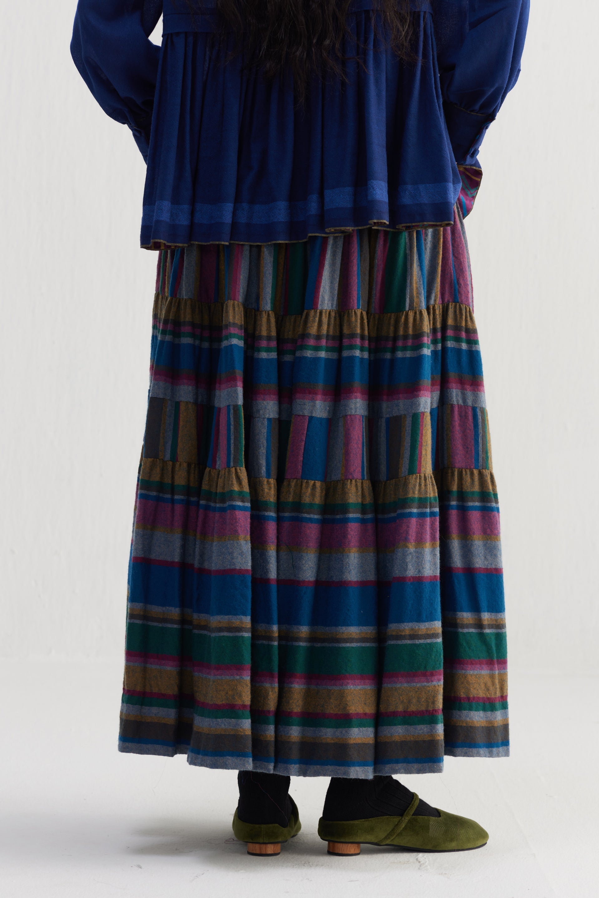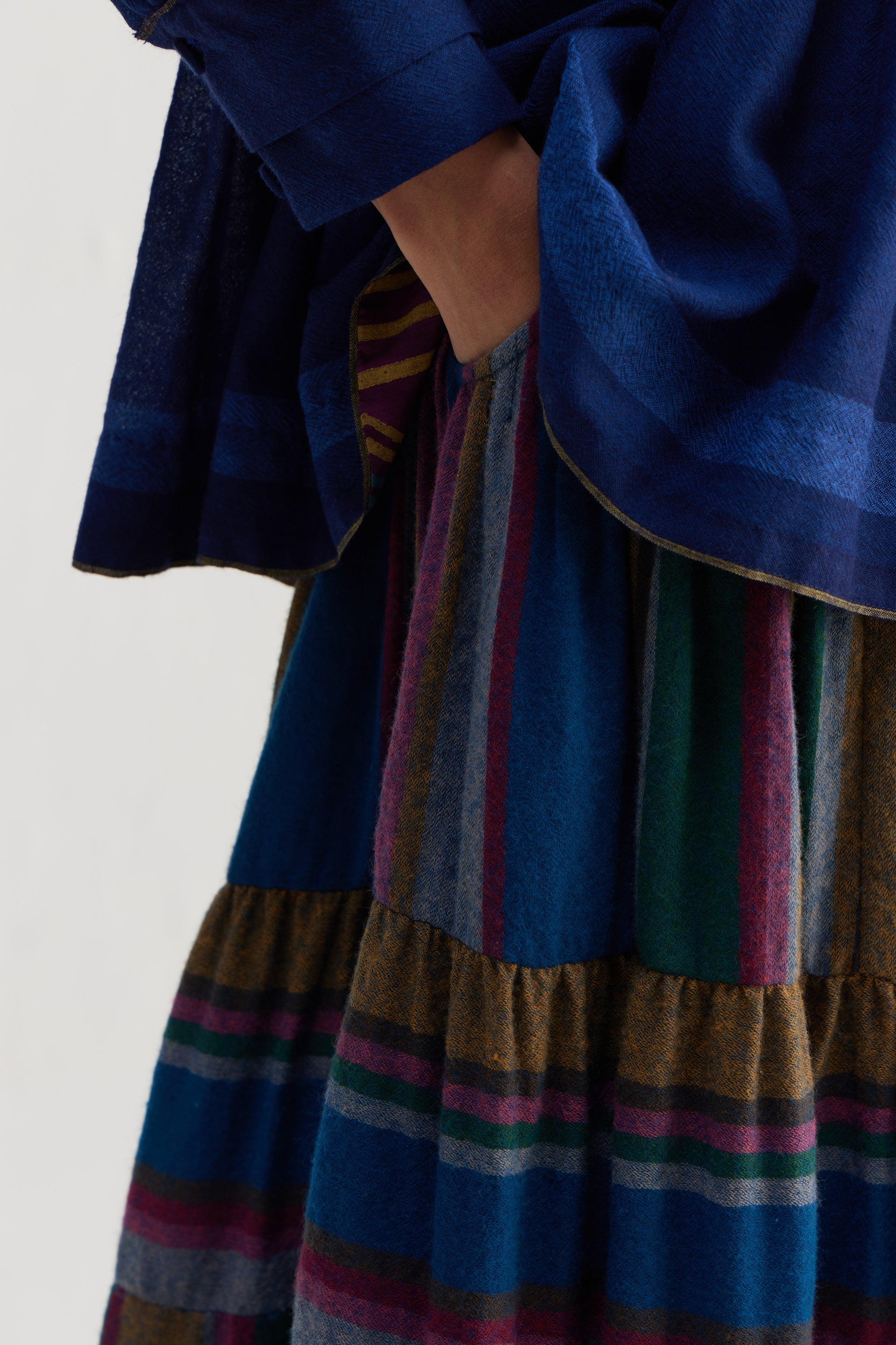 High waist tier with fine gathers maxi skirt with pintucks detail and side pockets. Constructed in thick and thin multicolor striper 100% merino wool fabric. Finished with solid 100% silk lining.