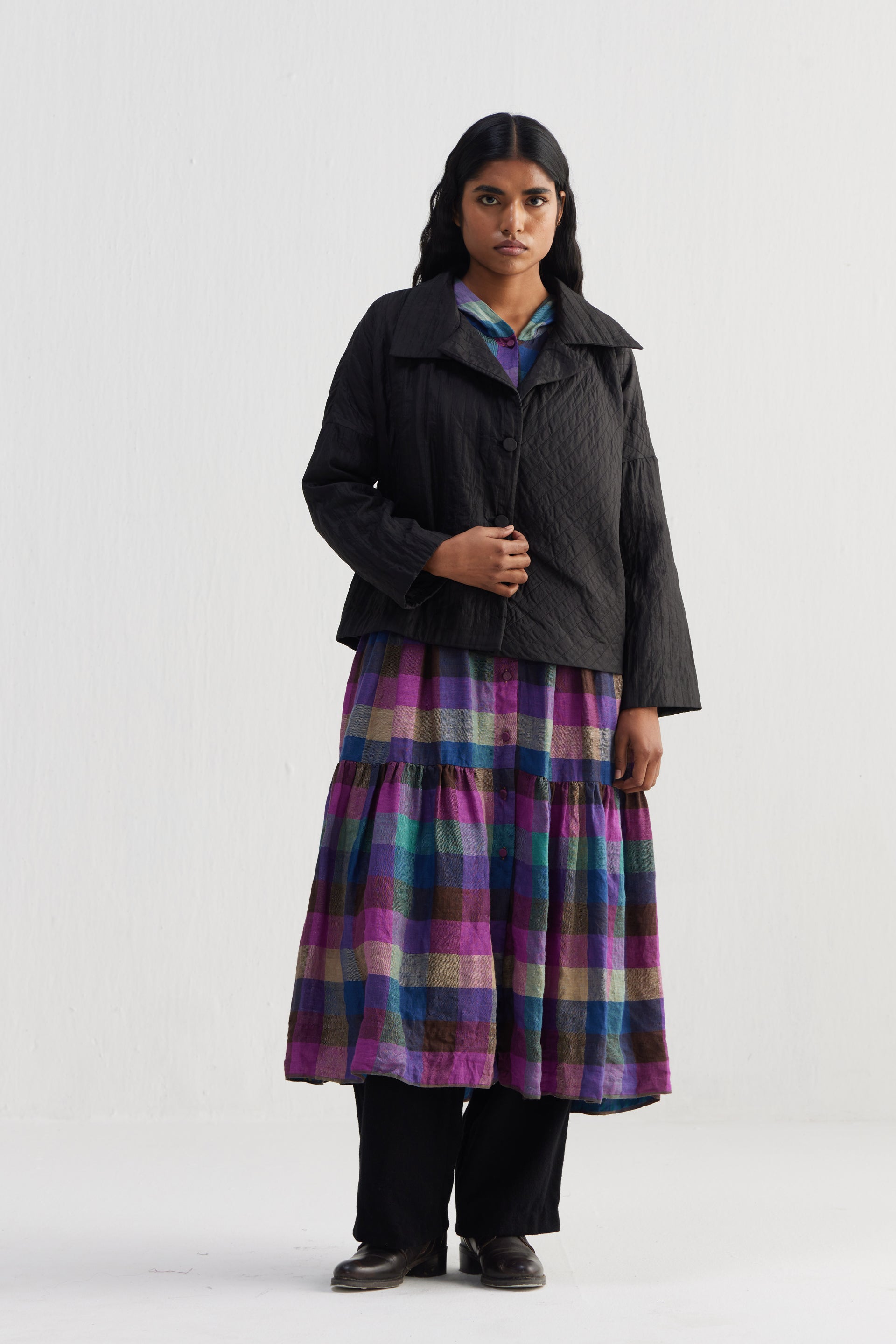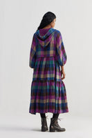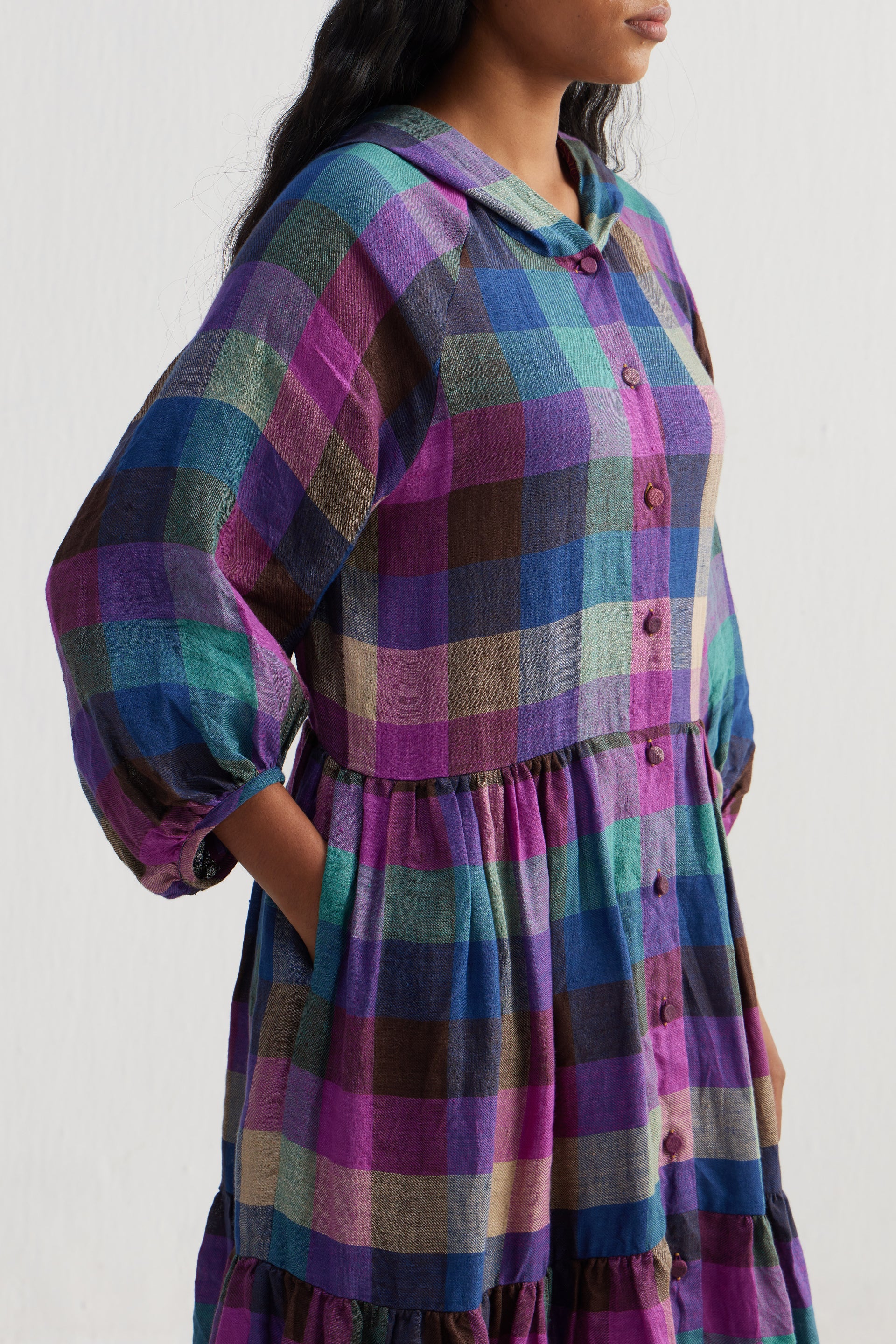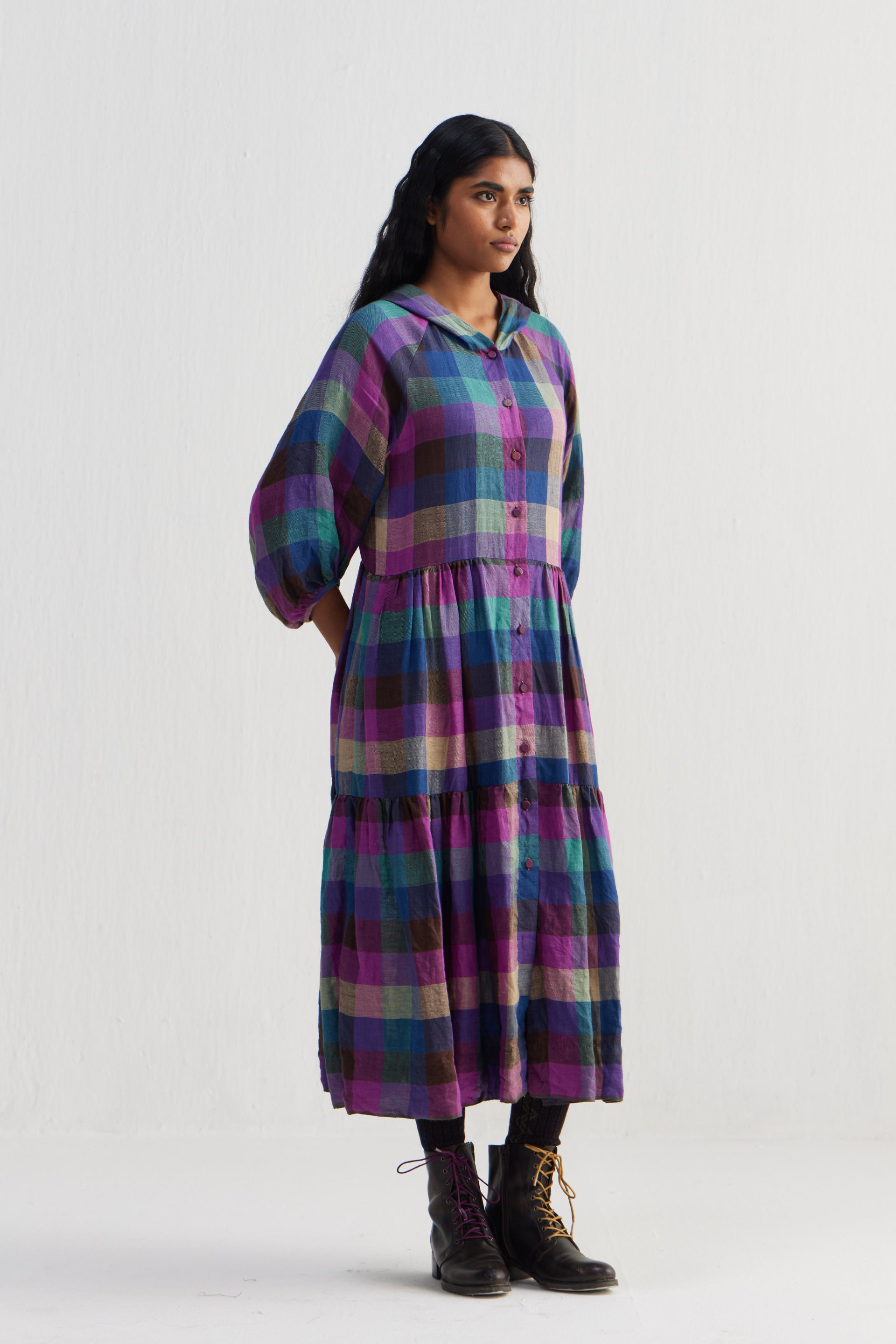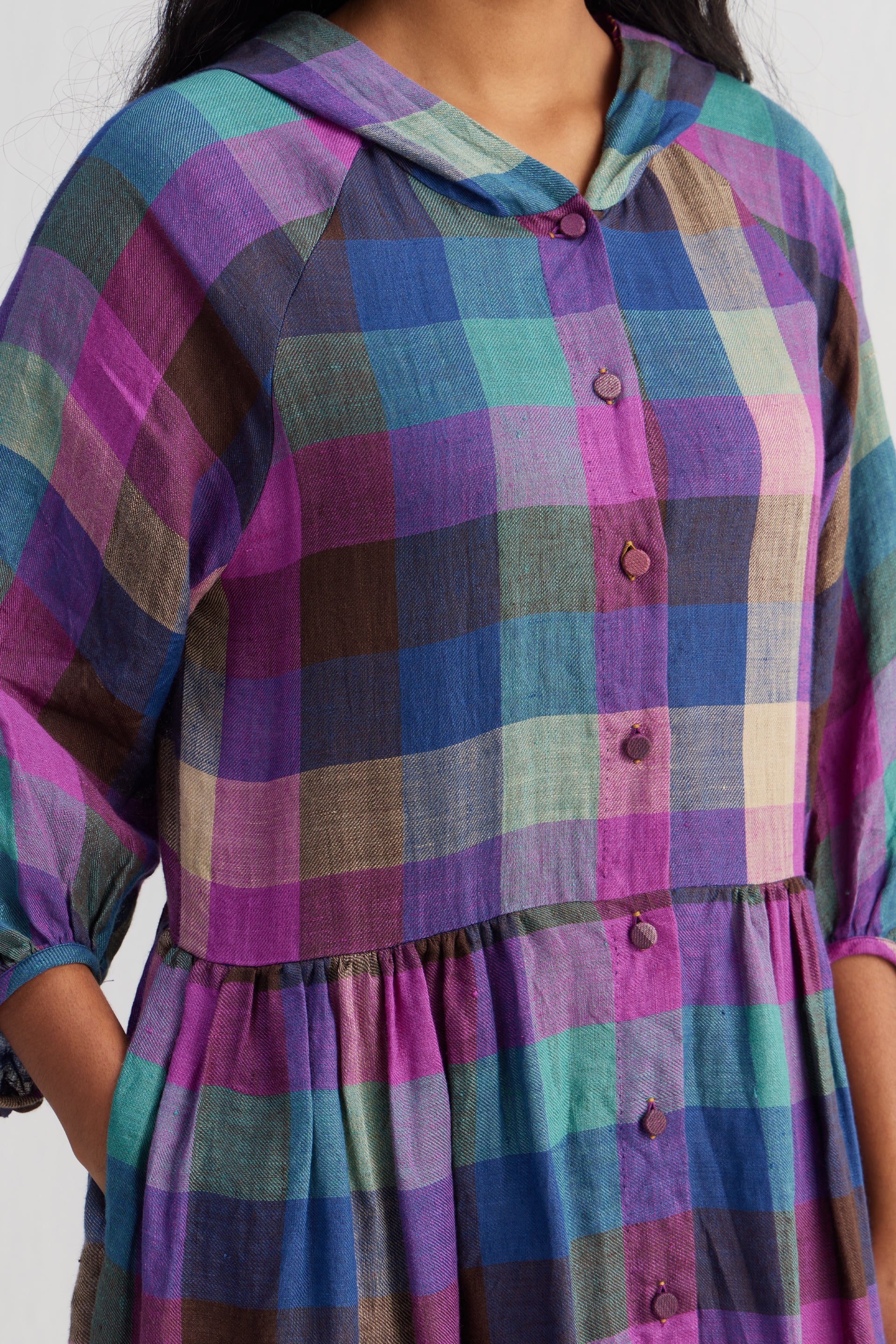 Round neckline buttondown front open midi tier dress with hoodie and full sleeves. Constructed in checkered 100% linen. Finished with collage handblock print 100% silk fabric facing detail.