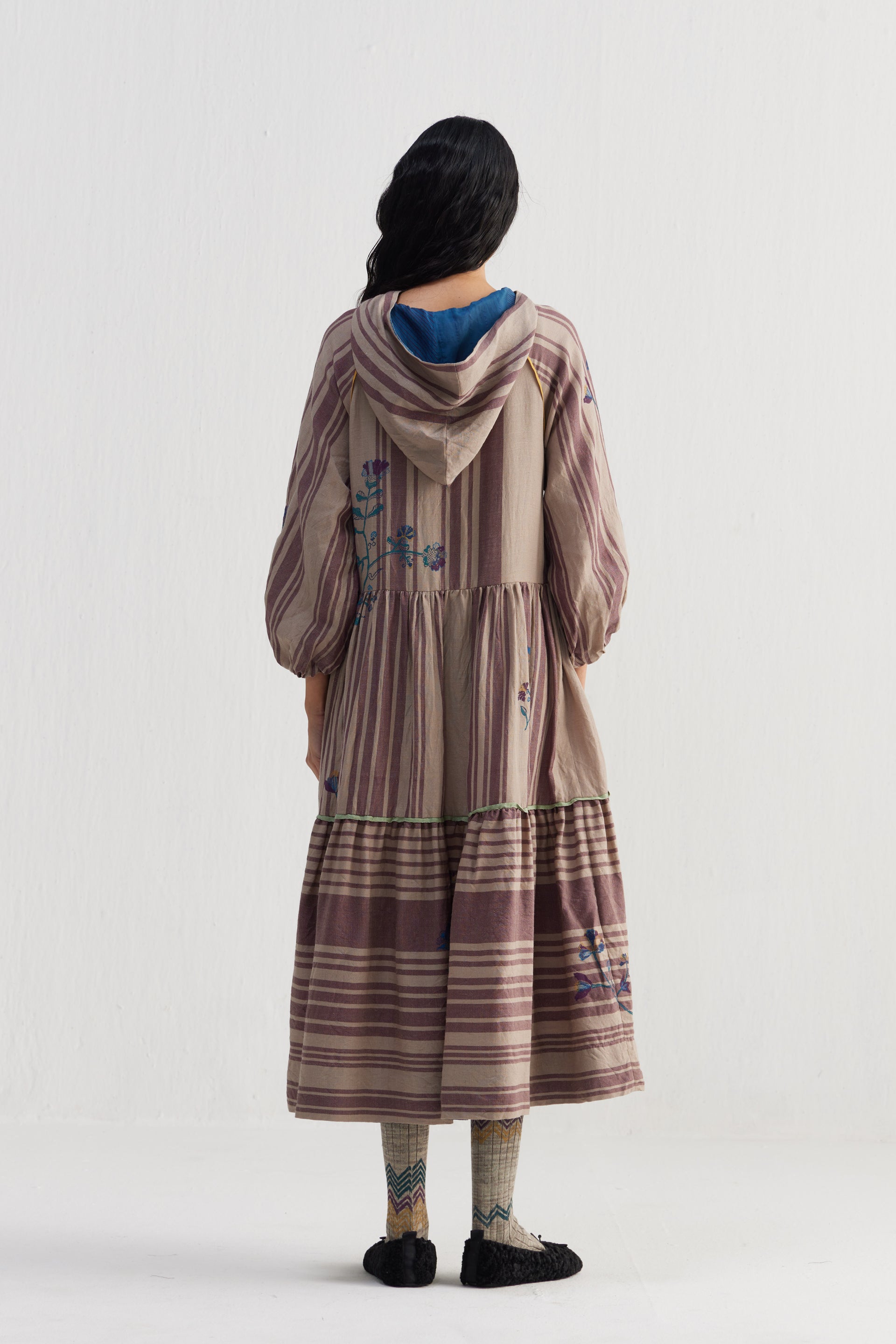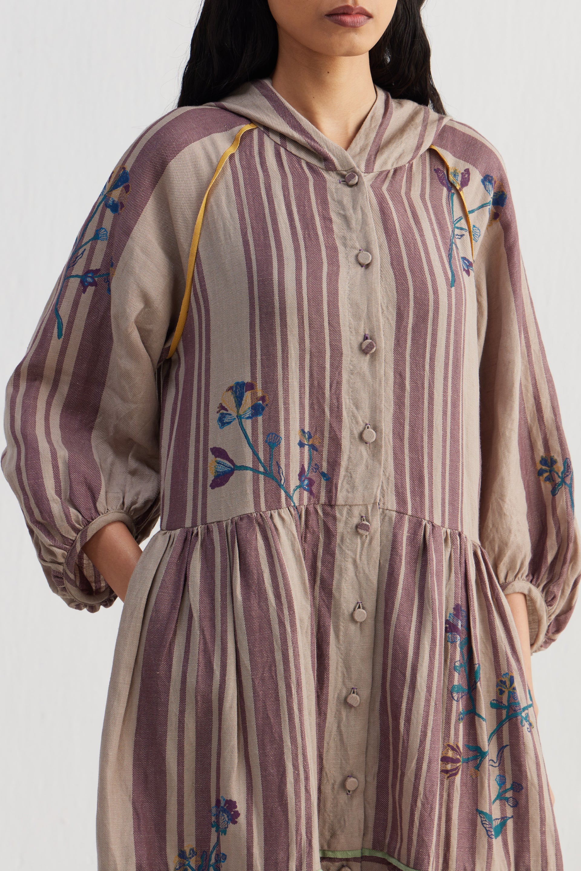 Front open button down maxi dress with hoodie and 3/4 puff sleeves. Constructed in thick and thin striper wool linen fabric with contemporary floral placement print and hand embroidery detail of wool threads. Finished with contrast selvedge detail inserts in seams, collage handblock print facing on hem and lining inside the hoodie.