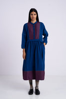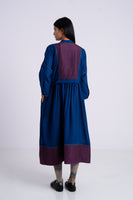 Round neckline front open buttondown full sleeves midi dress with gathers on waist and quilted silk patch at hem and yoke.Constructed in solid 100% merino wool. Finished with contrast handblock print piping detail and collage handblock print 100% silk fabric facing detail.