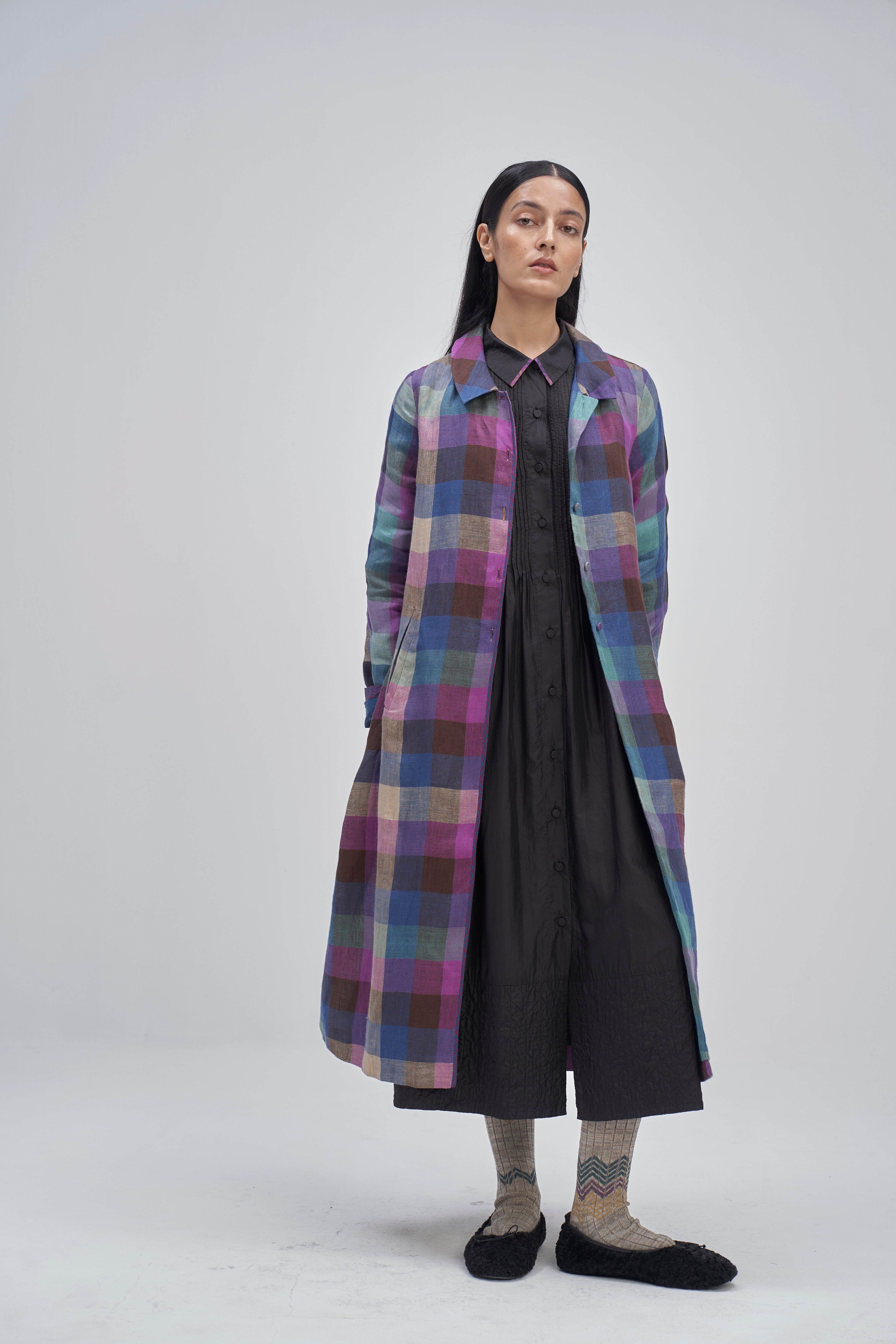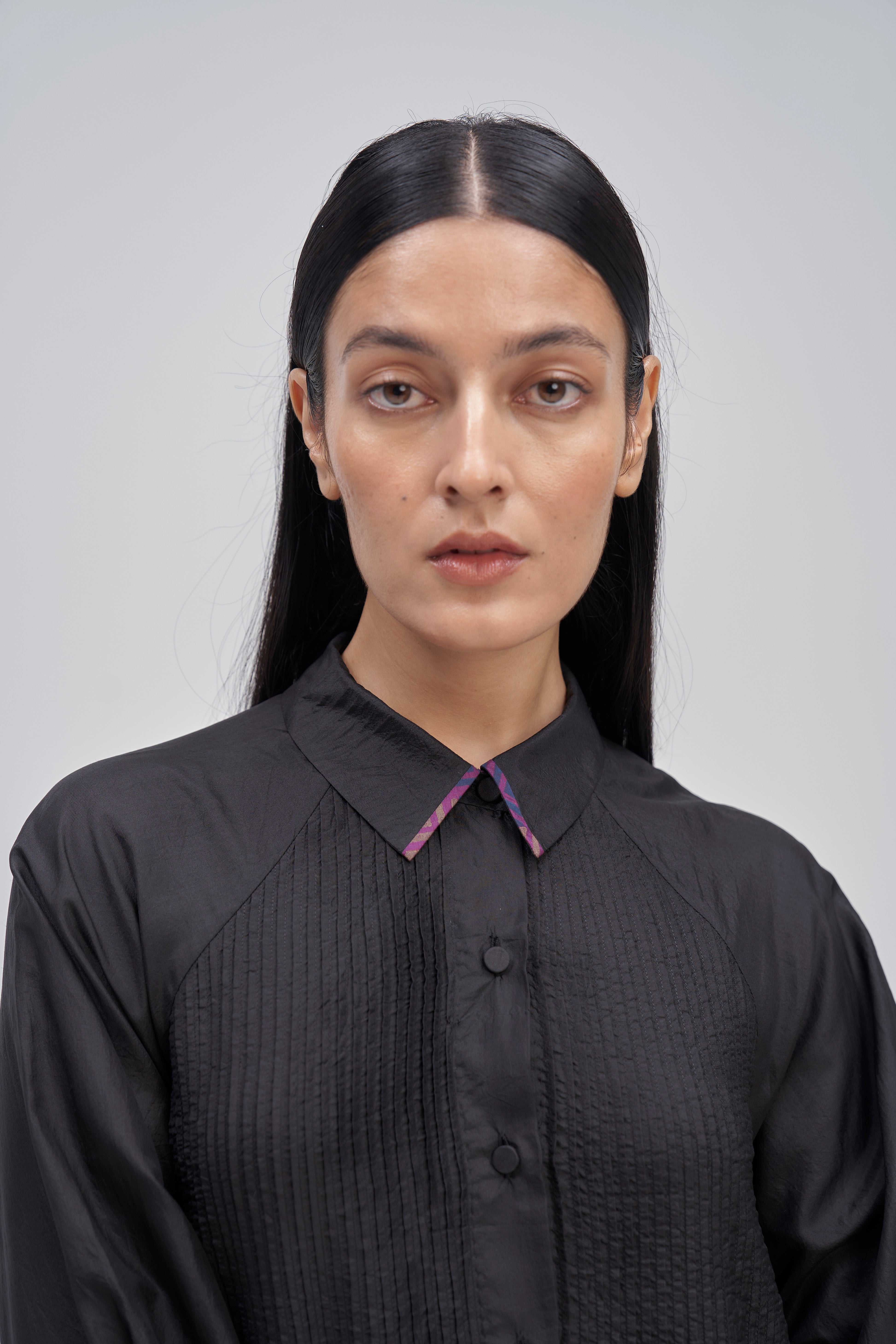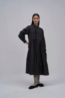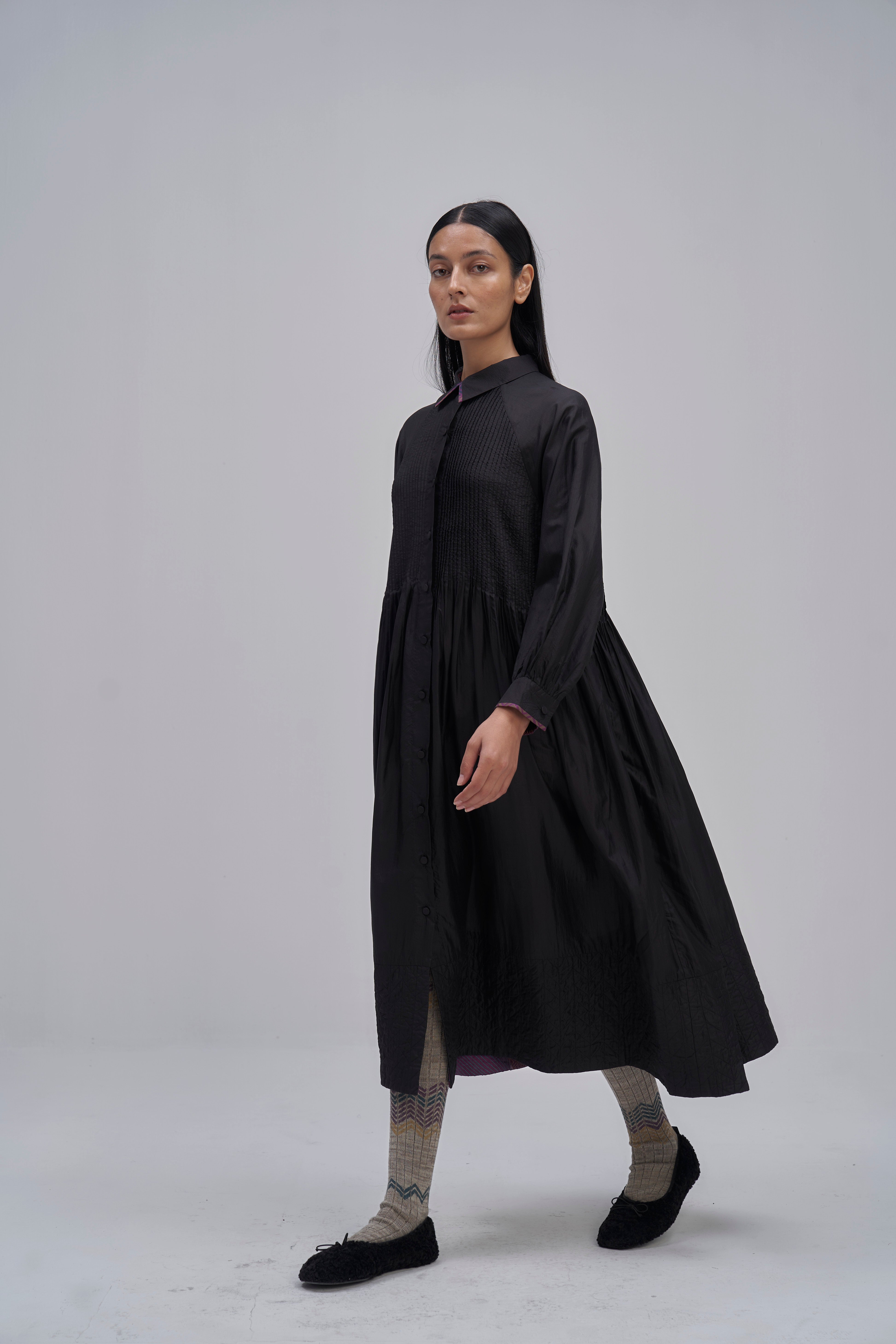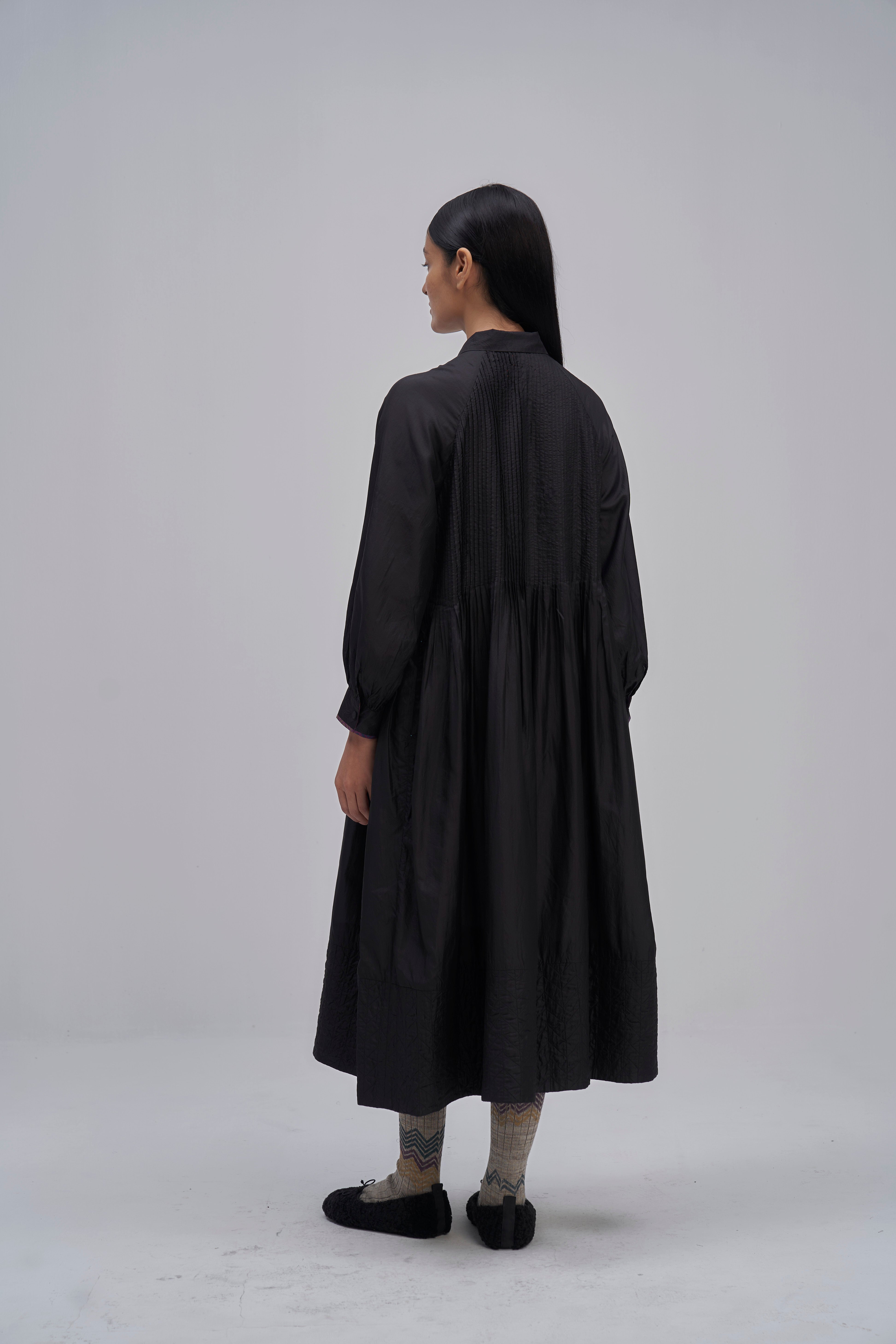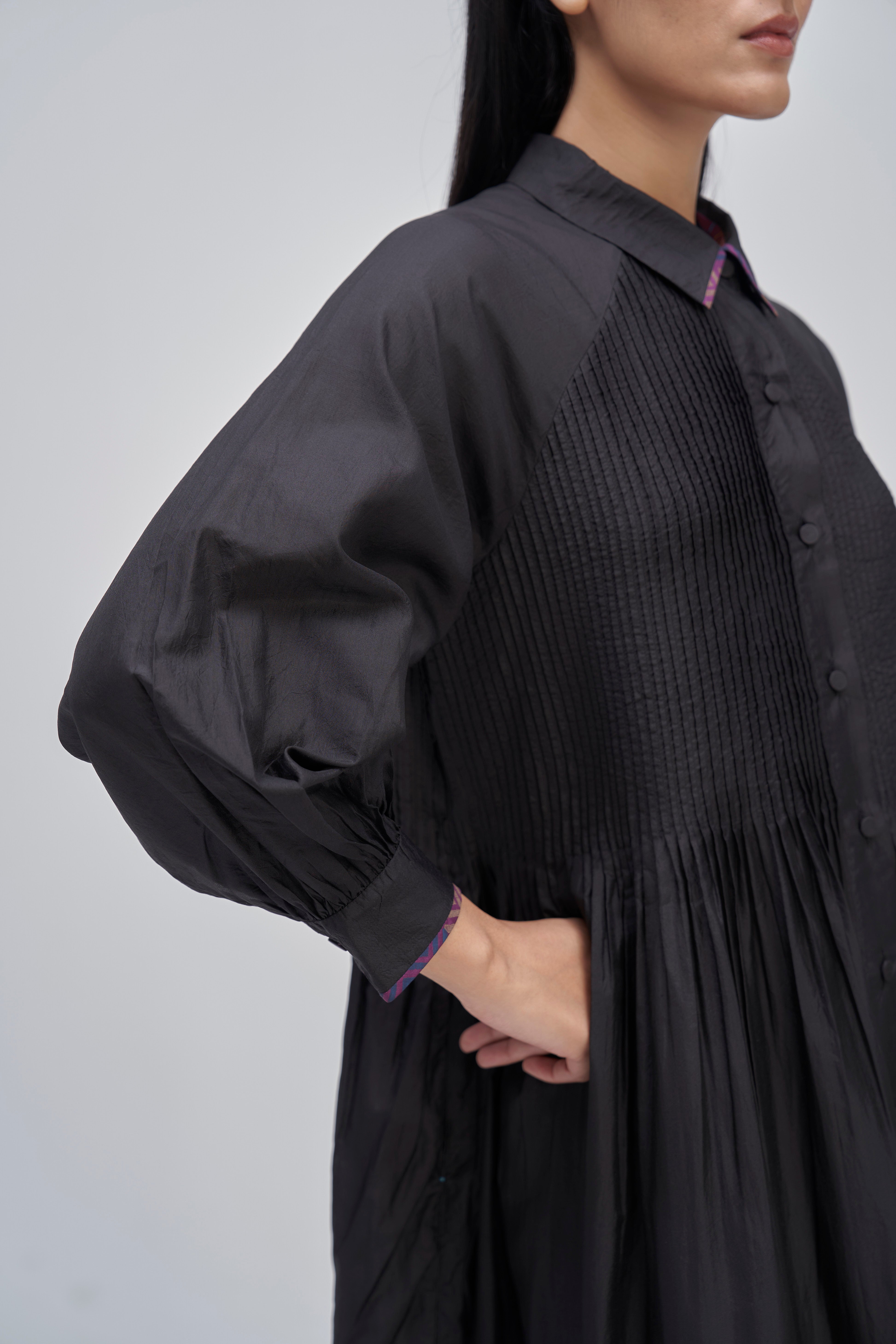 Relaxed fit front open button down collar midi dress with full puff sleeves, pintucks allover the bodice and quilting detail on hem. Constructed in solid 100% silk fabric. Finished with contrast hand block print 100% silk fabric piping and facing detail.