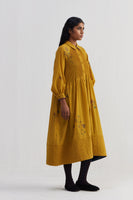 Relaxed fit front open button down collar midi dress with full puff raglan sleeves, pin tucks allover the bodice and quilting detail on hem. Constructed in solid 100% merino wool with placement handblock print. Finished with contrast handblock print 100% silk fabric piping and facing detail.