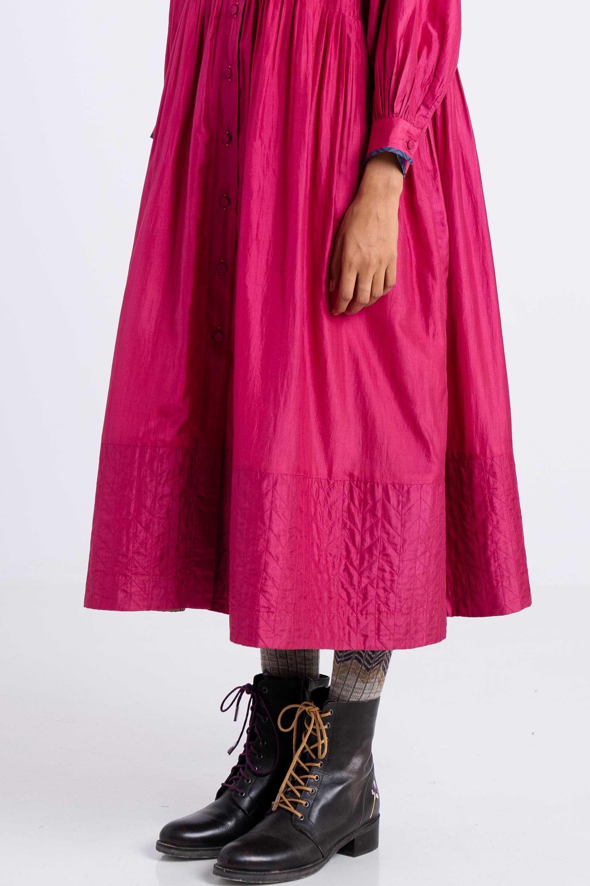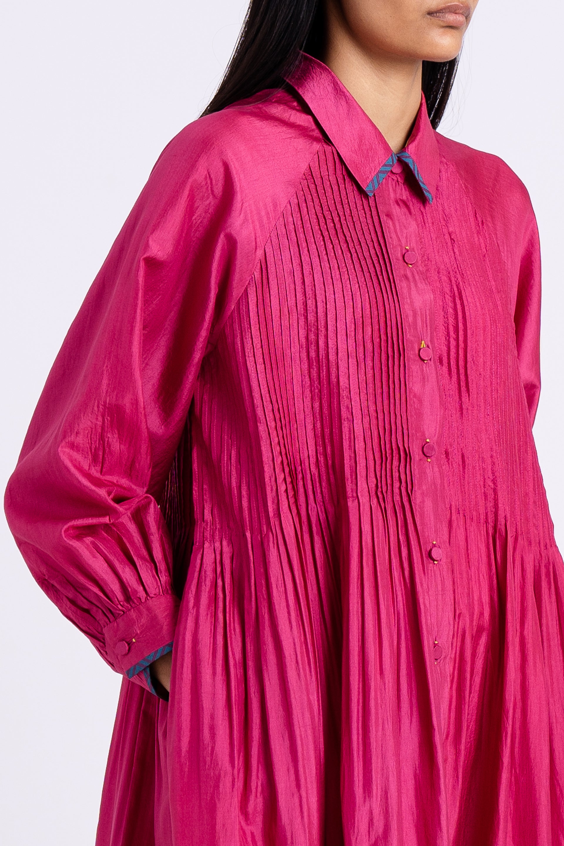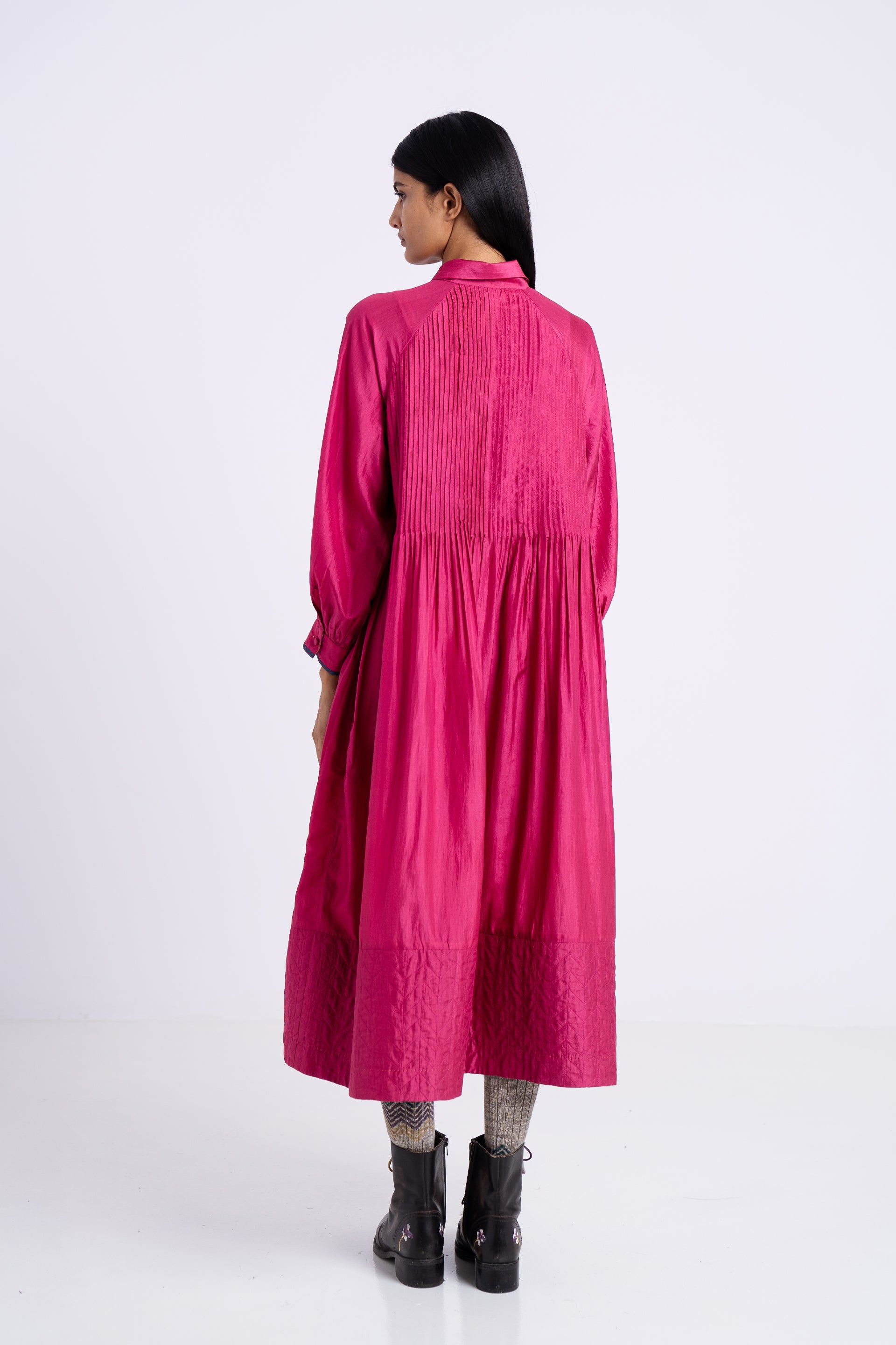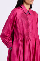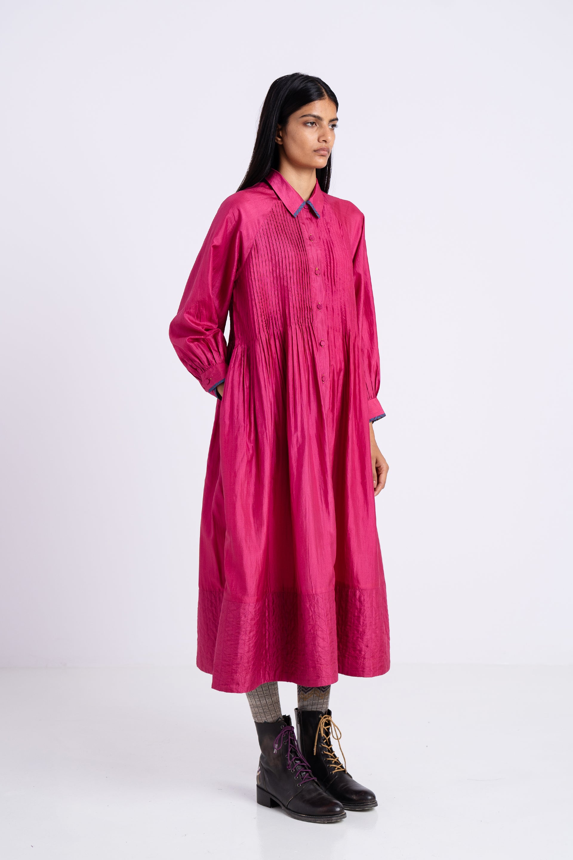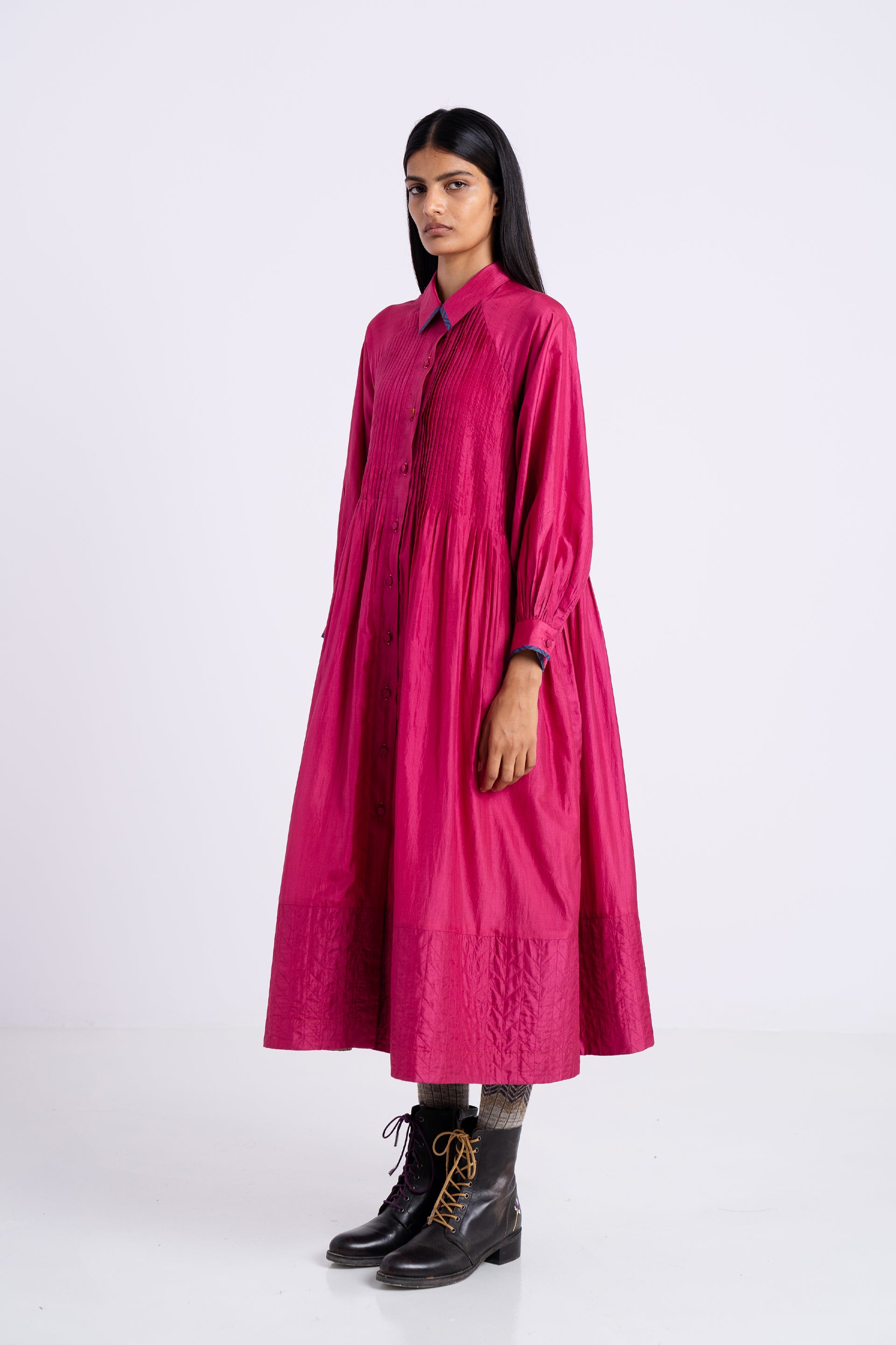 Relaxed fit front open button down collar midi dress with full puff raglan sleeves, pintucks allover the bodice and quilting detail on hem. Constructed in solid 100% silk. Finished with contrast handblock print 100% silk fabric piping and facing detail.