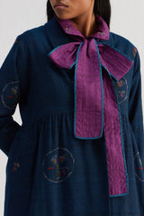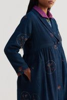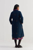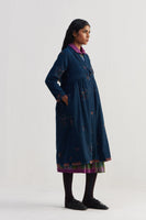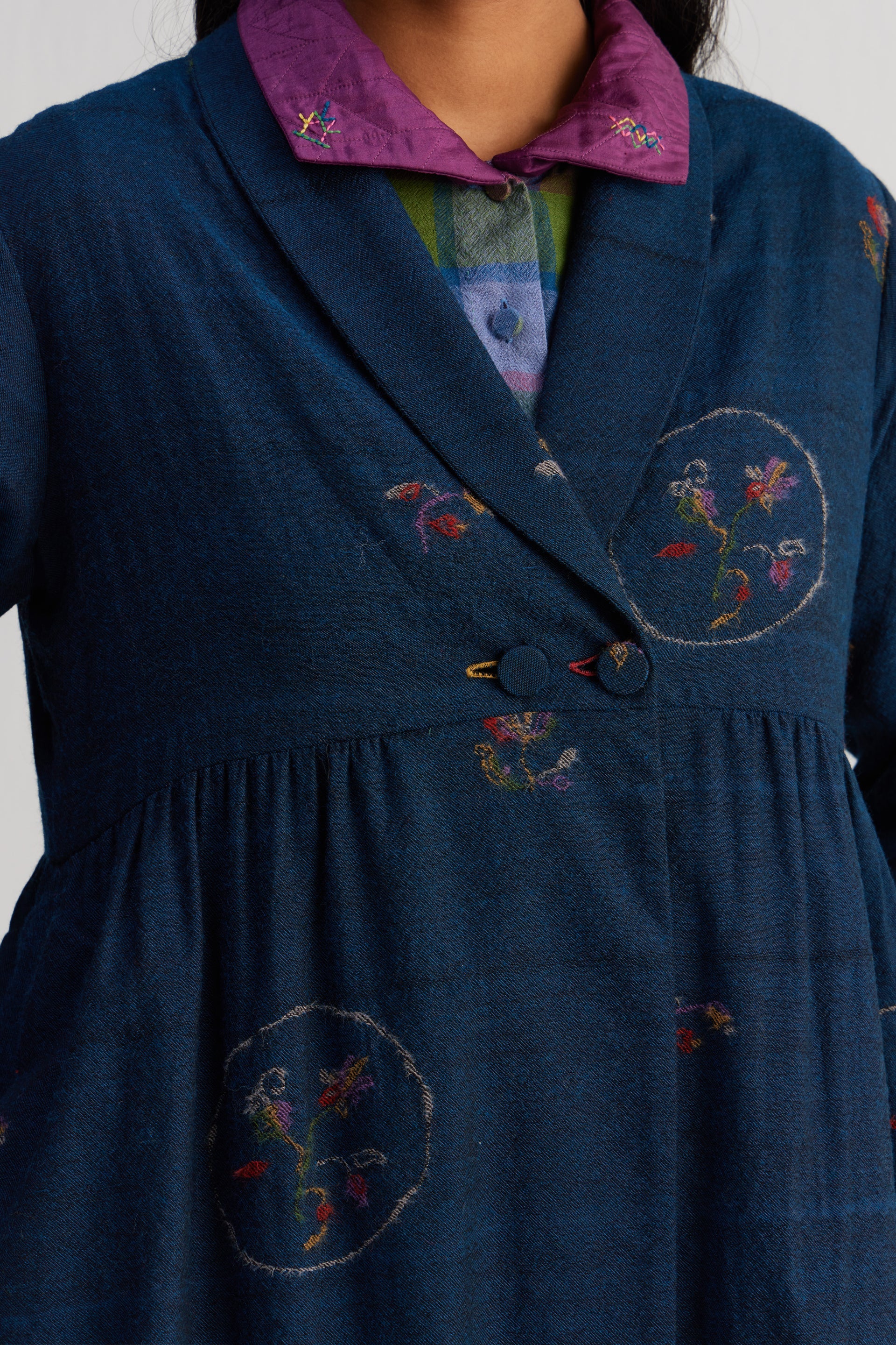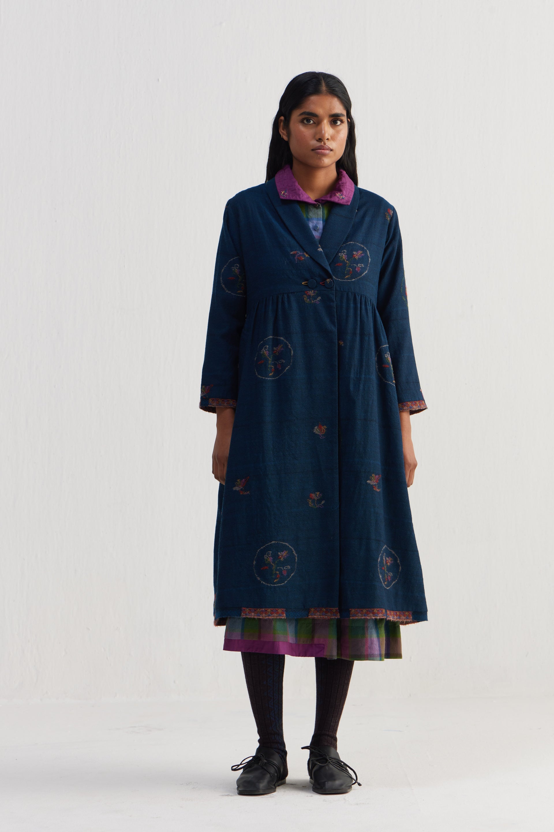 Relaxed fit shawl collar midi length full sleeves jacket with gathers on the empire seam. Constructed in contemporary floral placement motifs jacquard 100% wool fabric. Finished with and attached contrast collage handblock print 100% silk lining and selvedge detail on the hem of the sleeves.