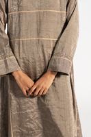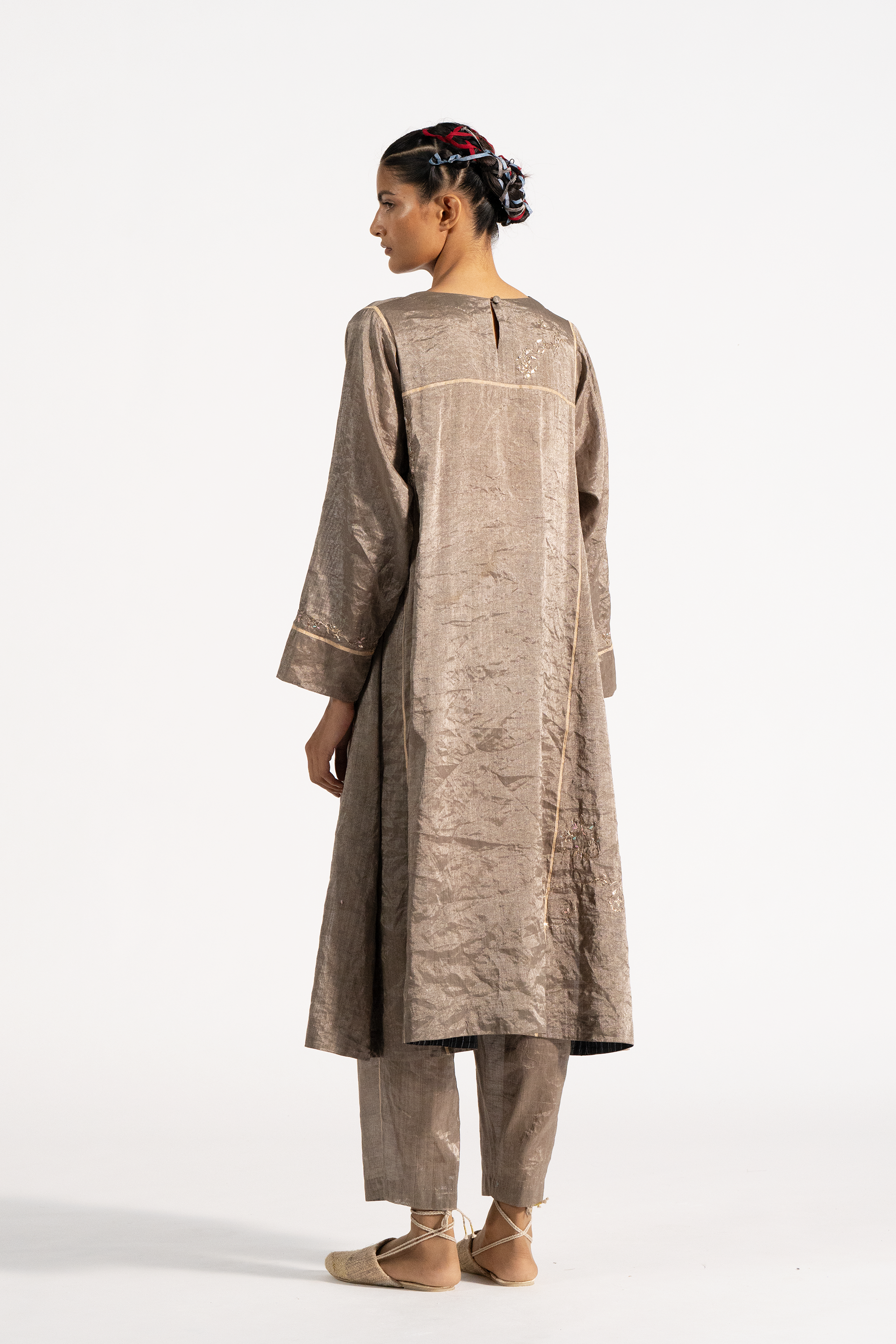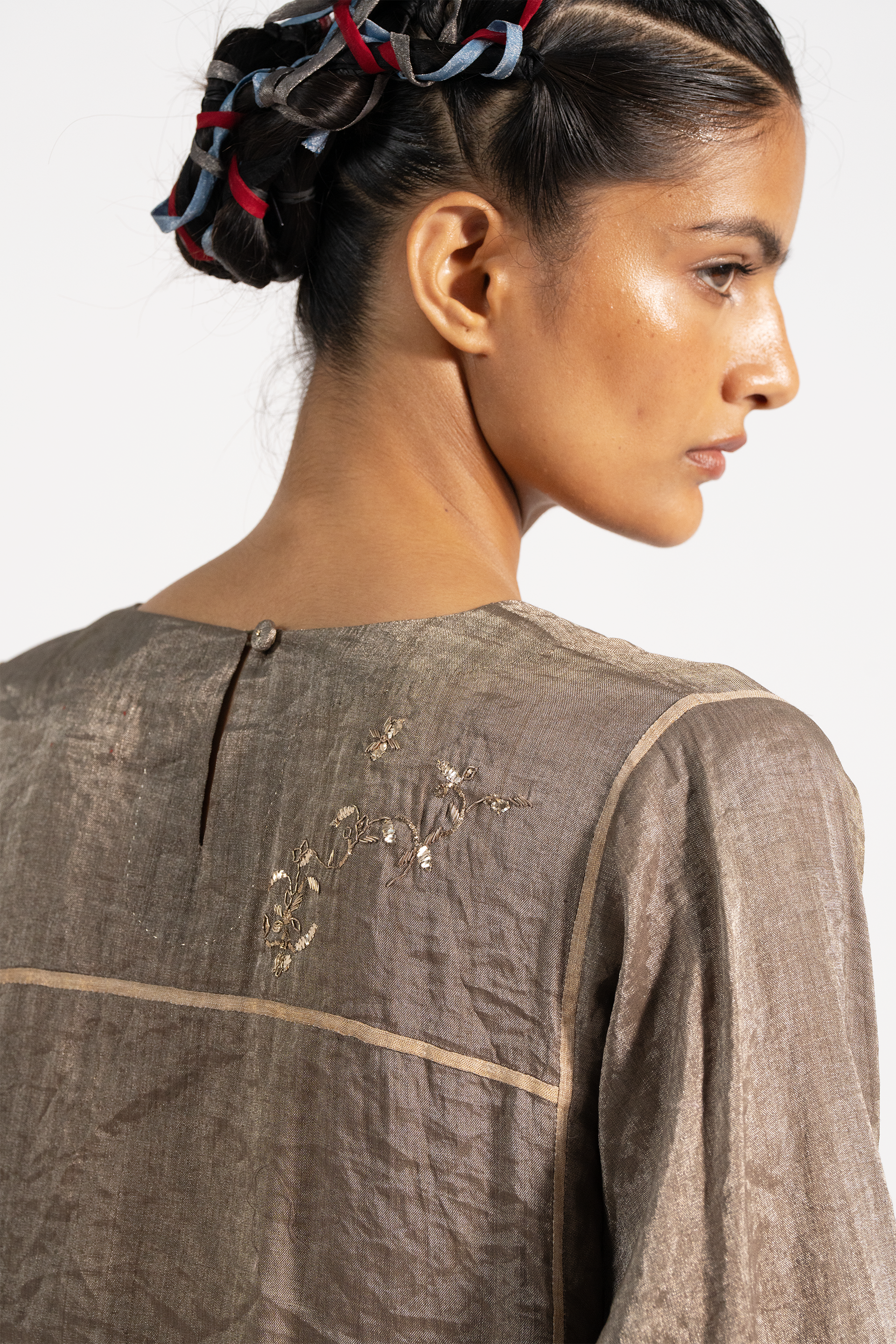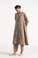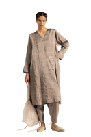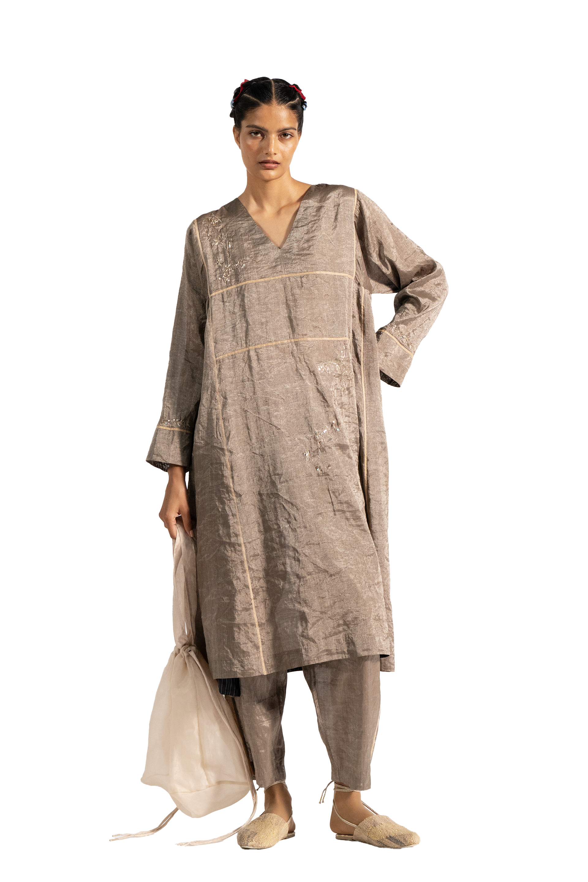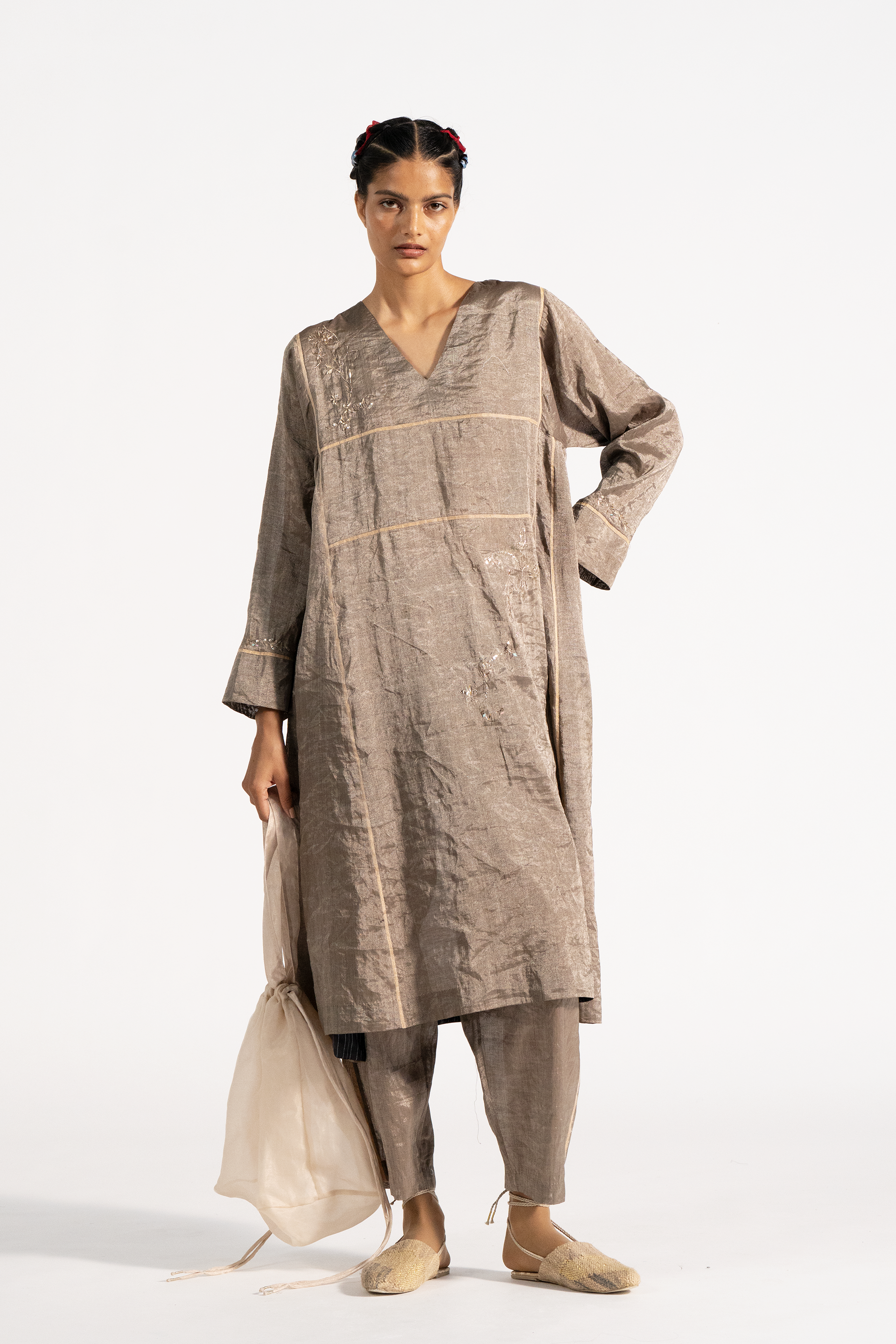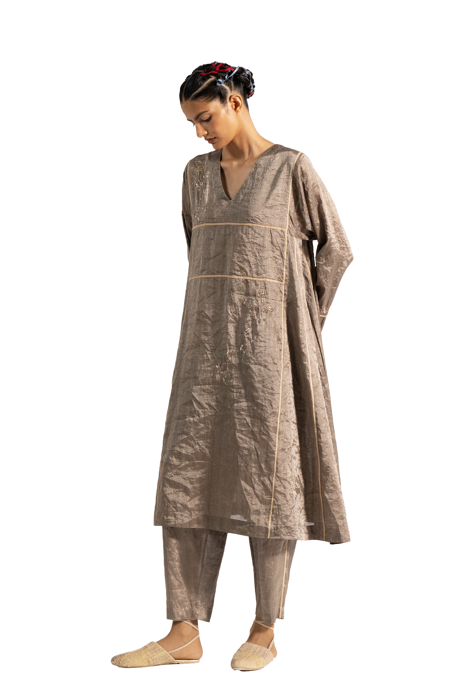Relaxed fit kurta in linen zari with side panels and embroidery. Comes with pleated poppy pants.