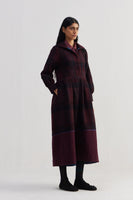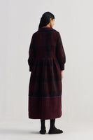 Relaxed fit front open button down collar midi dress with inverted box pleated waist and cuff on the sleeves. Constructed in checkered 100% wool fabric. Finished with collage handblock print 100% silk fabric facing detail.