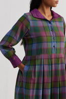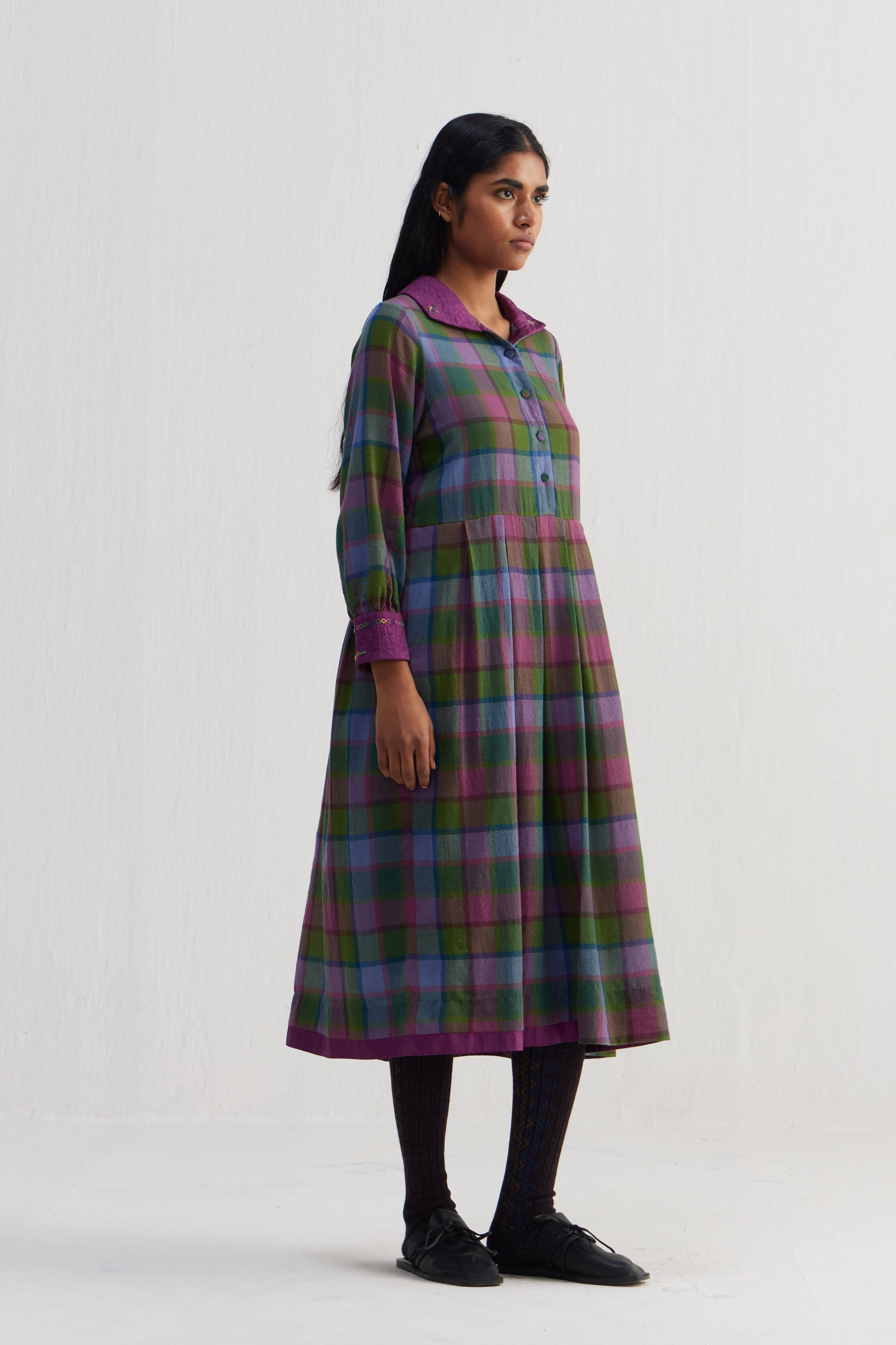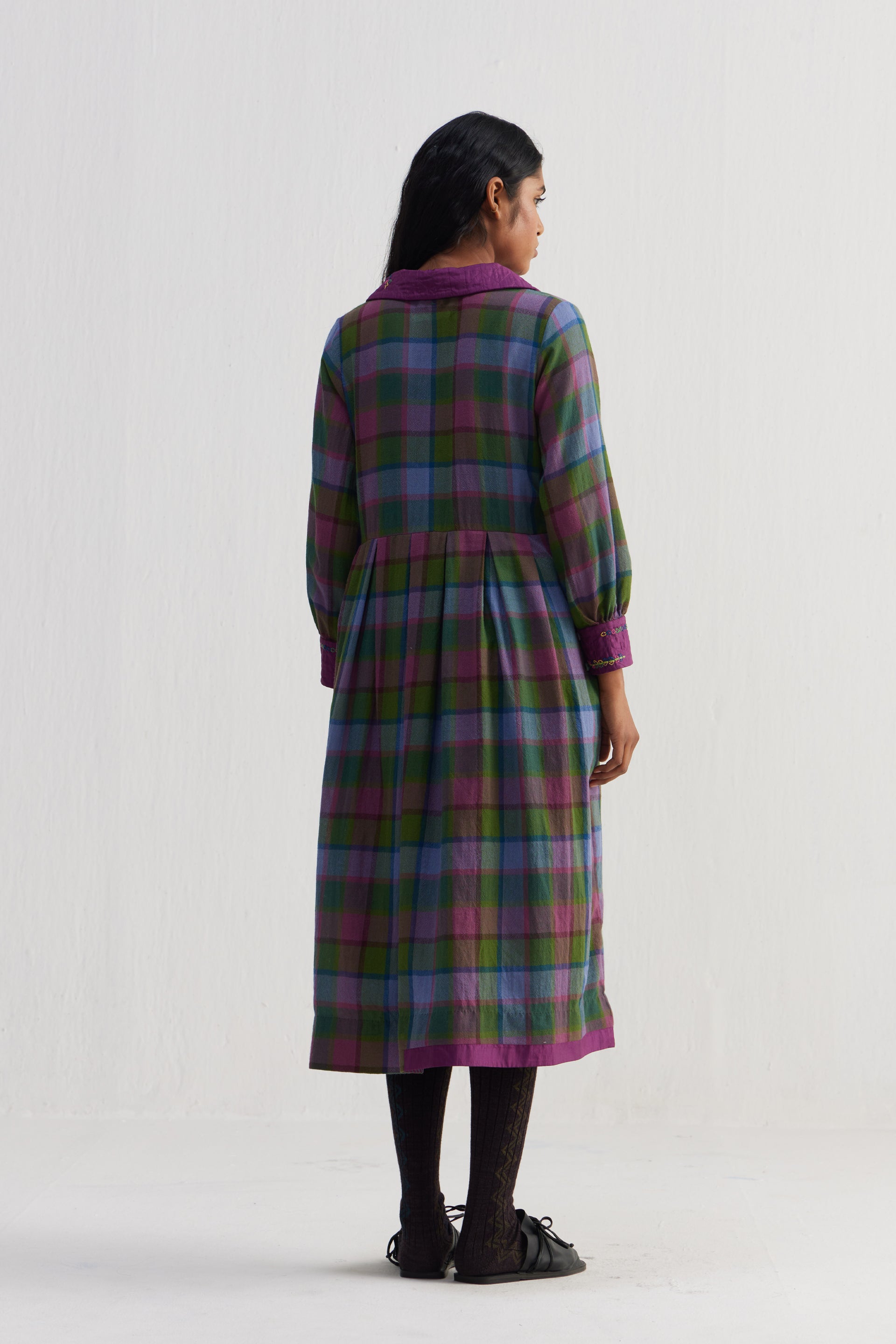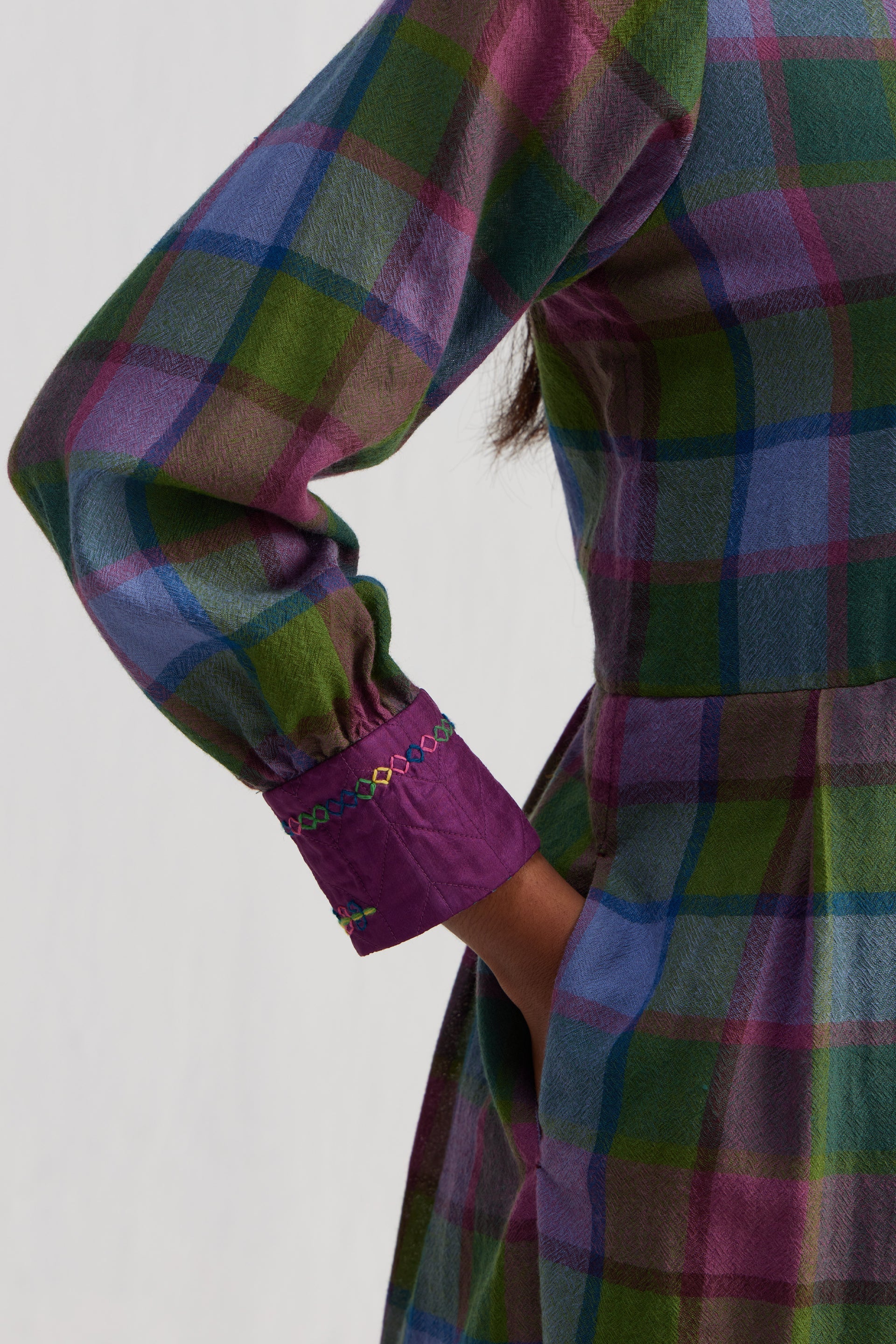 Relaxed fit front open button down collar midi dress with inverted box pleated on the waist and cuff on the sleeves. Constructed in checkered 100% wool fabric with hand embroidery on collar and cuffs quilted silk patch. Finished collage handblock print 100% silk fabric facing detail.