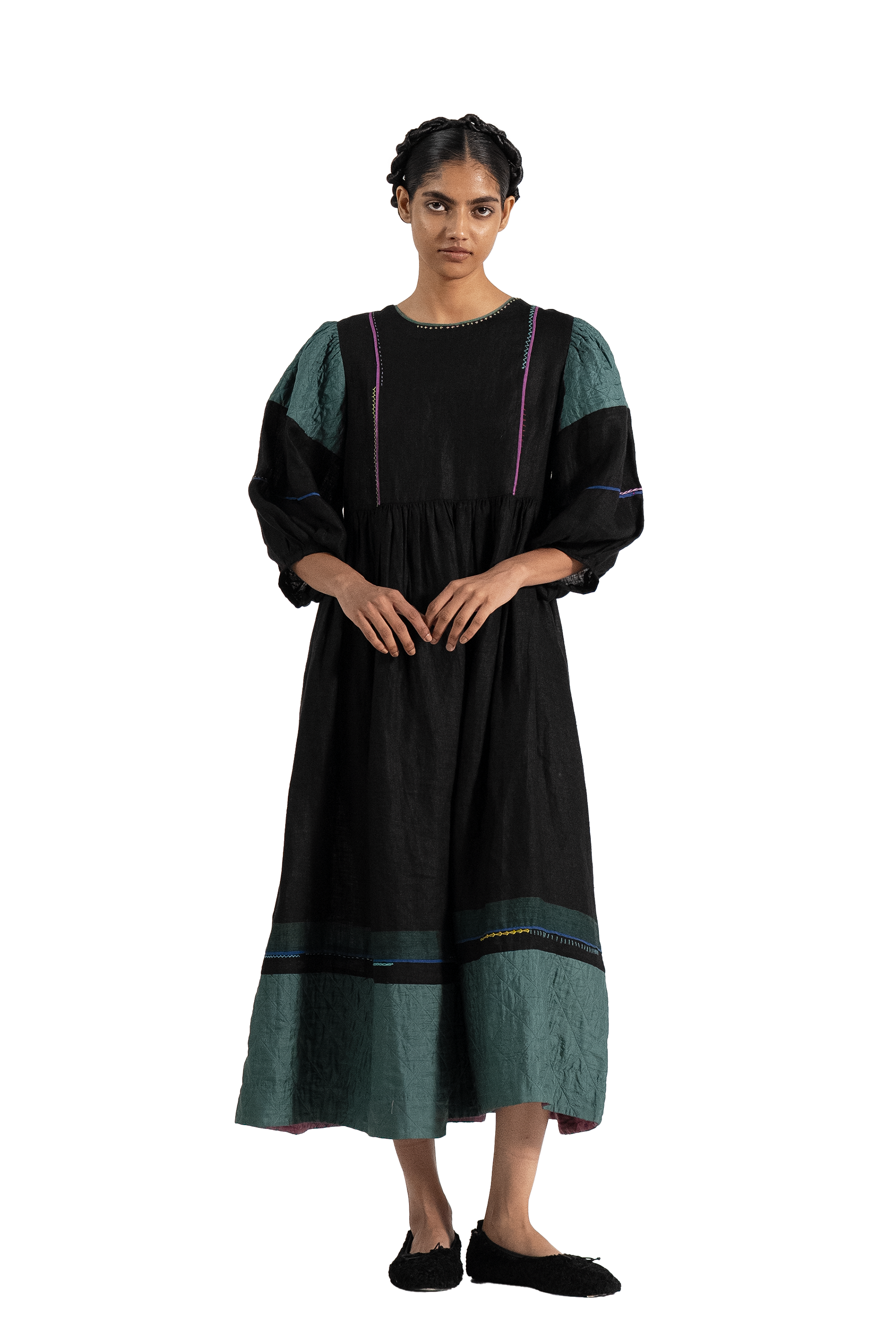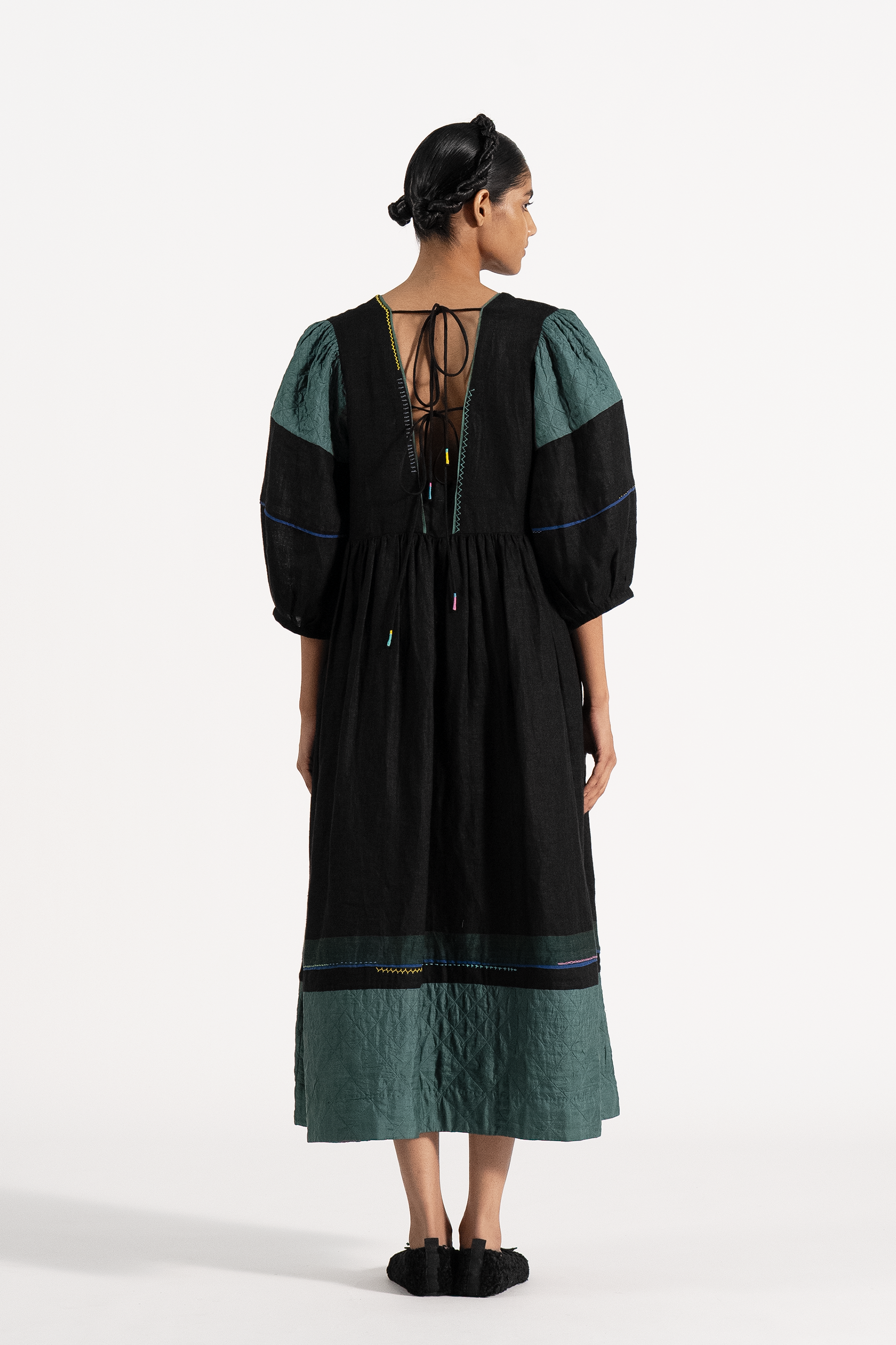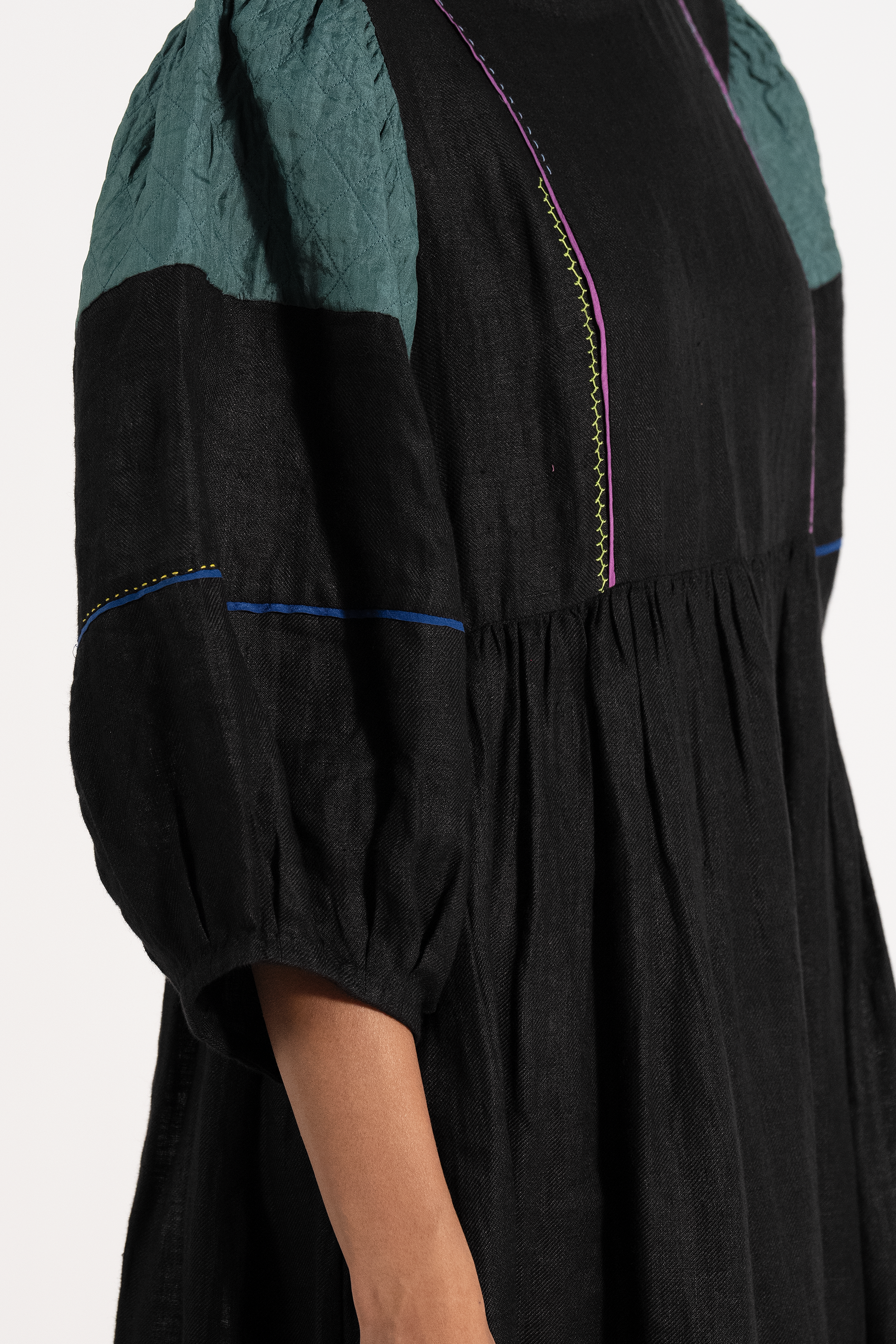 Puff Sleeved Midi Dress With Quilted Detail On Hem And Armhole. With Multicolor Delcate Hand Stitch Detail In 100% Linen