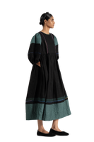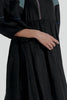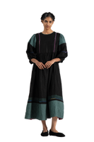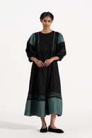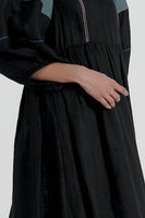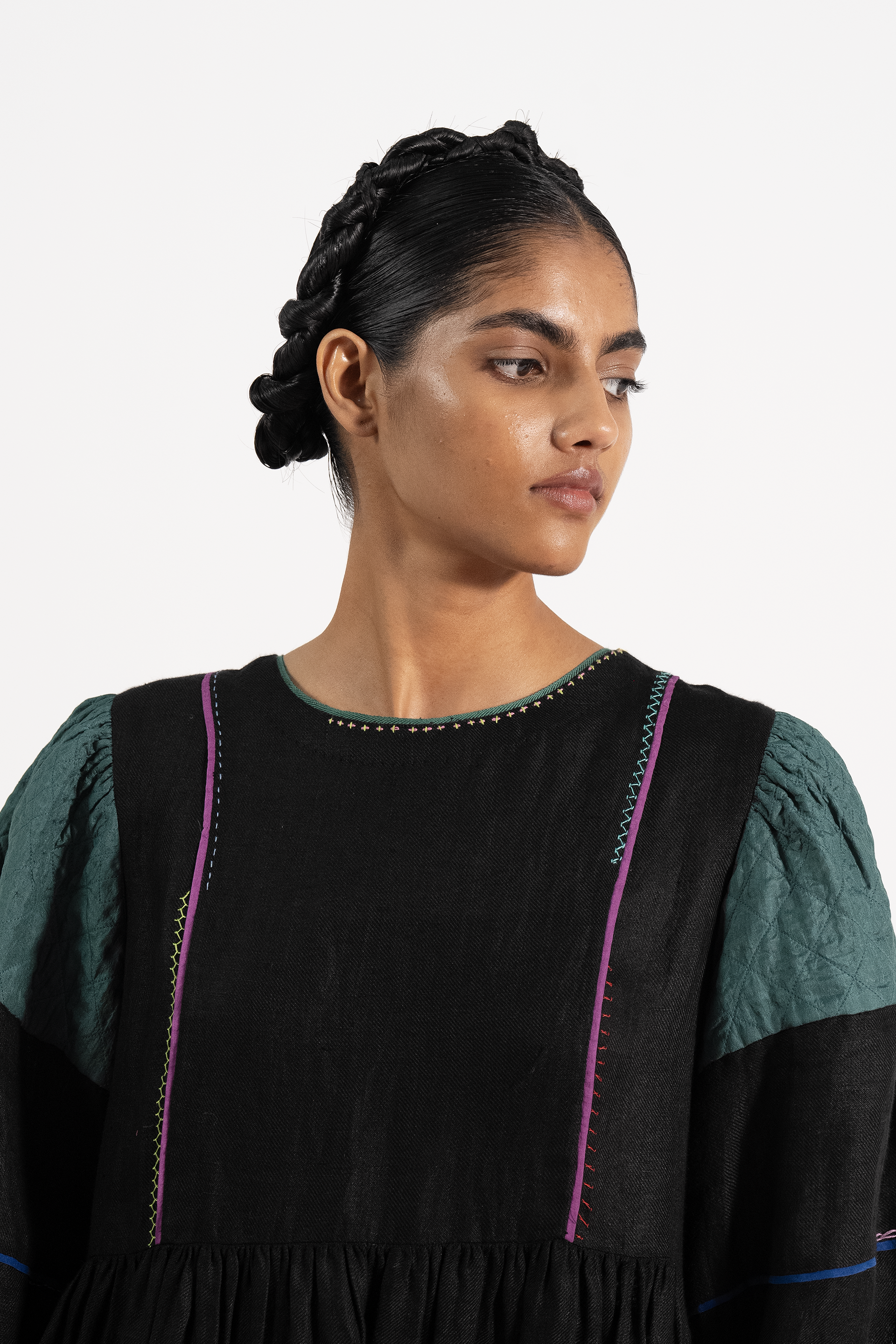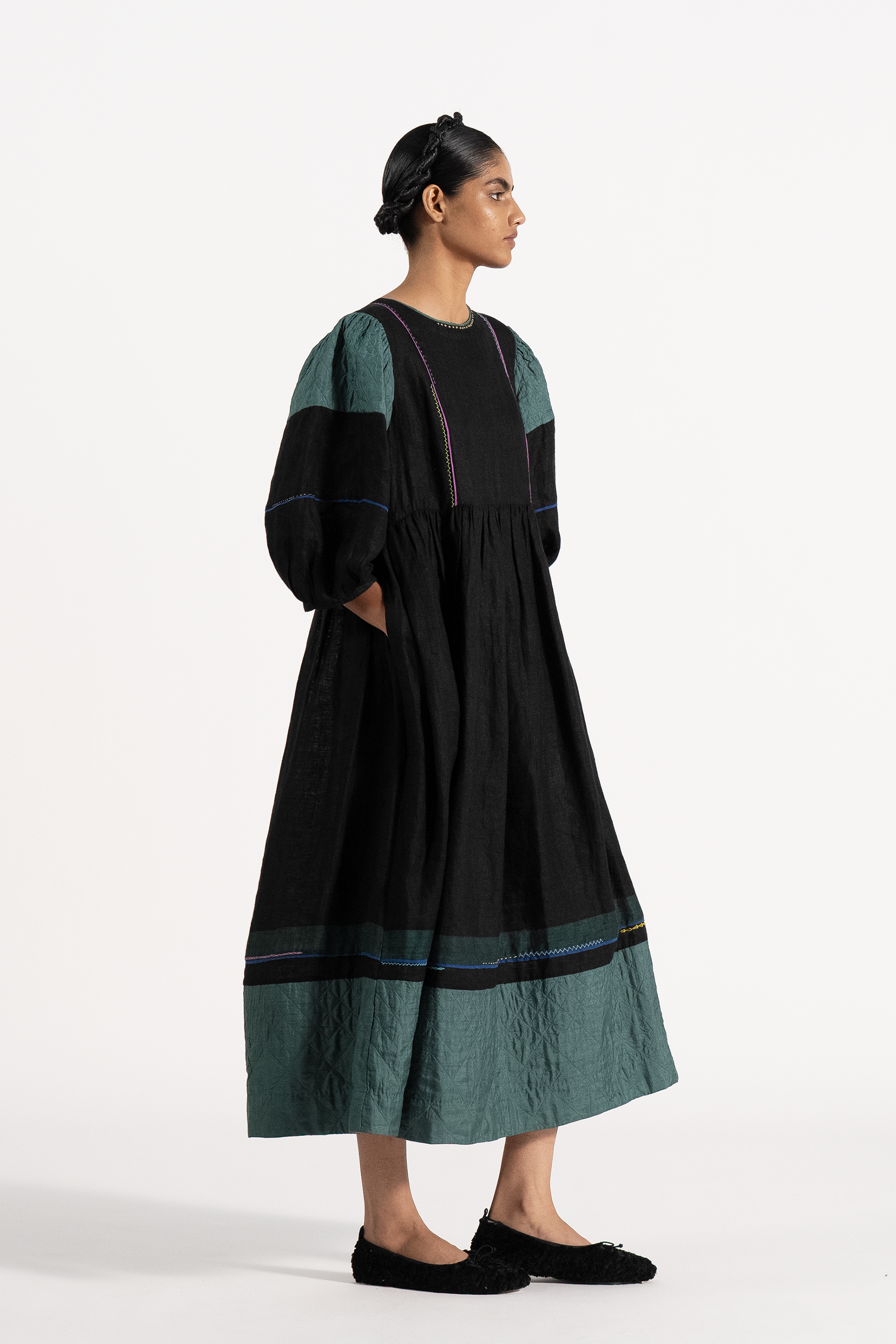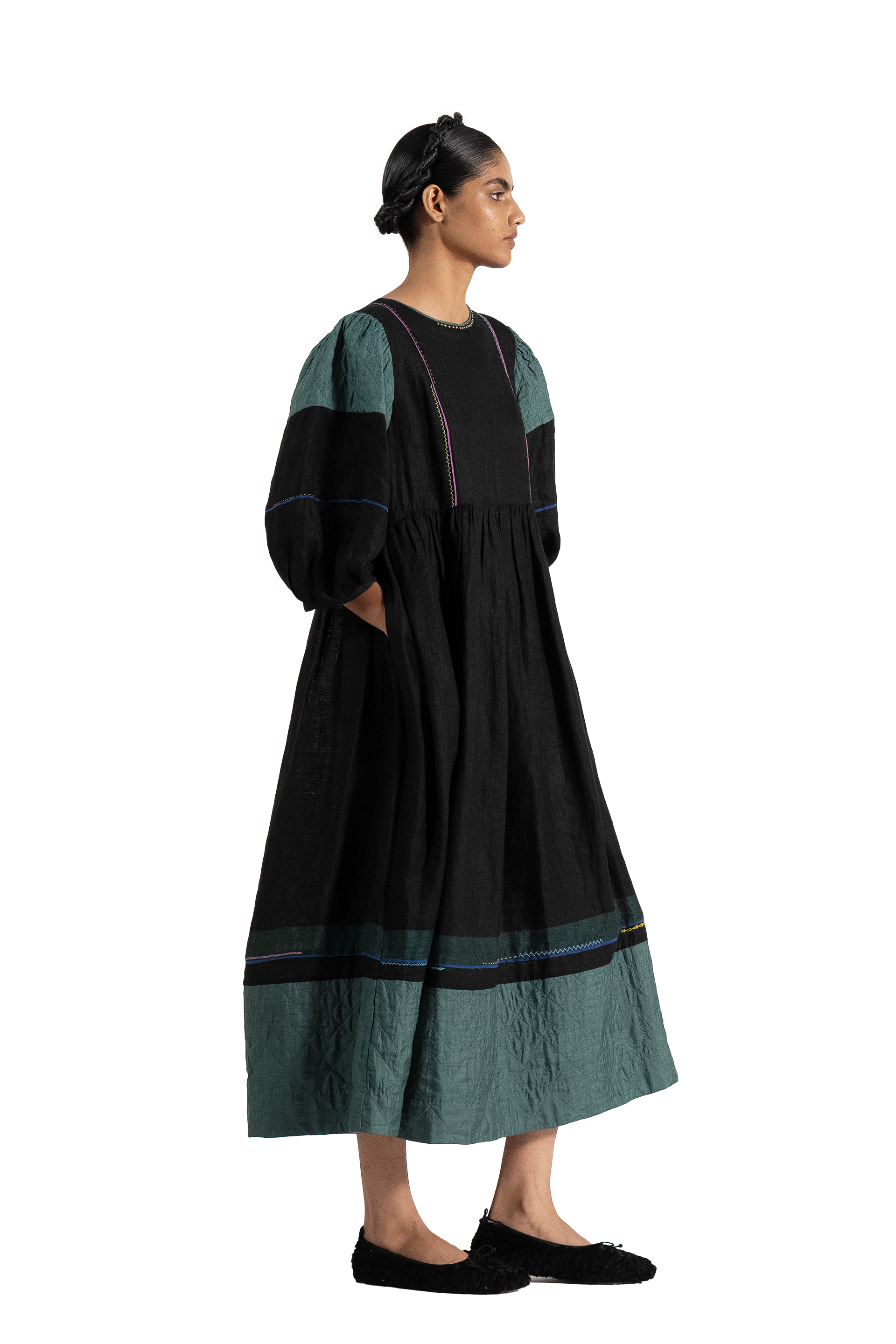 Puff Sleeved Midi Dress With Quilted Detail On Hem And Armhole. With Multicolor Delcate Hand Stitch Detail In 100% Linen