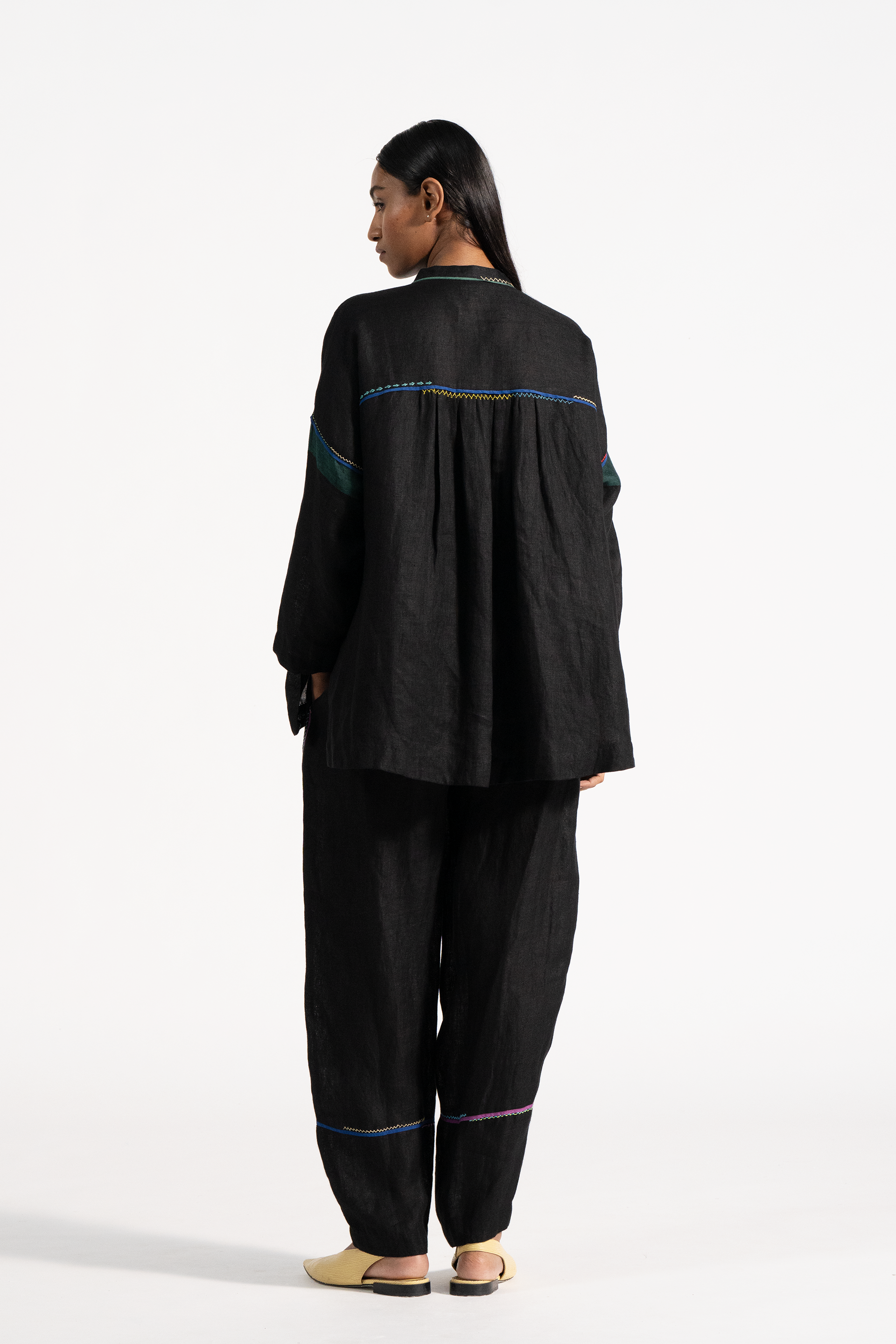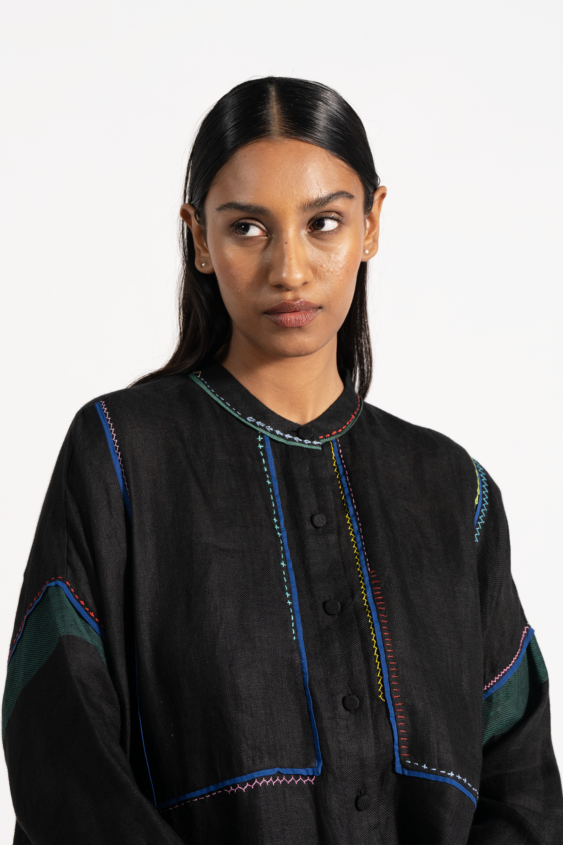 High Low Hem Relaxed Fit Shirt With Multicolor Delicate Hand Stitch Detail In 100% Linen.
