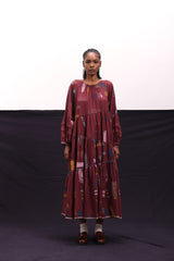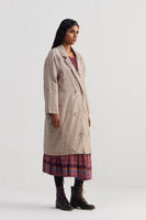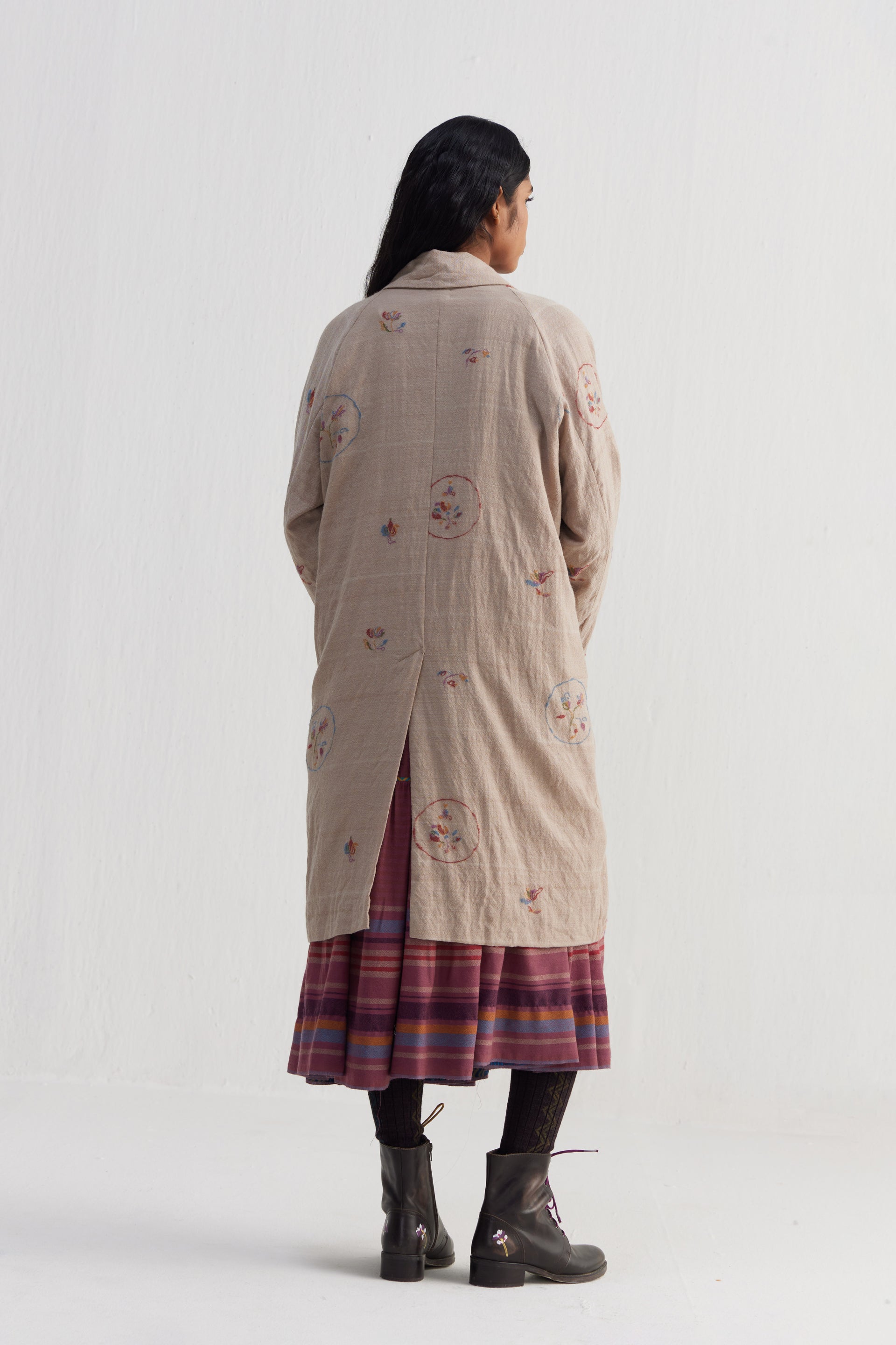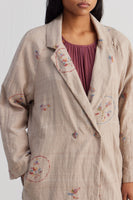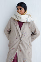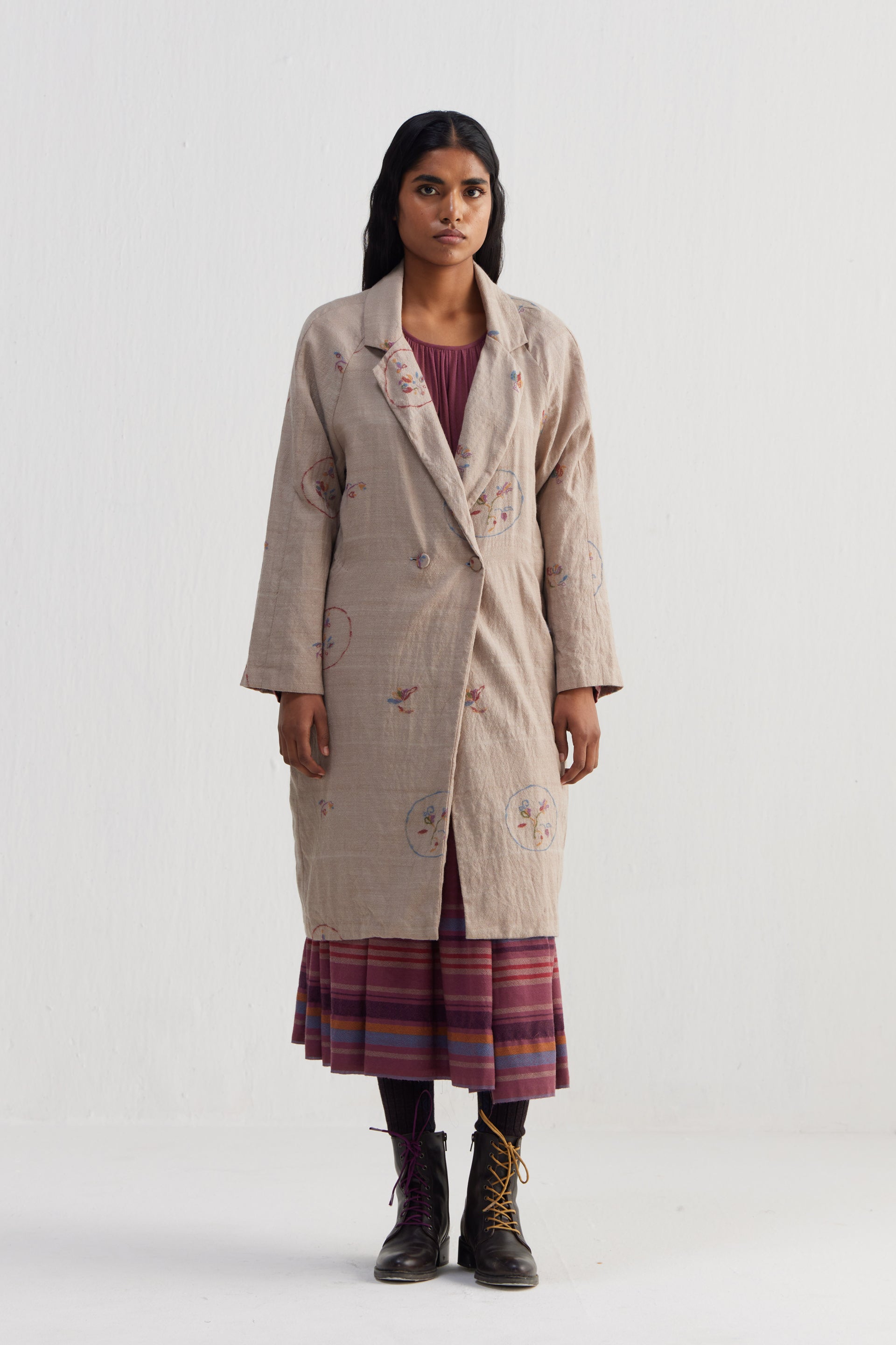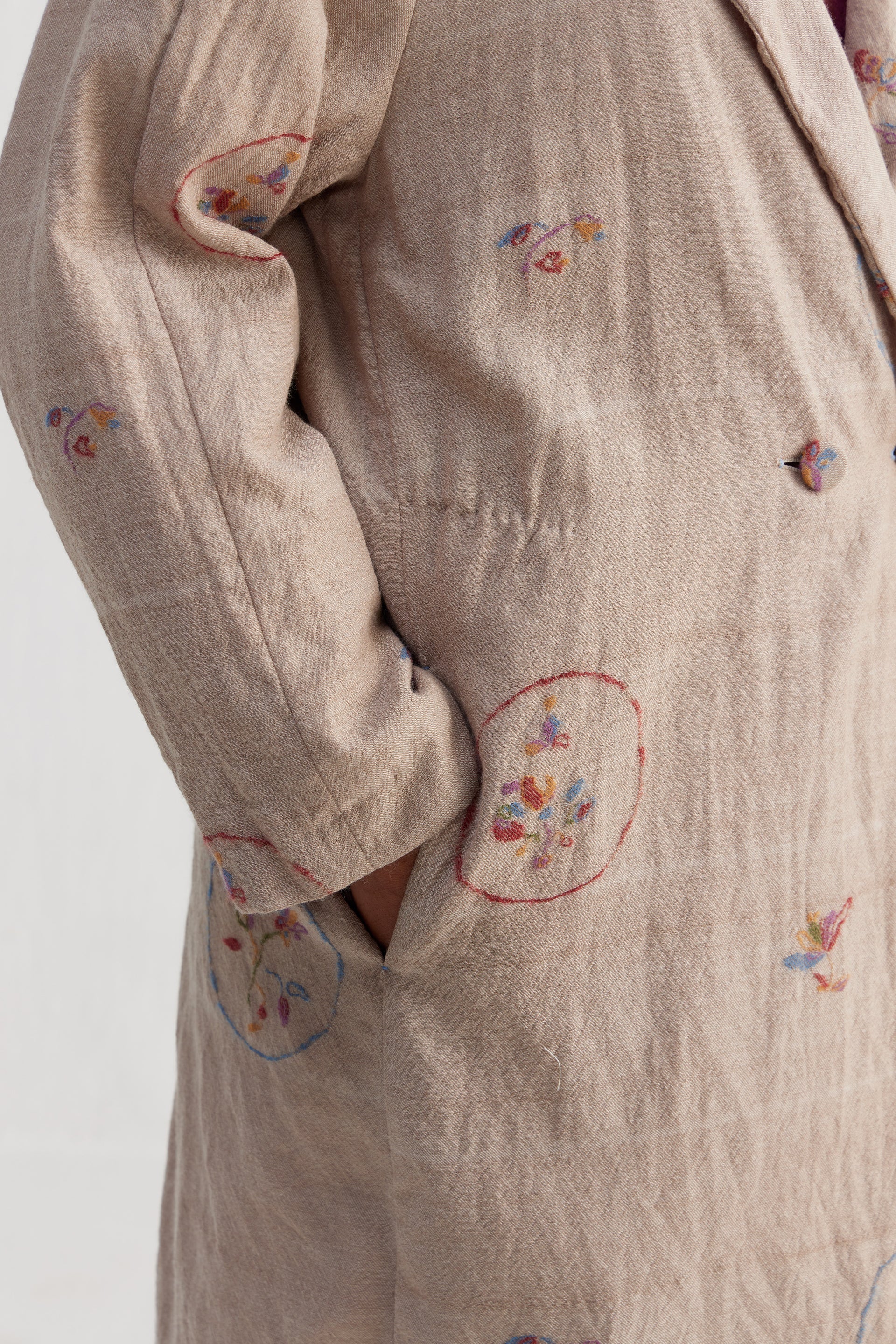 Straight fit double breasted notch collar full sleeves long jacket. Constructed in contemporary floral placement motifs in 100% merino wool fabric. Finished with contrast collage hand block print 100% silk fabric lining.