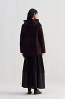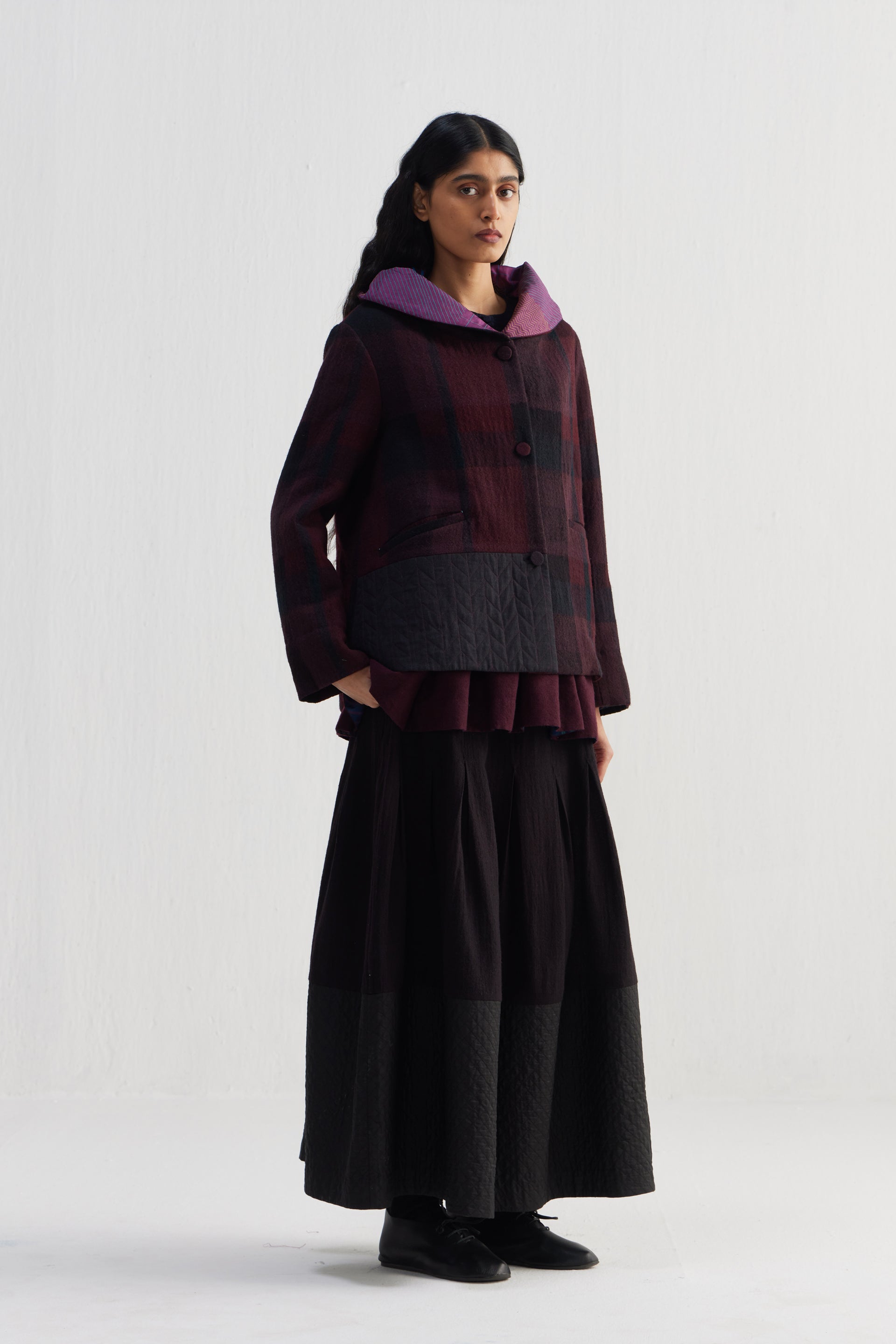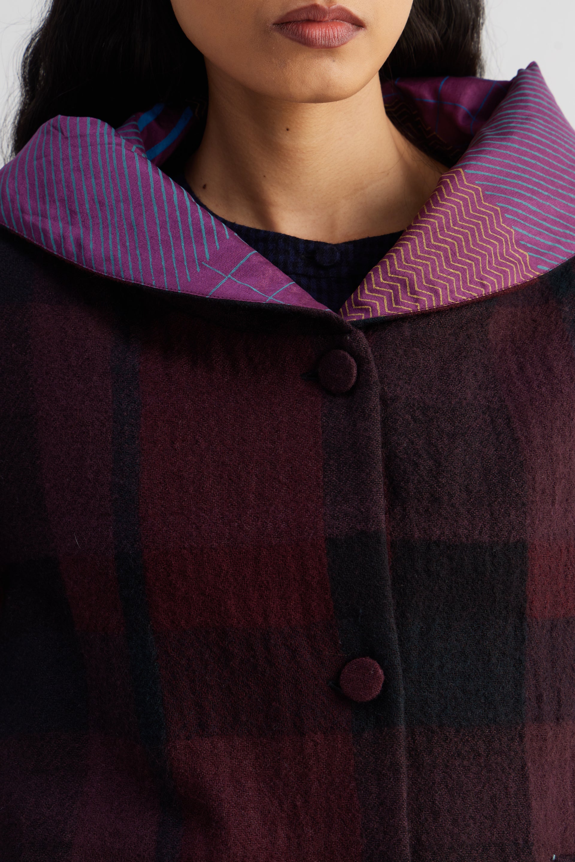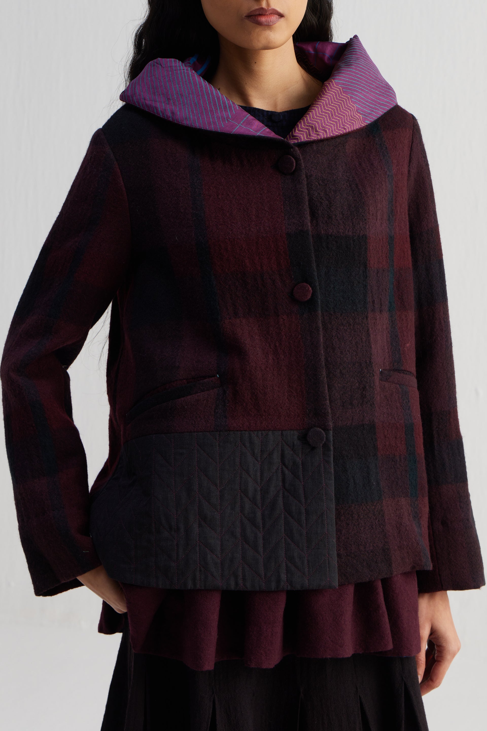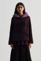 Short hoodie jacket with quilted silk color block patch and full sleeves. Constructed in checkered 100% merino wool. Finished with hand block printed 100% silk lining.