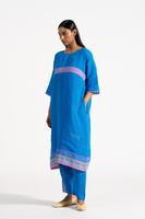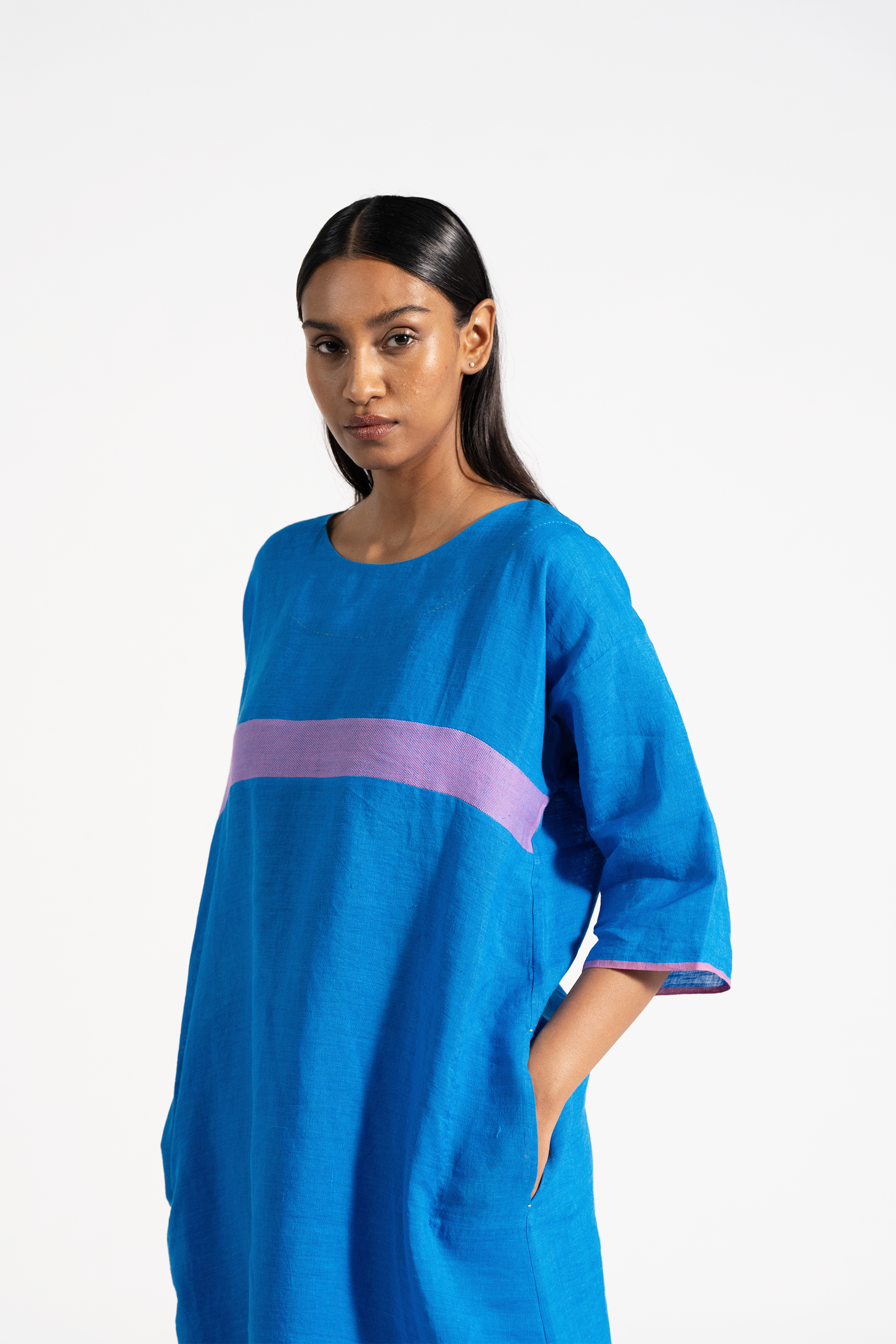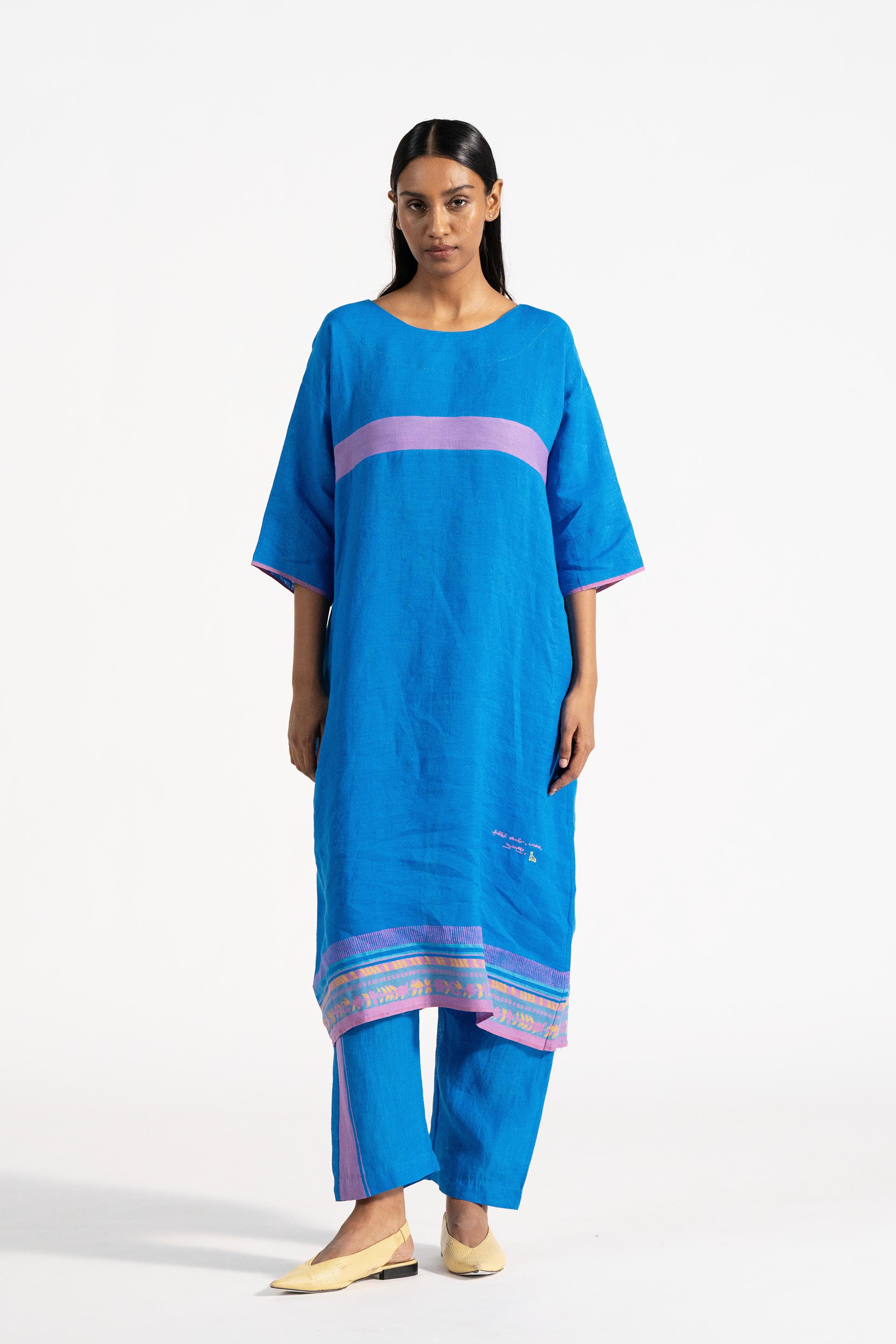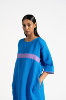 Vibrant blue relaxed fit tunic dress in 100% linen with multicolor handblock print bordered and text print hand embroidery on the side.