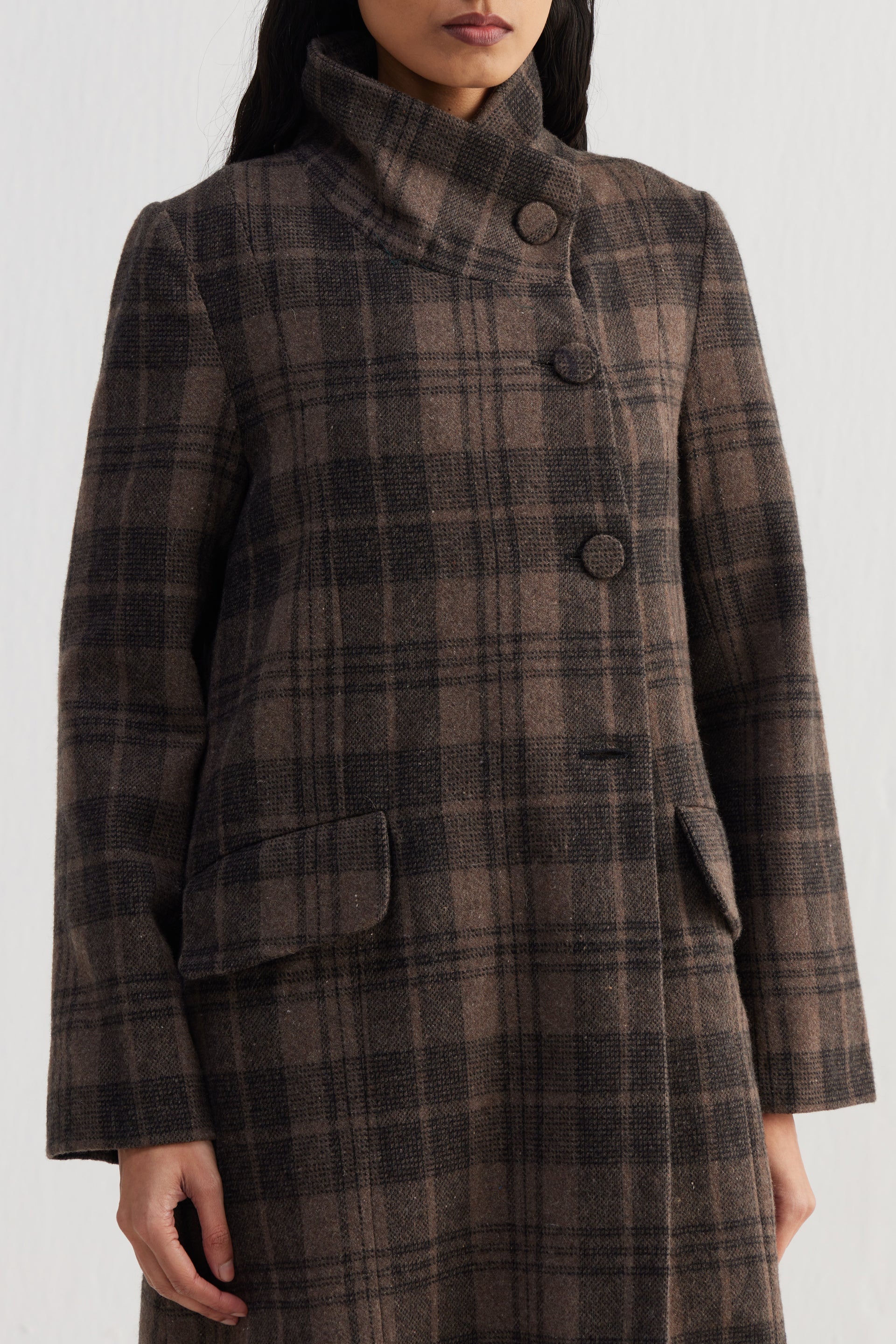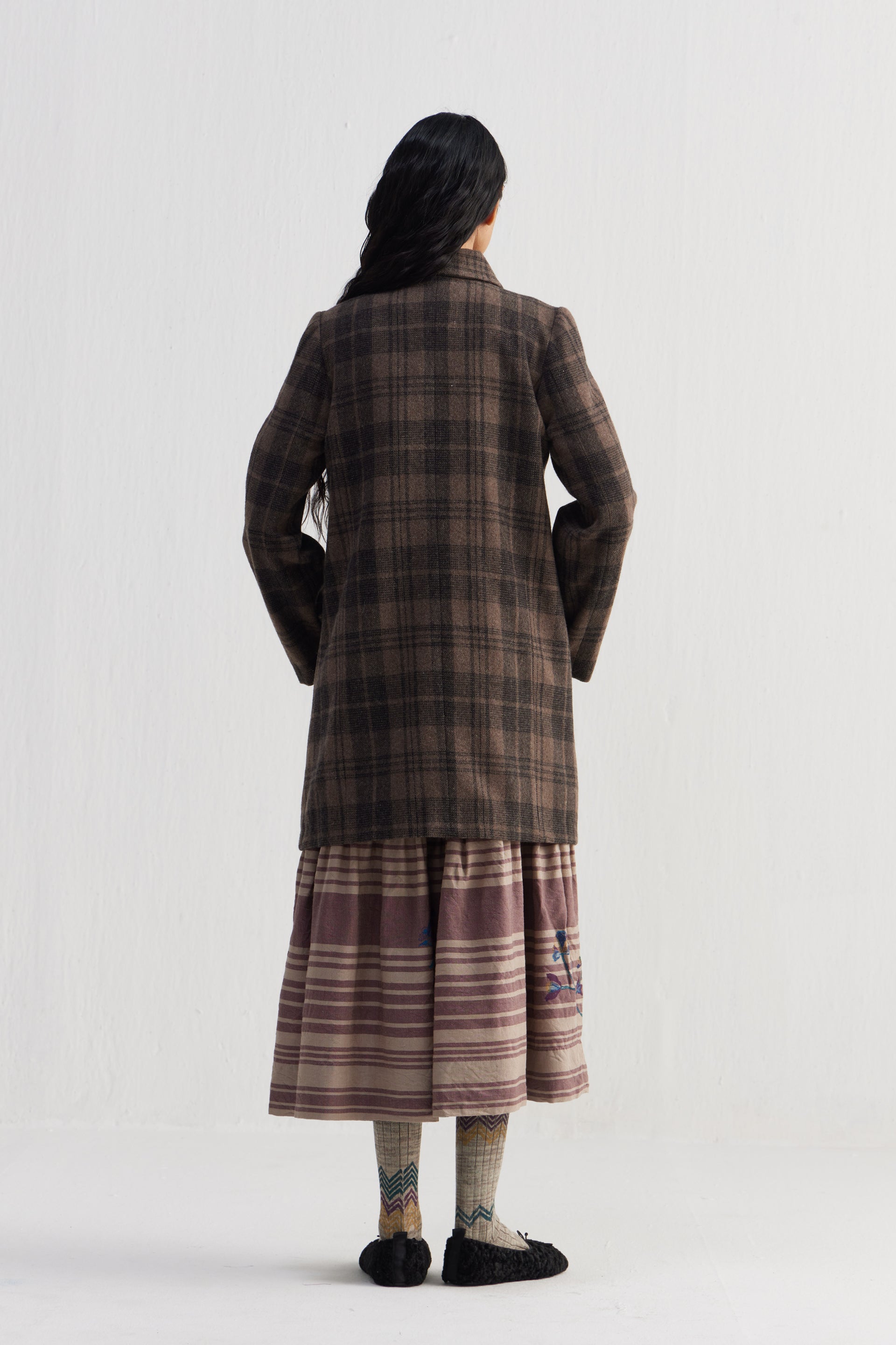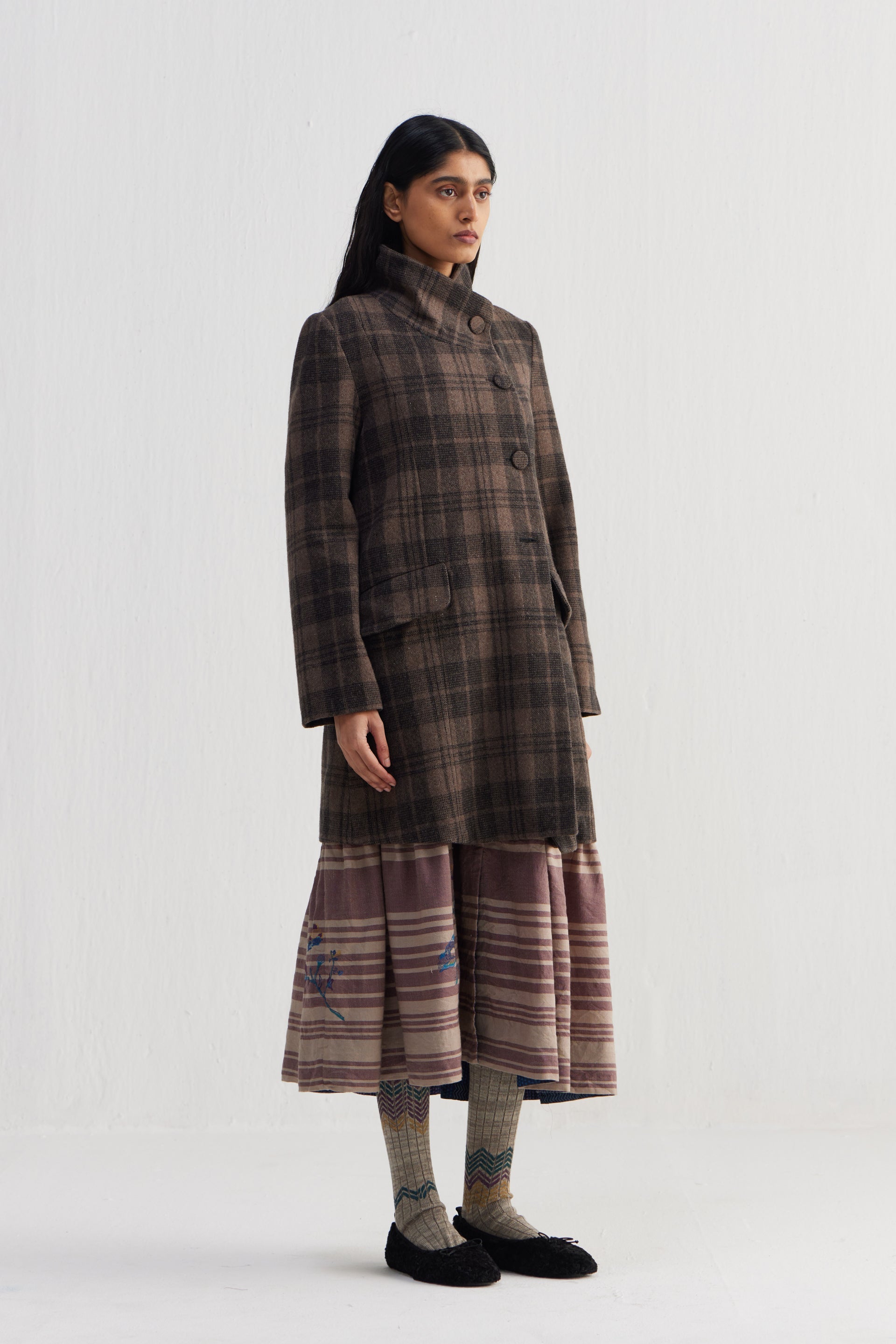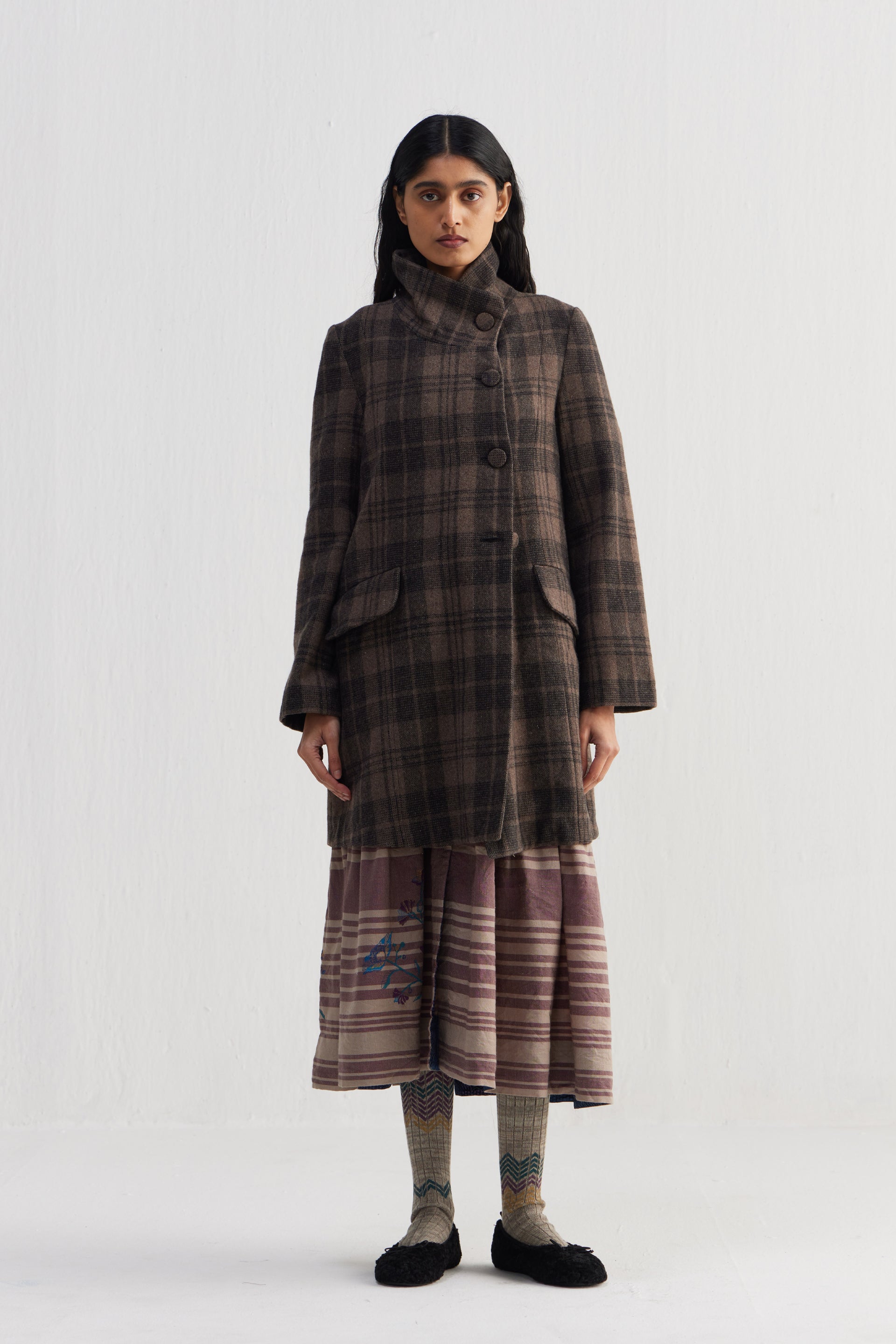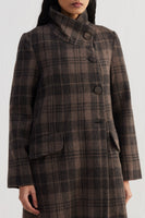 Straight fit stand collar knee length jacket with full sleeves and flap pocket detail in the front. Constructed in tone-on-tone thick and thin checkered 100% wool fabric. Finished with contrast collage print 100% silk facing.