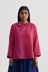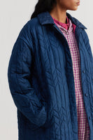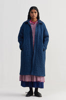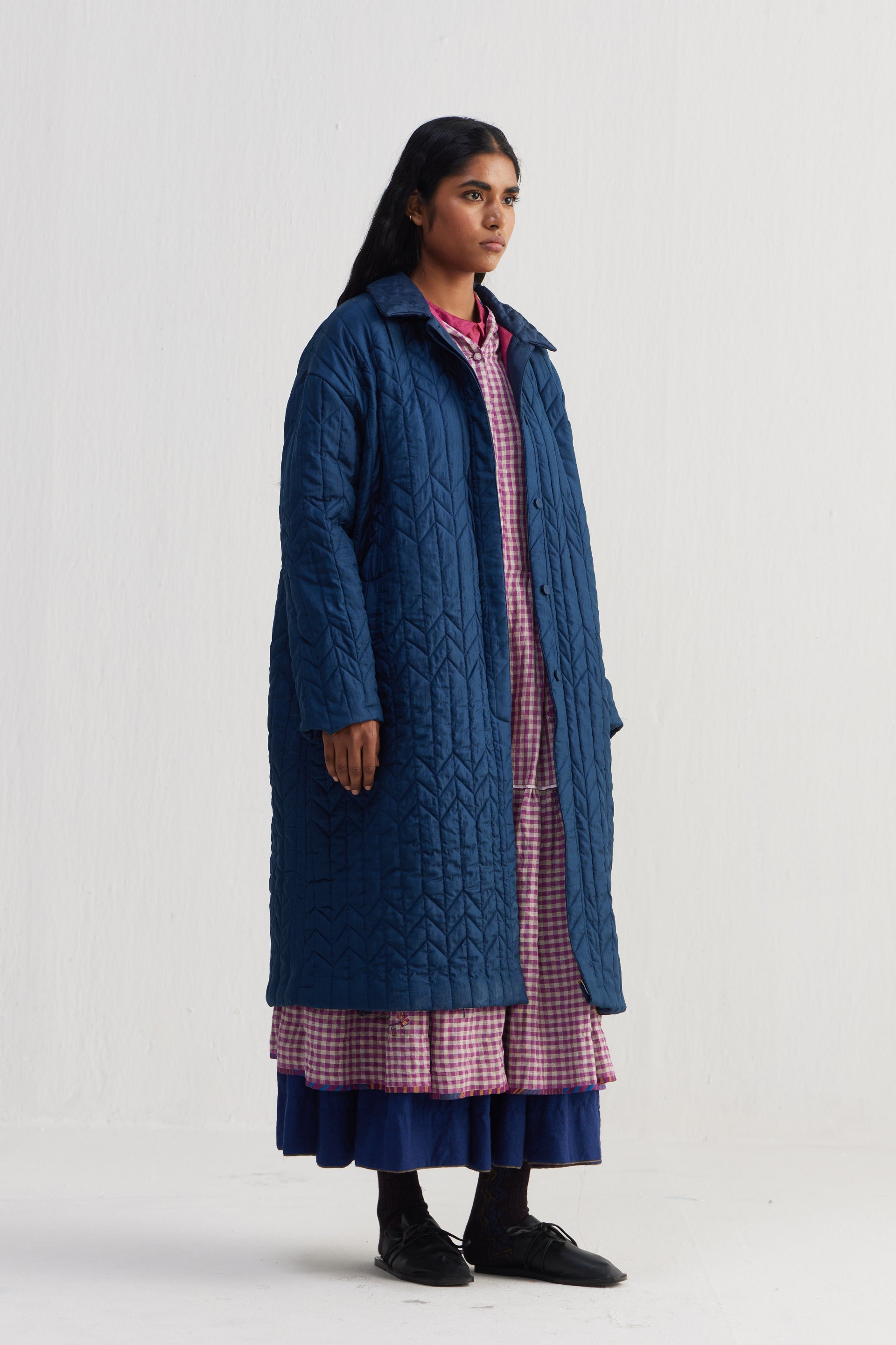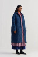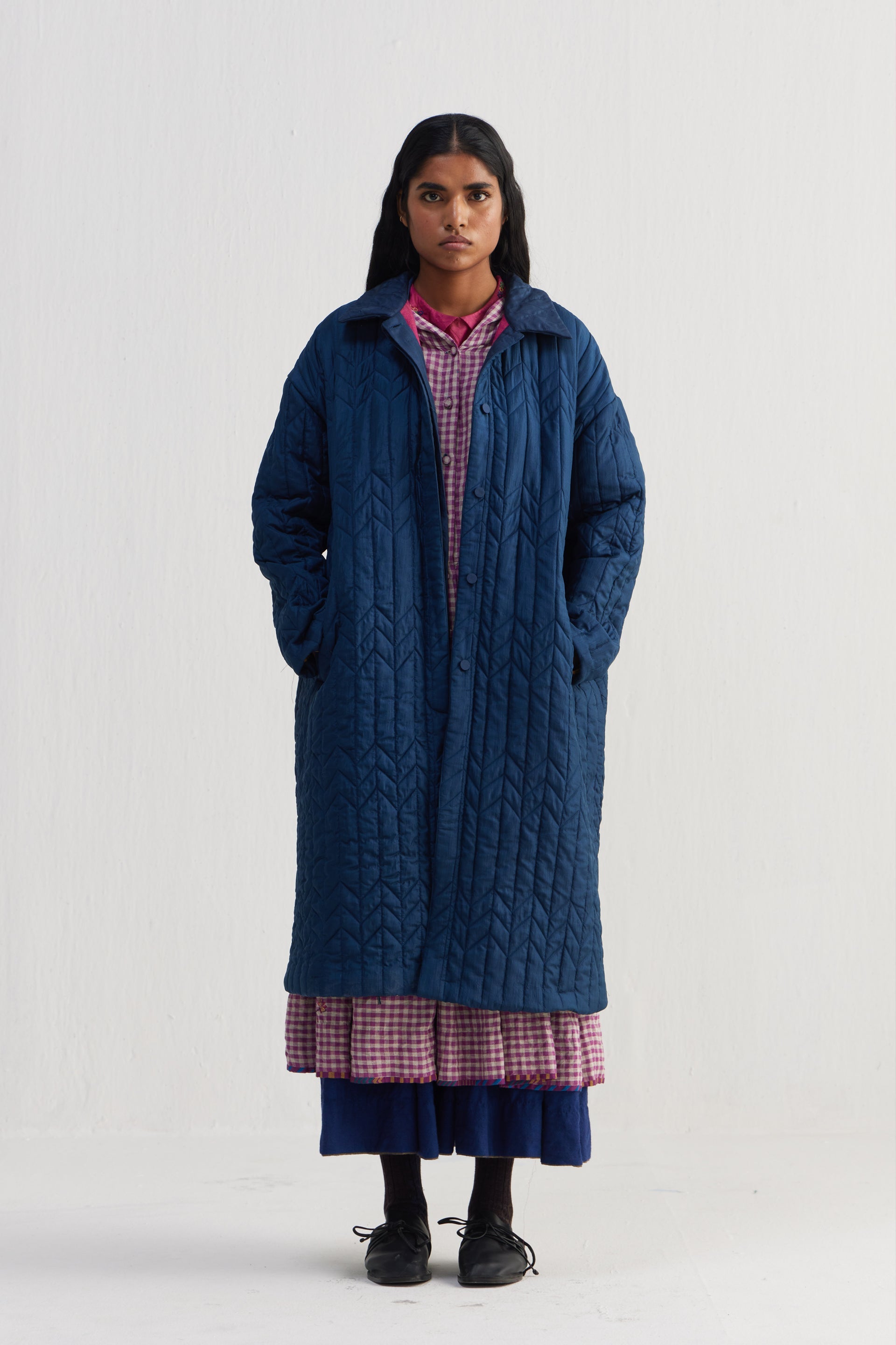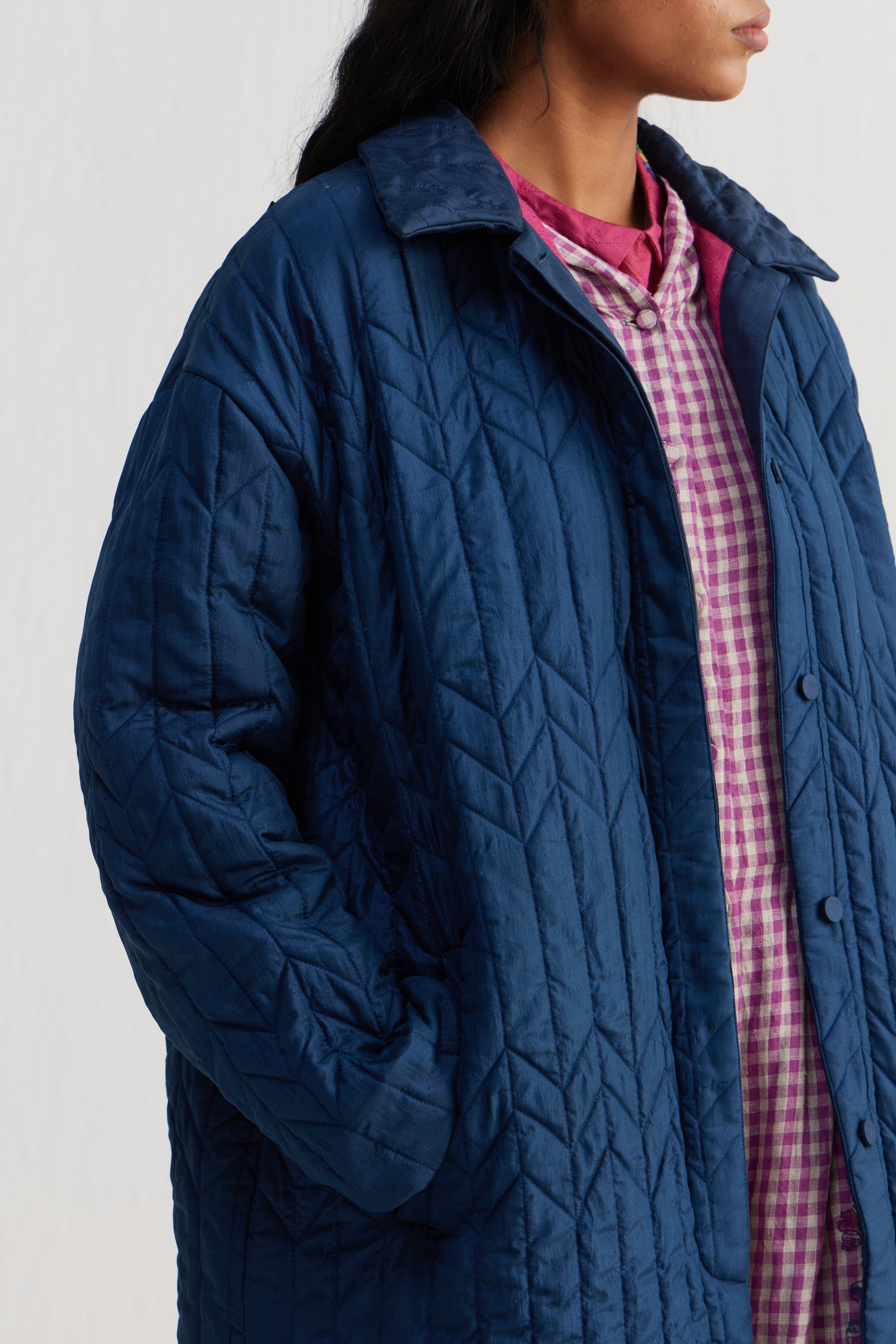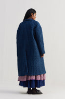 Relaxed fit full sleeves basic collar front open button down long jacket. Constructed in quilted solid 100% silk fabric. Finished with solid 100% merino wool fabric.