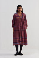 V- neckline tier midi dress front open button down with pin tuck detail on body and full puff sleeve .Constructed in striper 100% merino wool. Finished with contrast handblock print piping detail and collage handblock print 100% silk fabric facing detail.