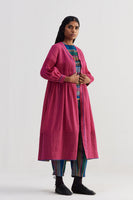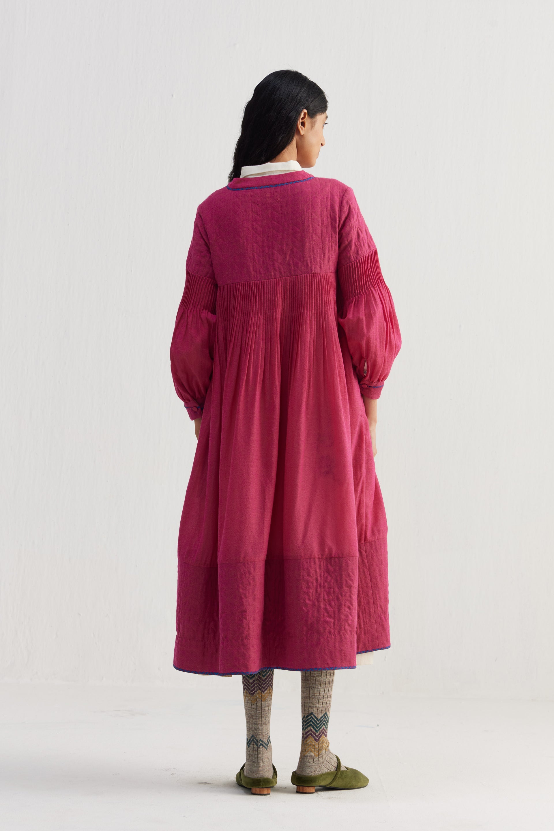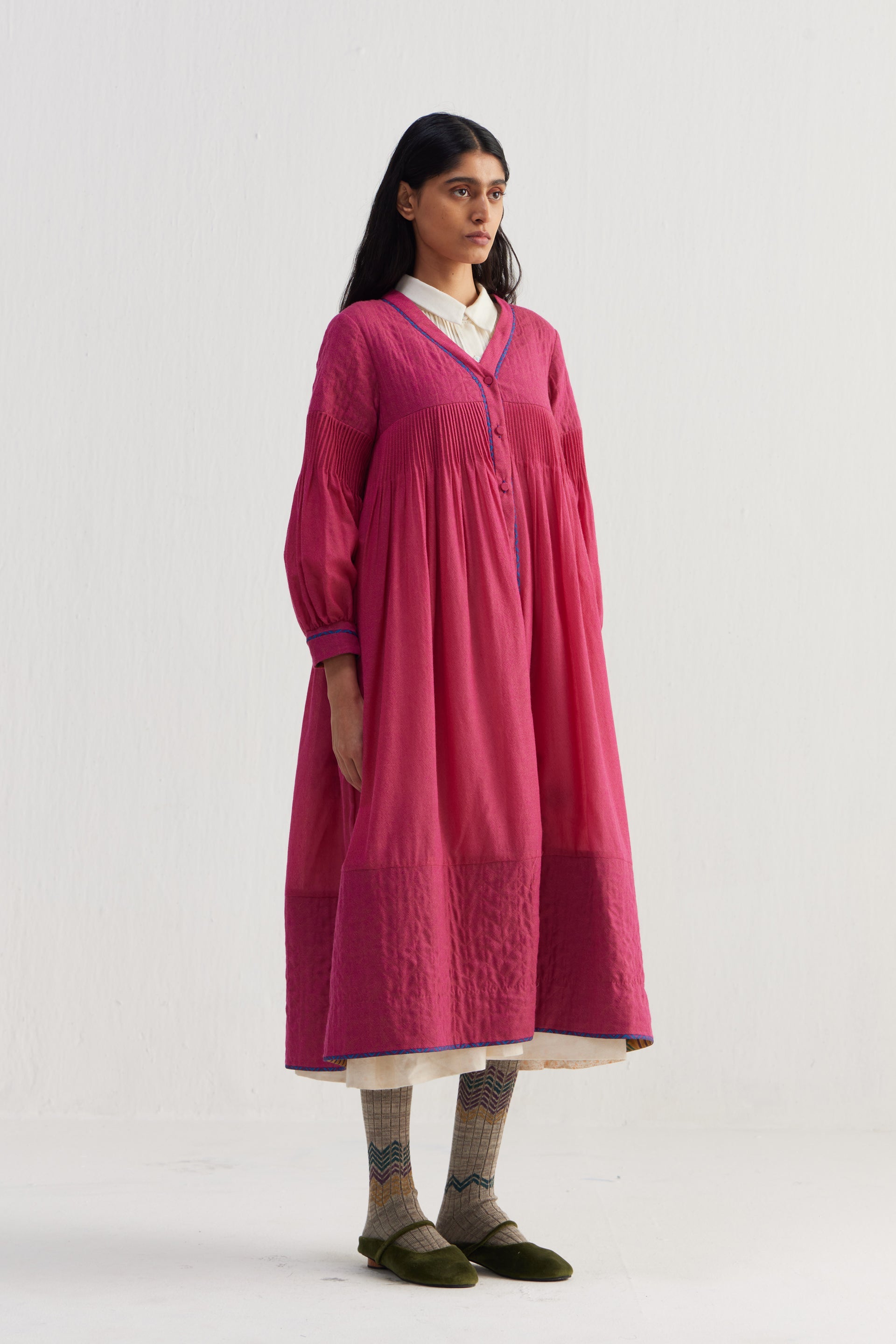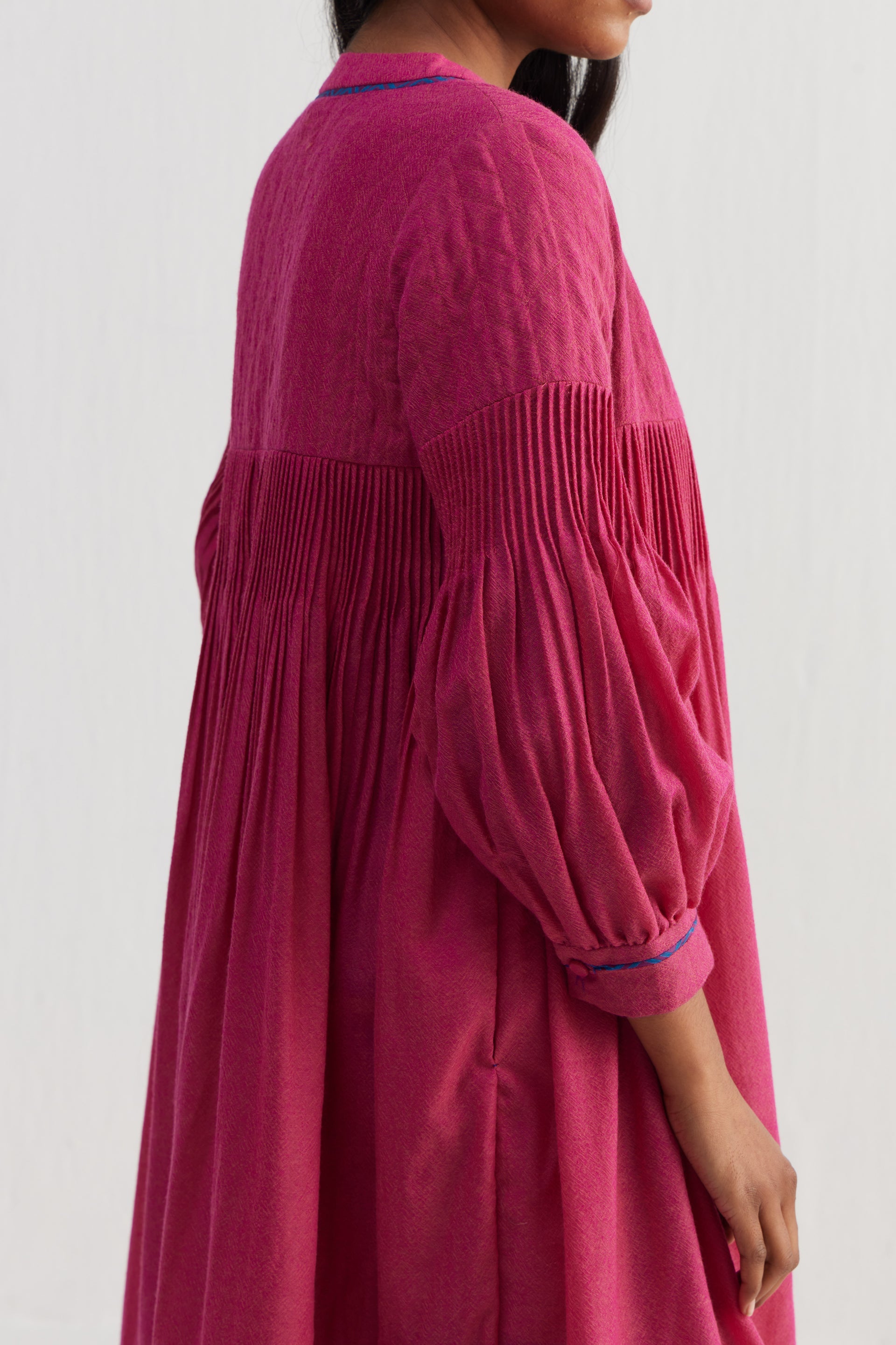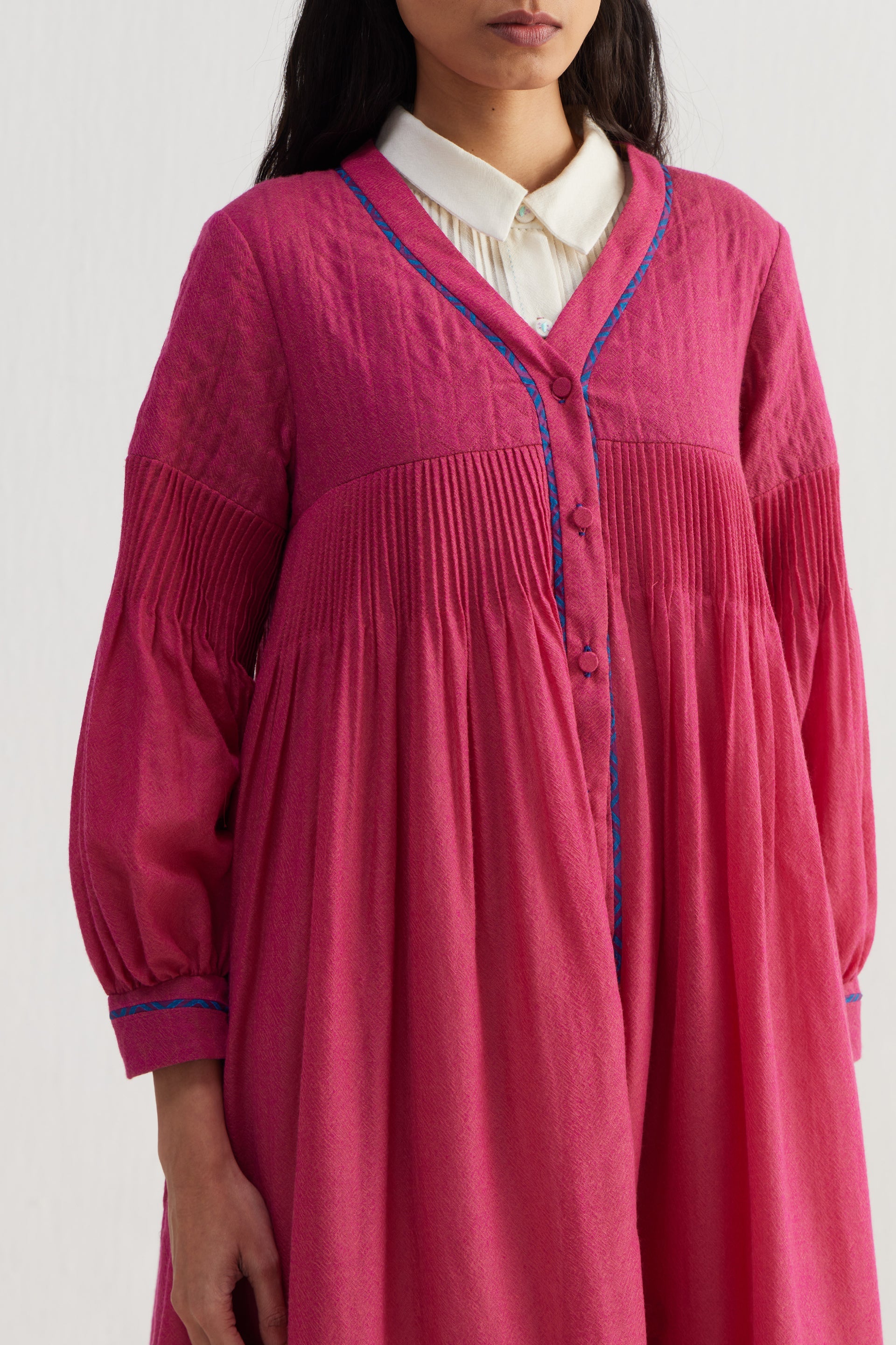 V- neckline tier midi dress front open button down with pin tuck detail on body and full puff sleeve .Constructed in solid 100% merino wool. Finished with contrast handblock print piping detail and collage handblock print 100% silk fabric facing detail.