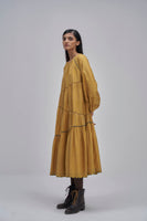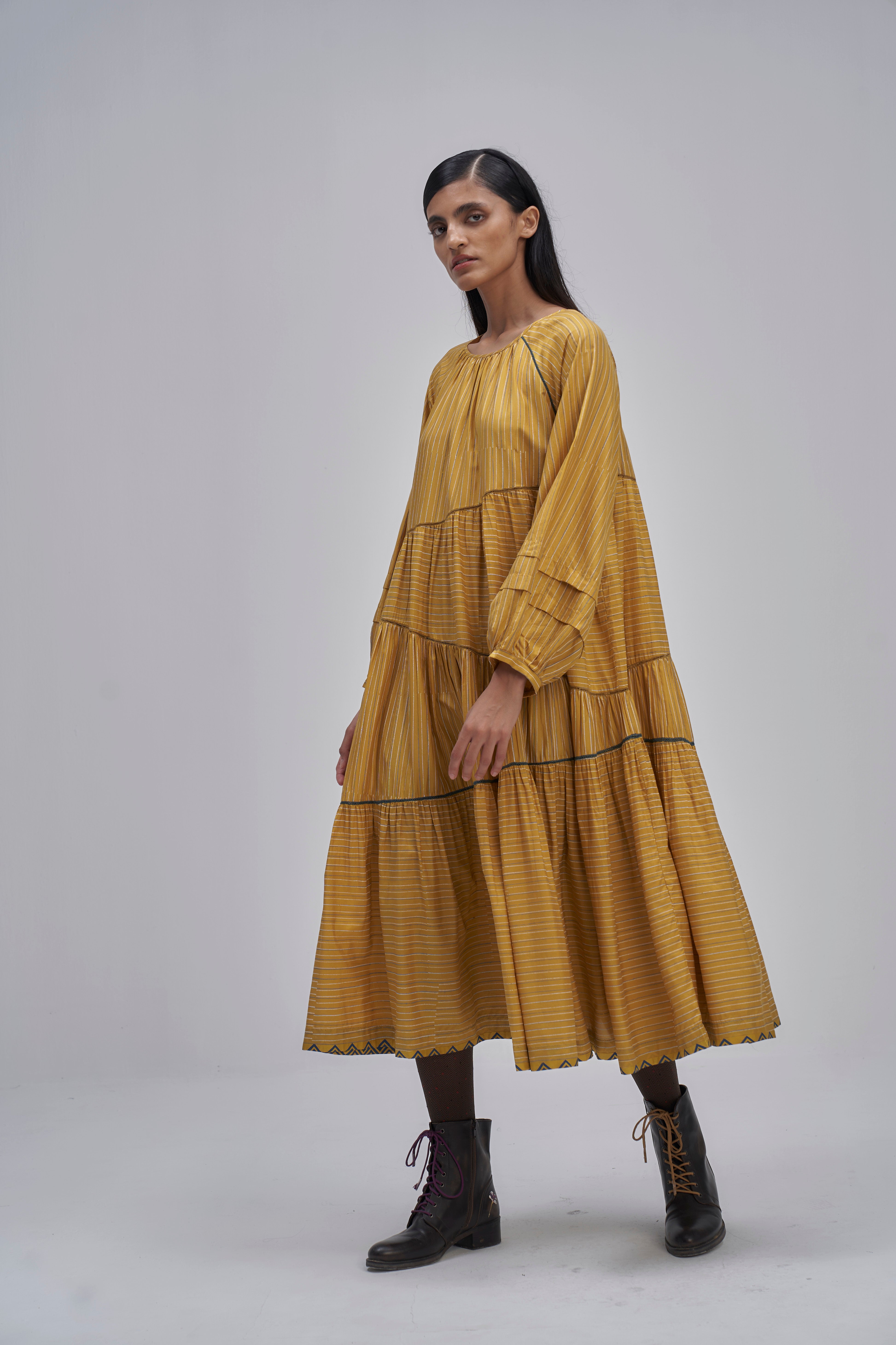 Round neckline raglan sleeve asymmetrical tier maxi dress with tuck detail on full puff sleeves and back button closure detail. Constructed in solid 100% silk fabric. Finished with contrast handblock print piping detail and collage handblock printed 100% silk fabric facing detail.