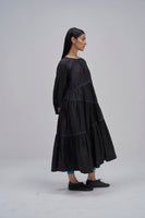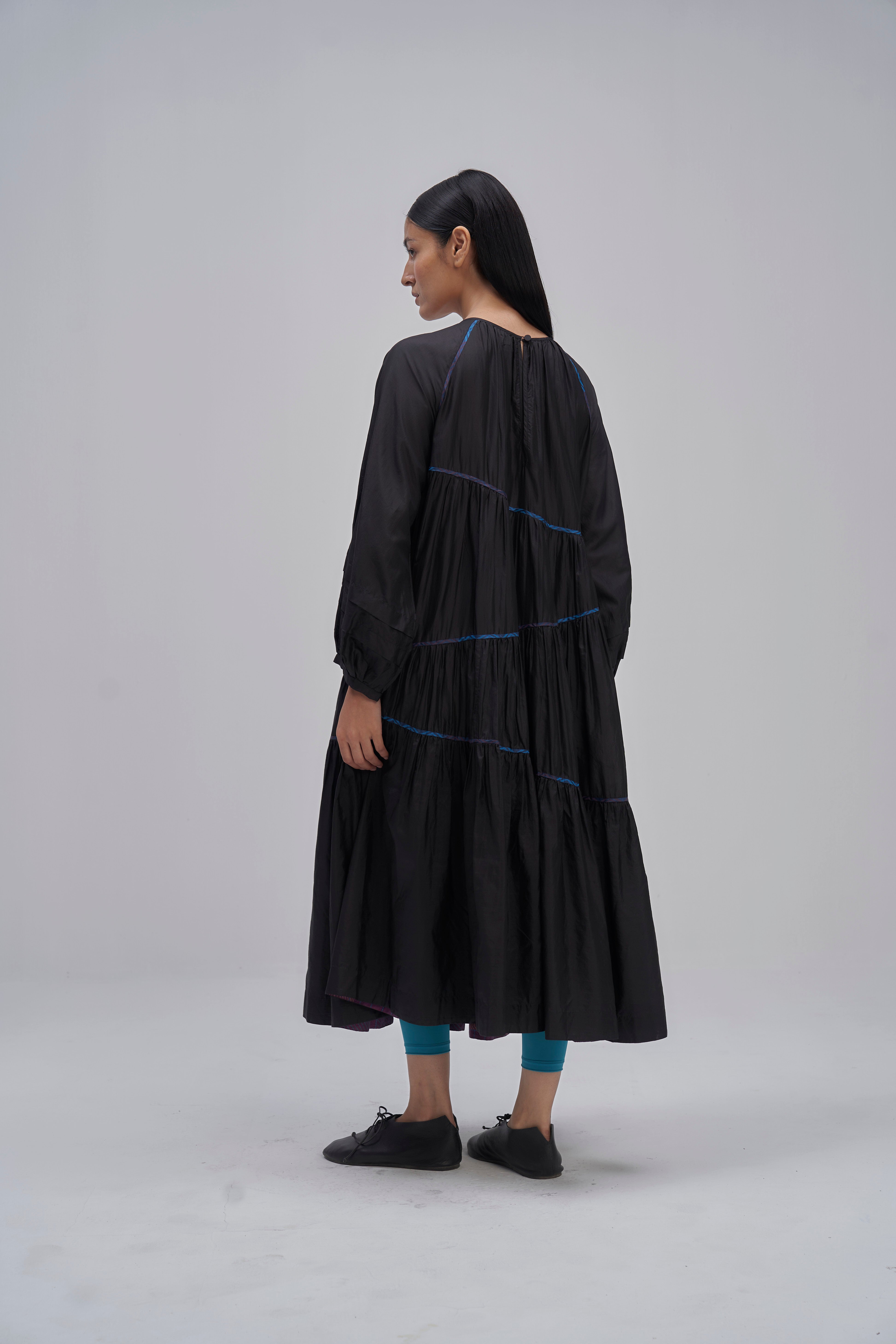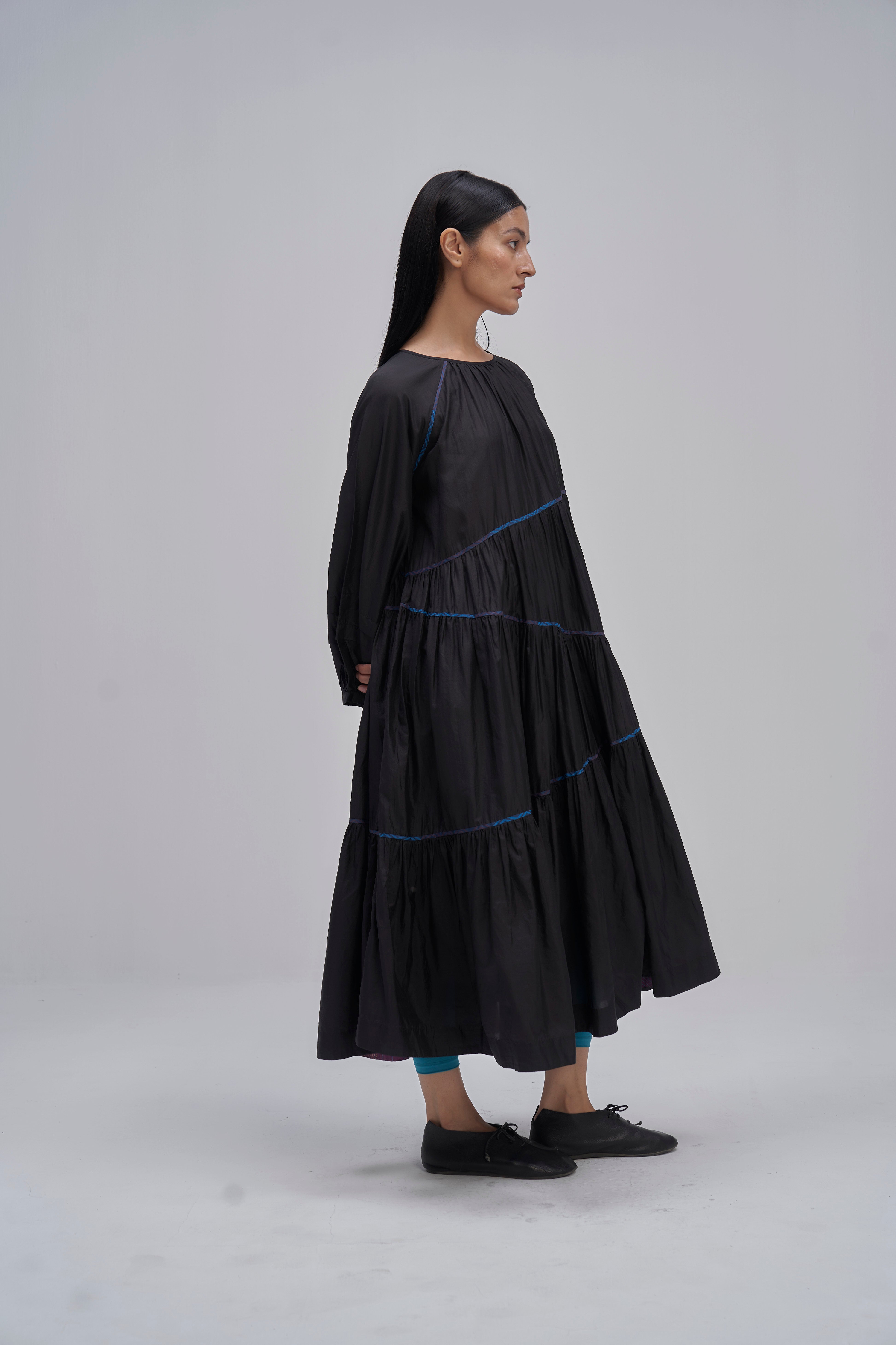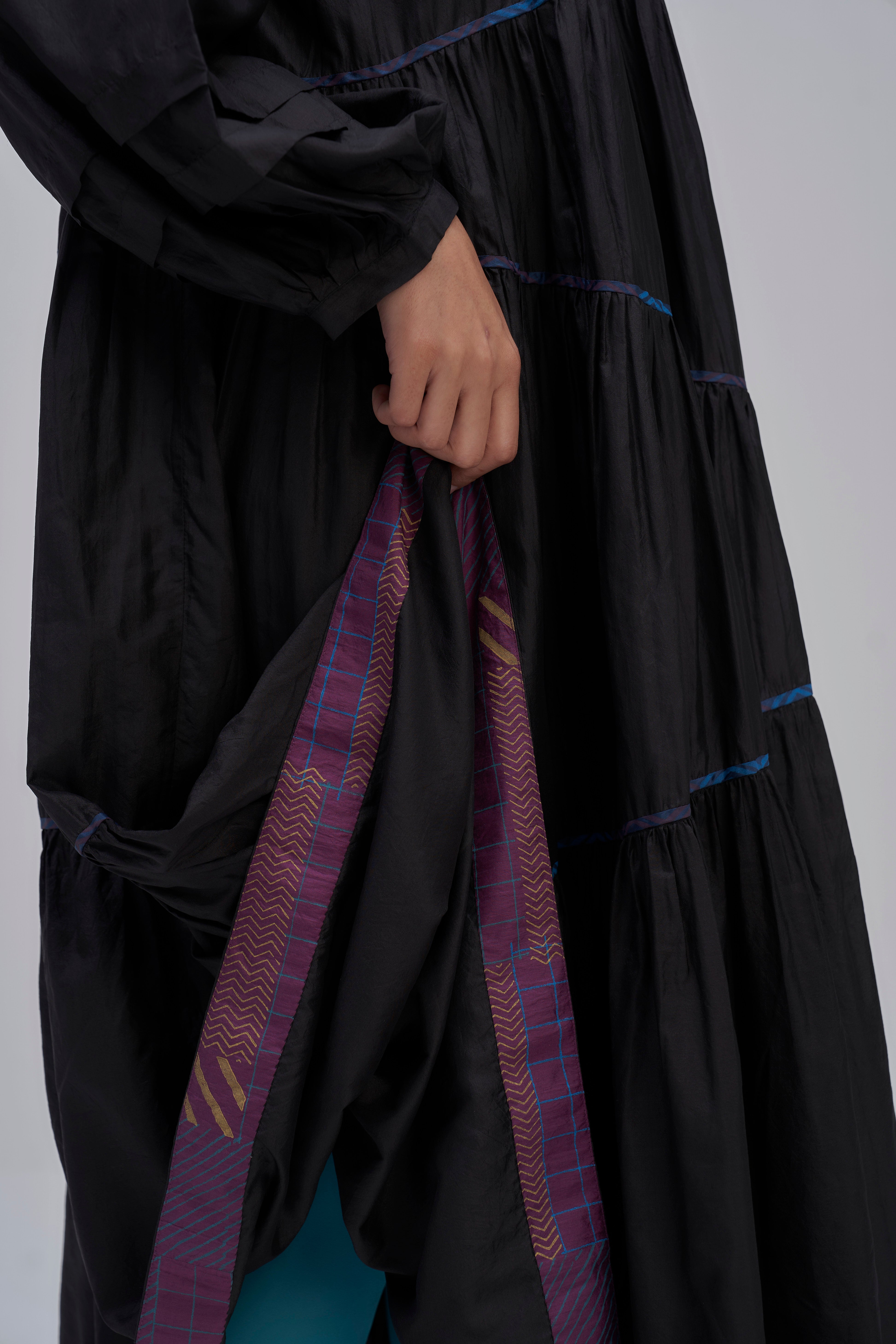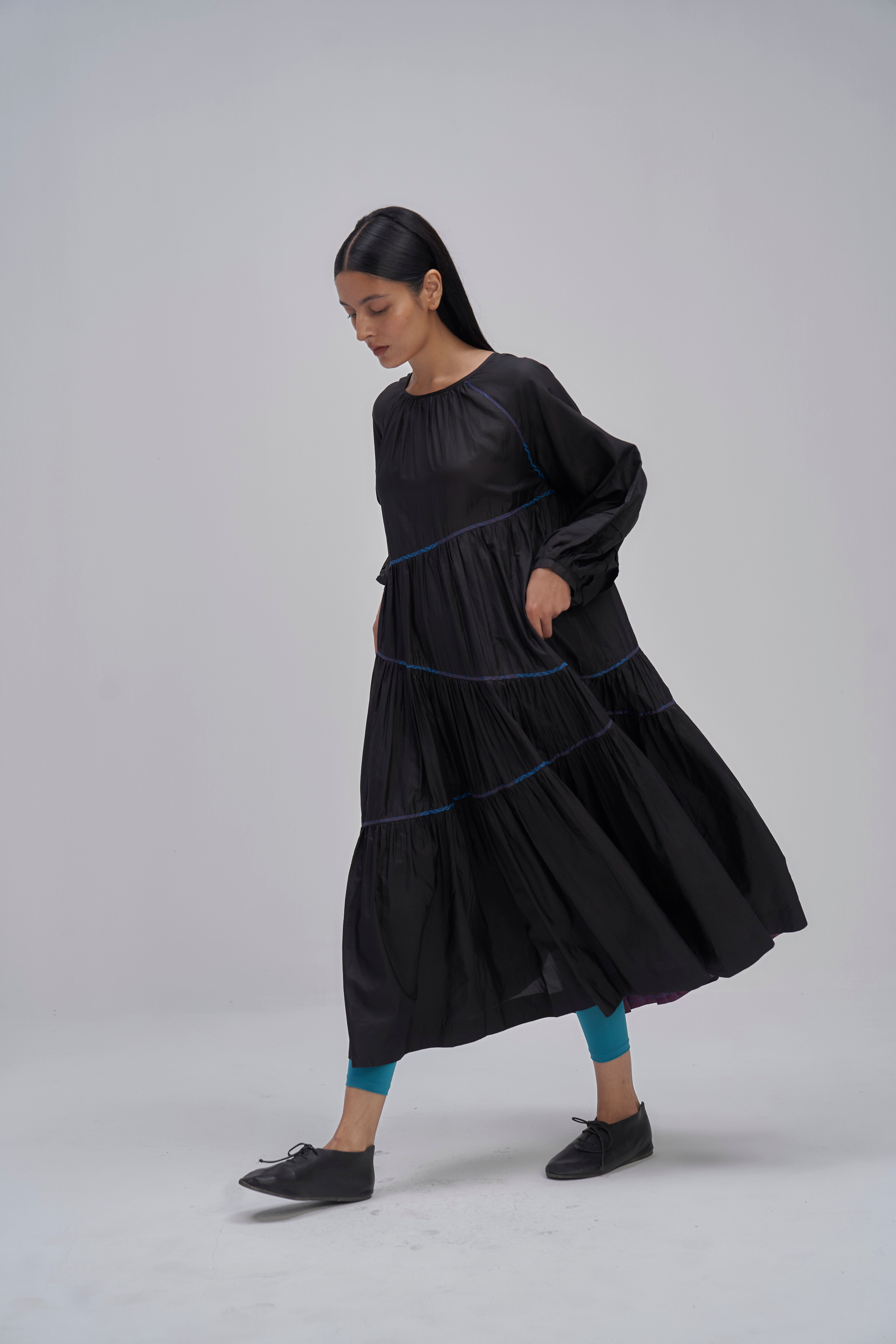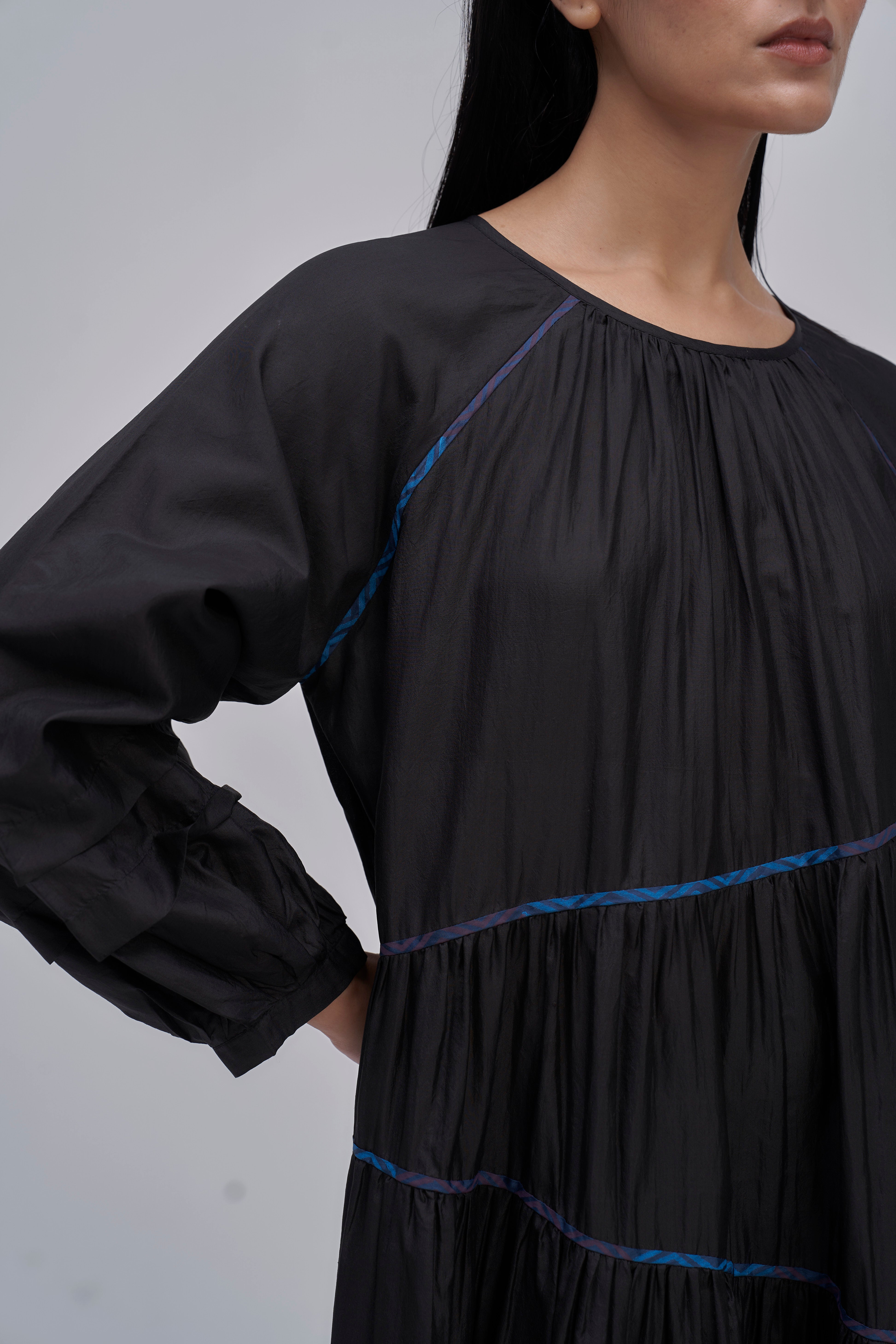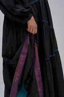 Round neckline raglan sleeve asymmetrical tier maxi dress with tuck detail on full puff sleeves and back button closure detail. Constructed in solid 100% silk fabric. Finished with contrast handblock print piping detail and collage handblock printed 100% silk fabric facing detail.