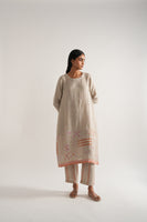 V neck midi length kurta dress in natural linen with hand block print detail paired with striper yarn dyed straight fit pants