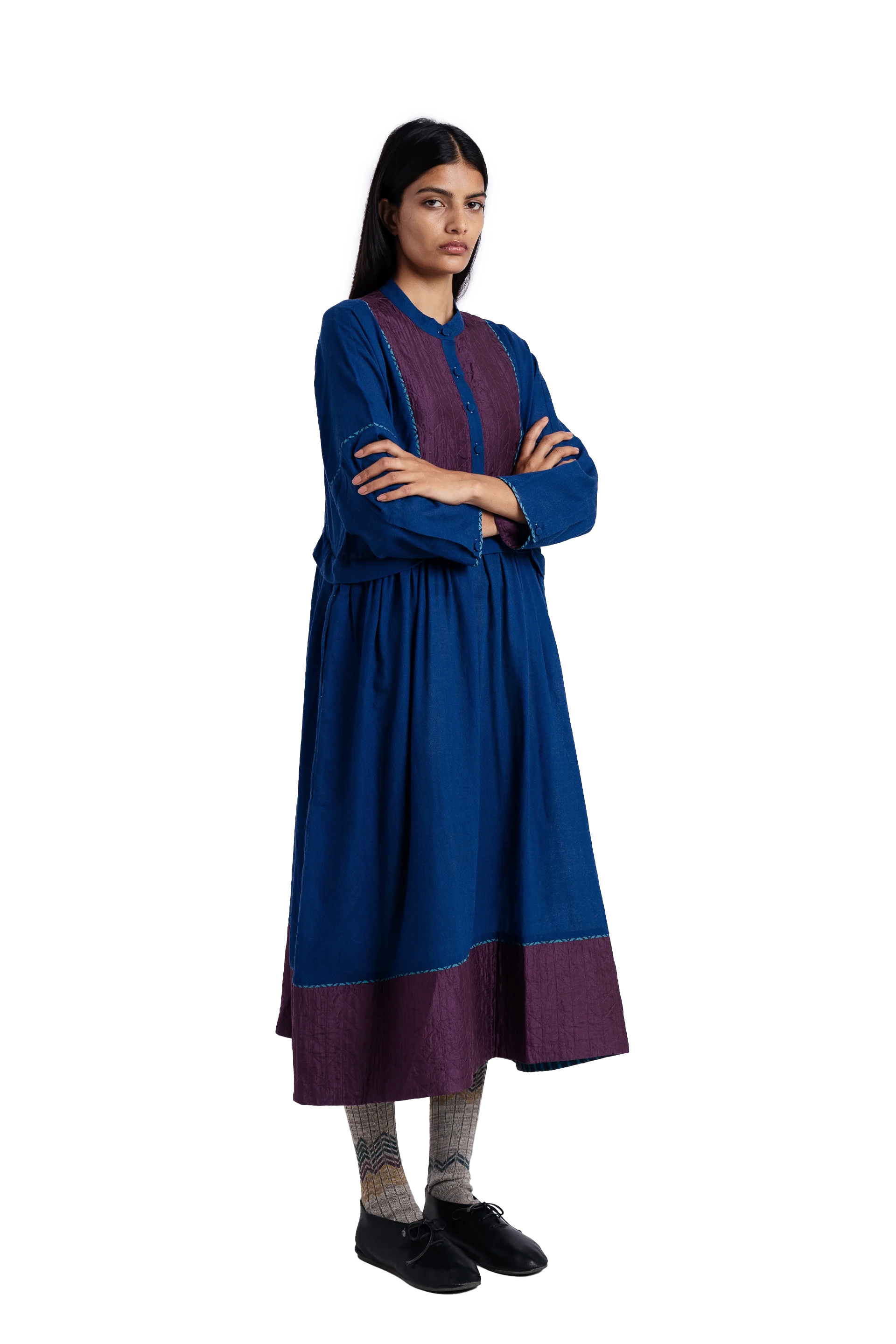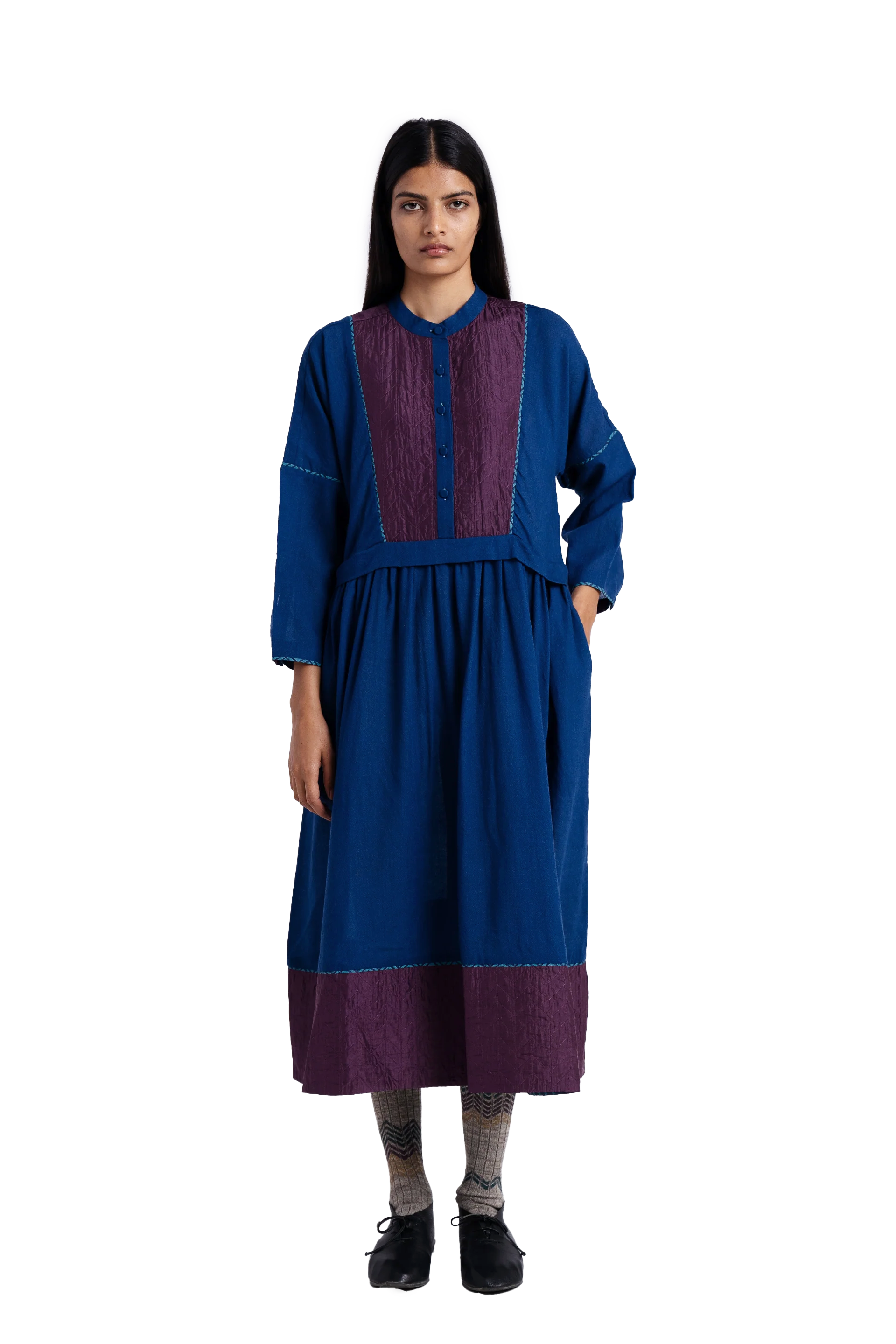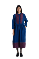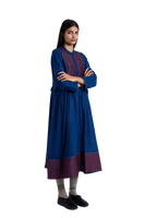 Round neckline front open buttondown full sleeves midi dress with gathers on waist and quilted silk patch at hem and yoke.Constructed in solid 100% merino wool. Finished with contrast handblock print piping detail and collage handblock print 100% silk fabric facing detail.