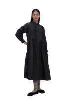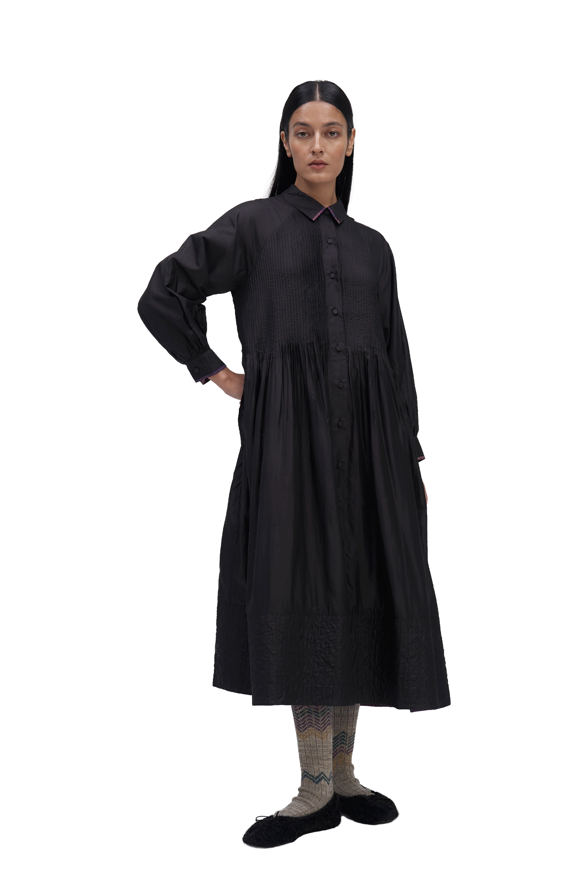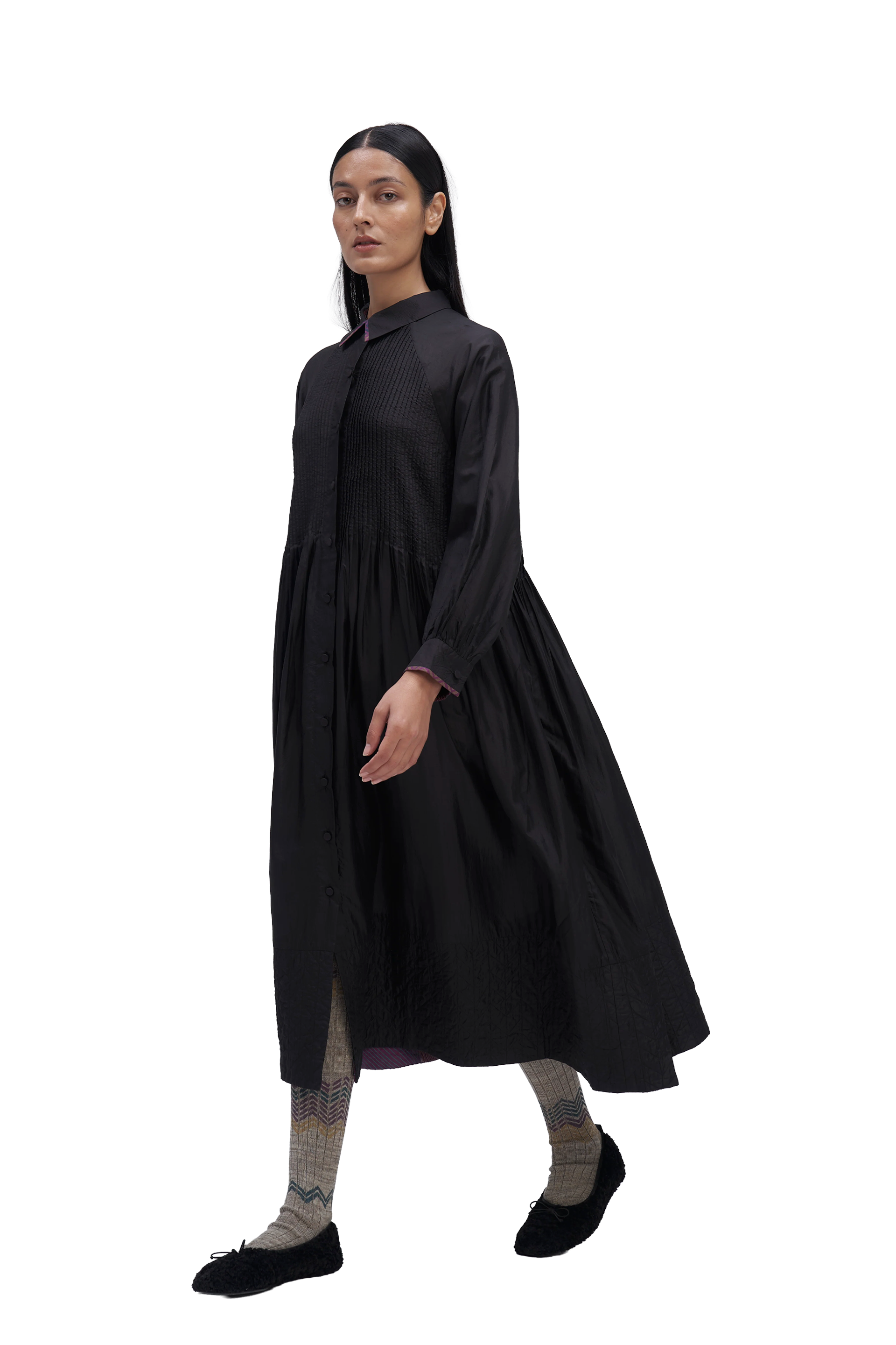 Relaxed fit front open button down collar midi dress with full puff sleeves, pintucks allover the bodice and quilting detail on hem. Constructed in solid 100% silk fabric. Finished with contrast hand block print 100% silk fabric piping and facing detail.