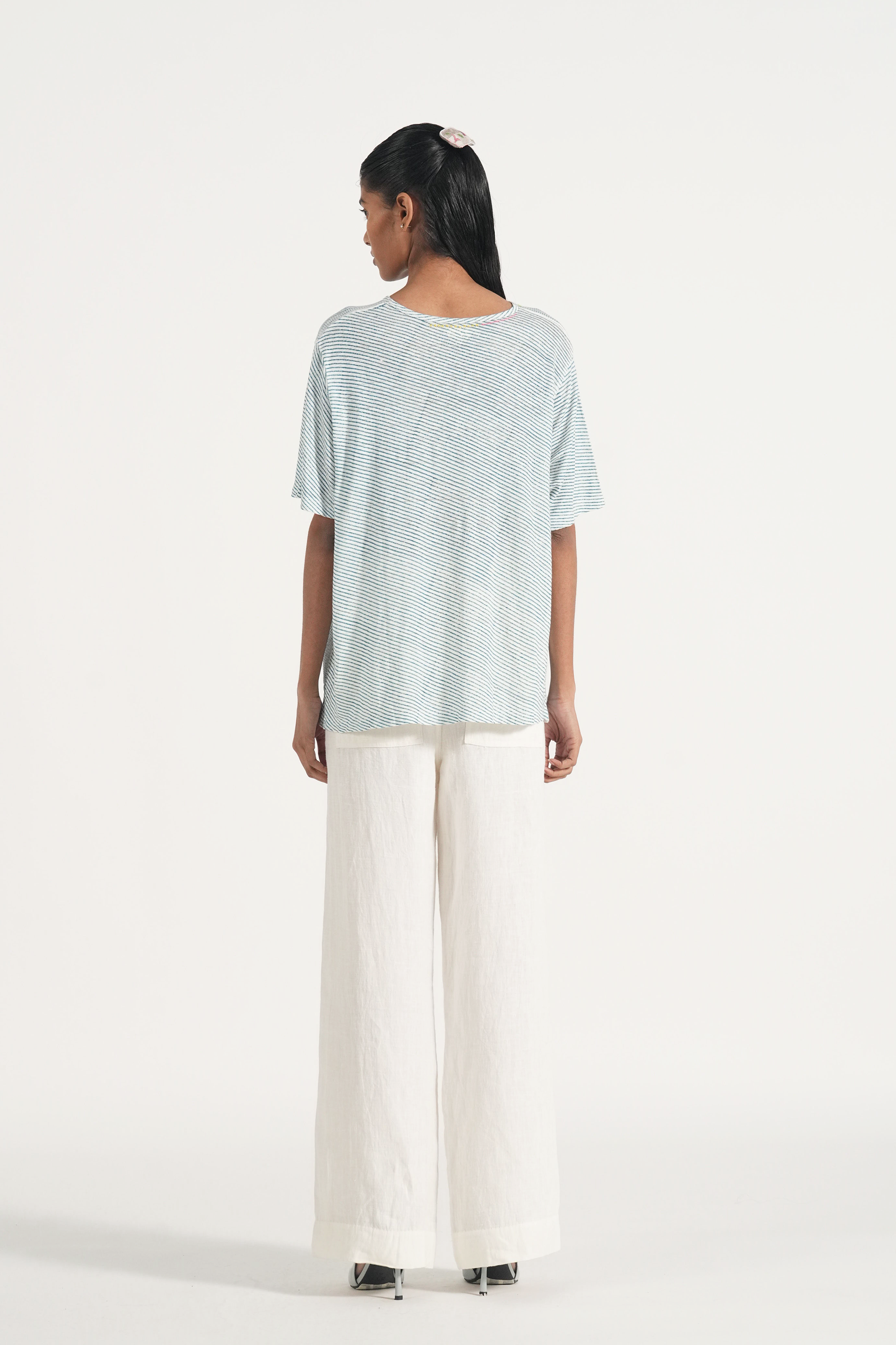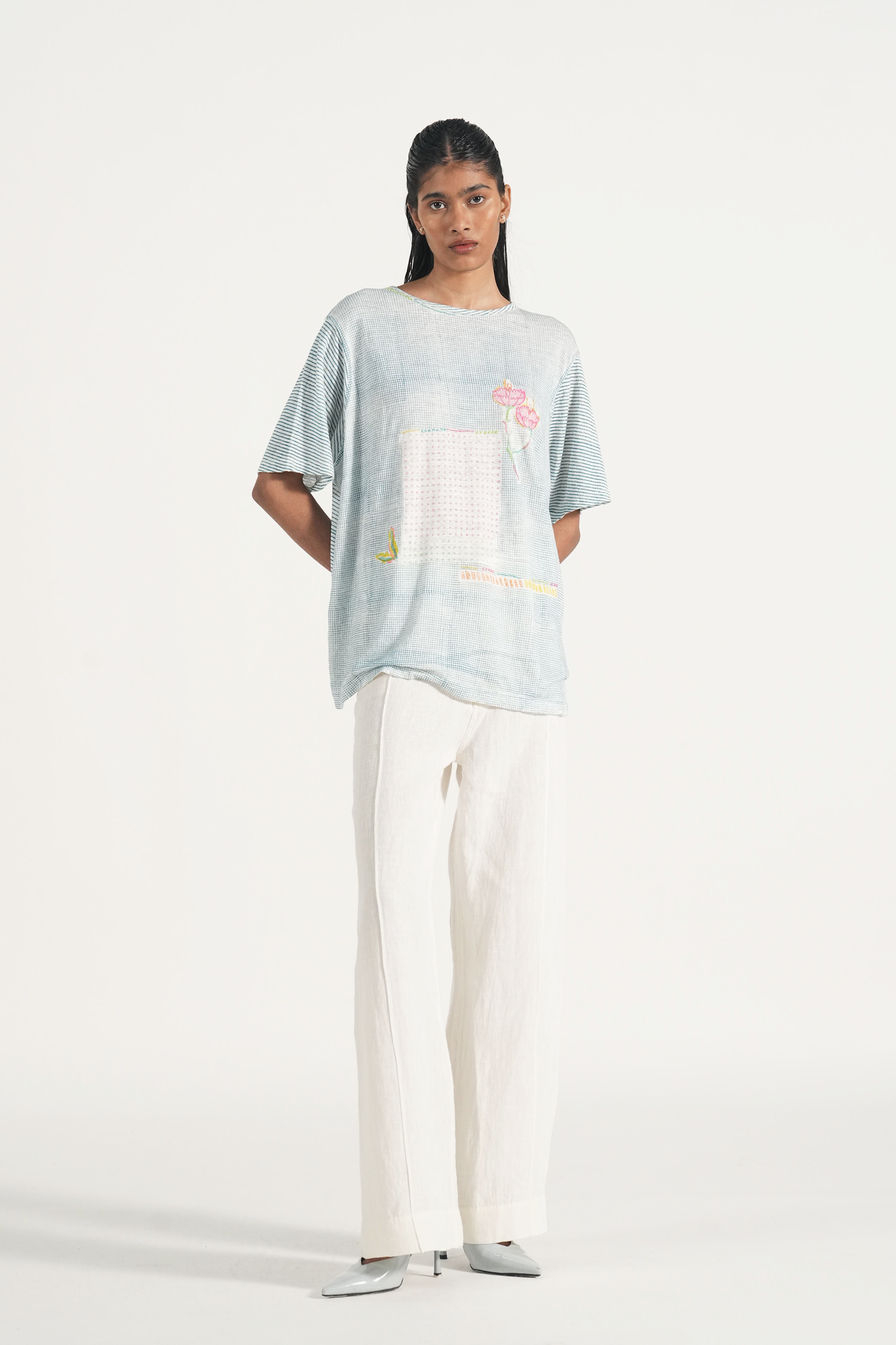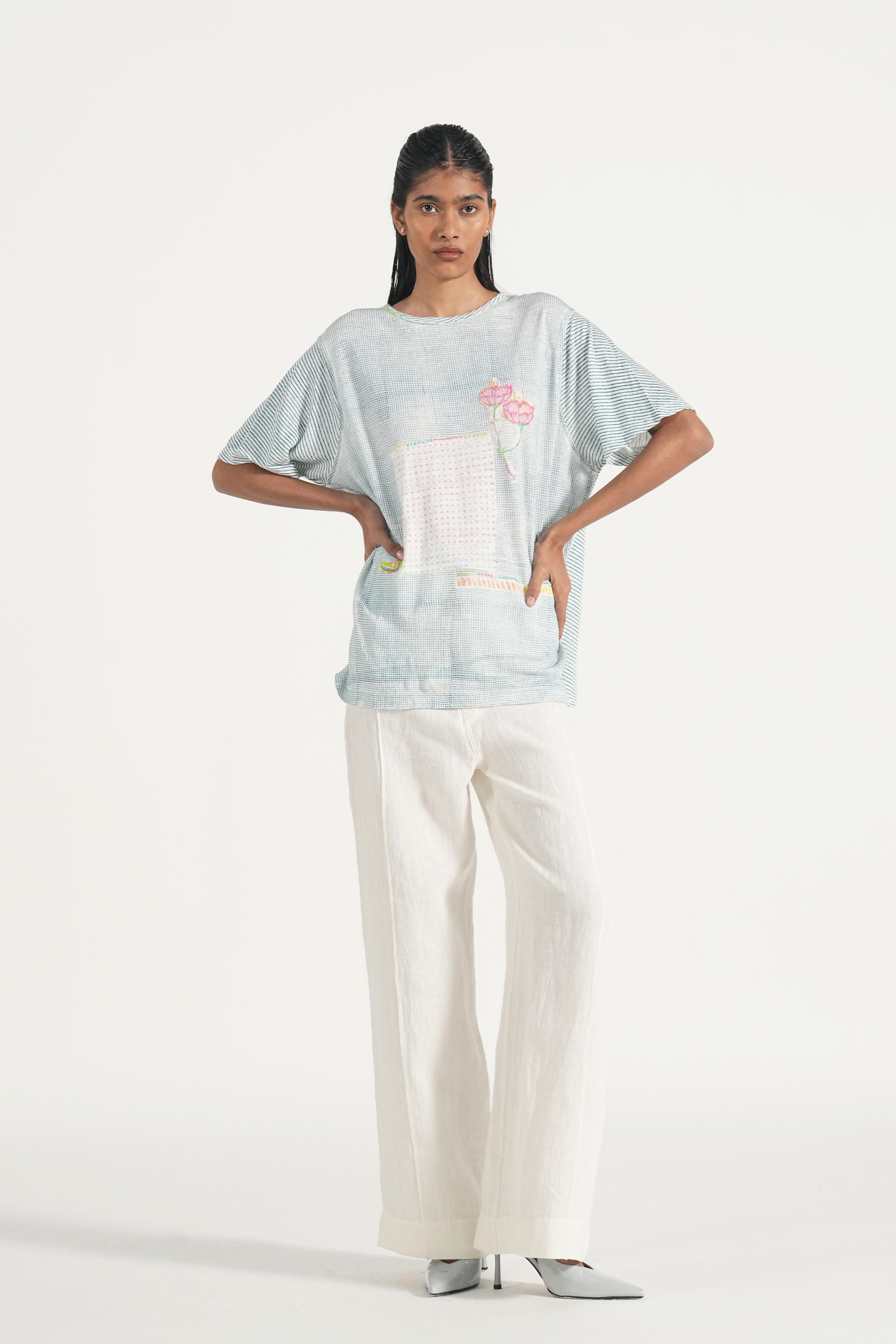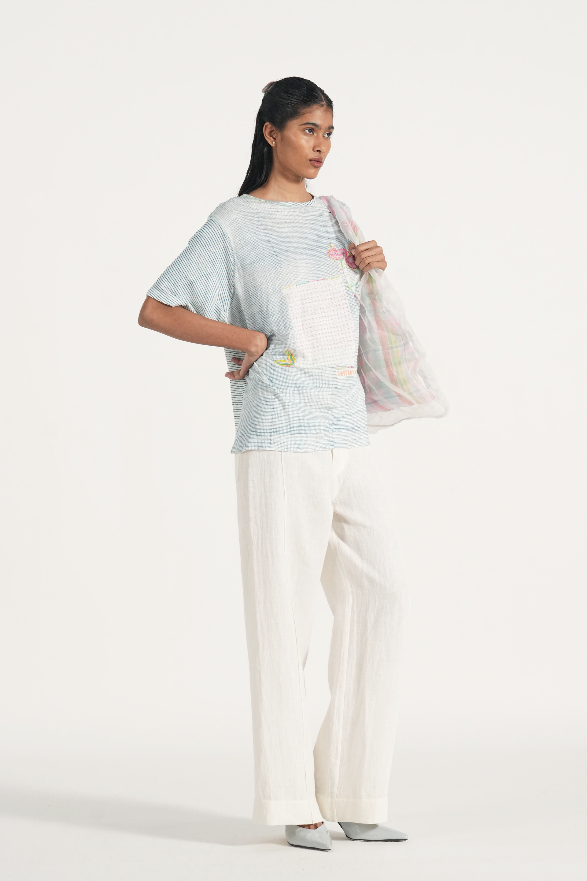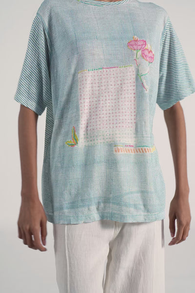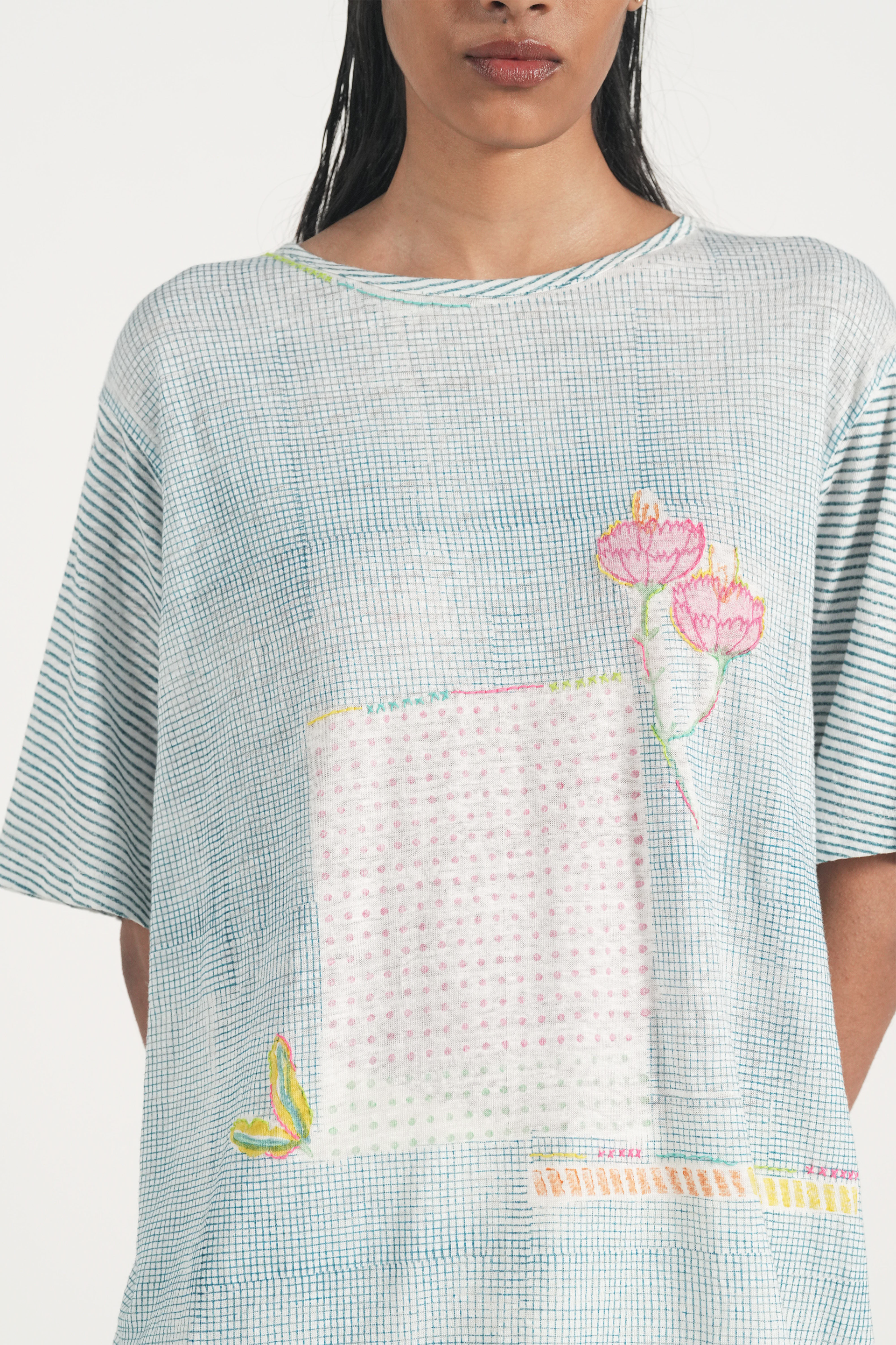 Straight summer t shirt in hand blocked fine checks and placement motifs print with hand embroidery