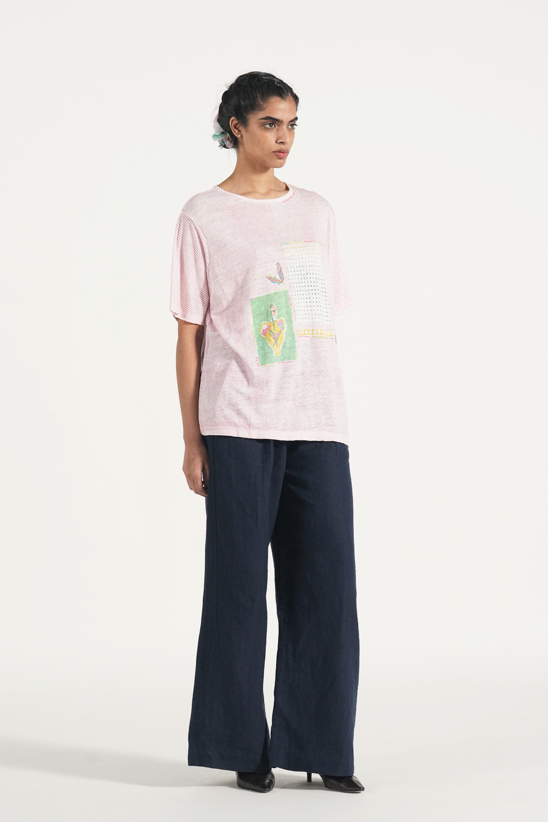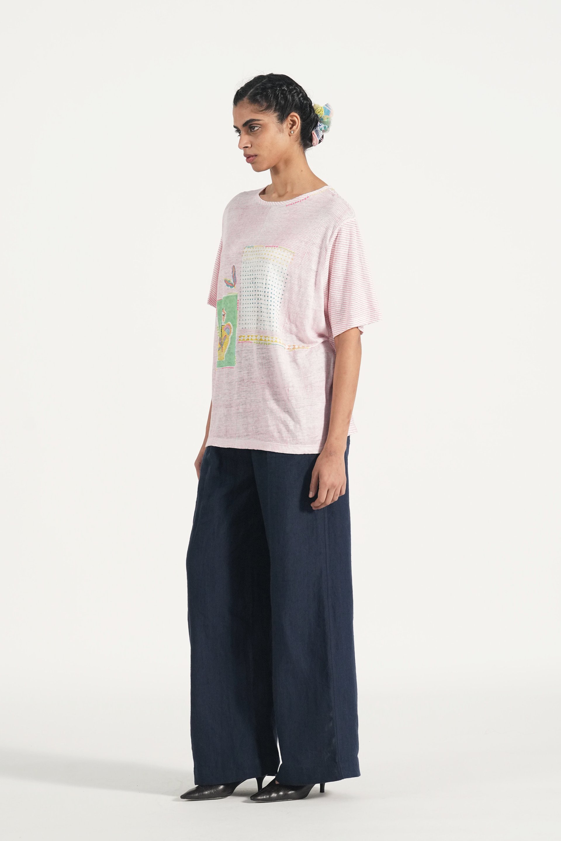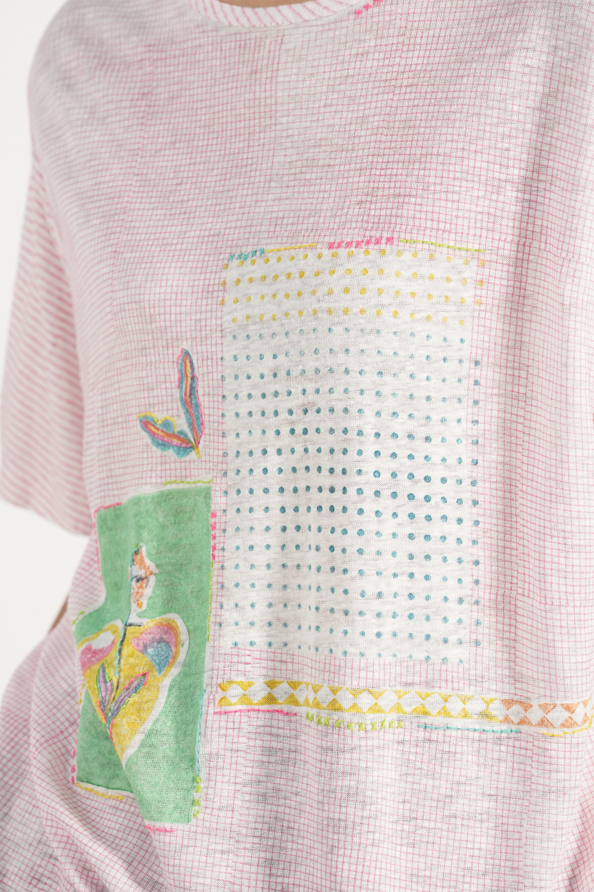 Straight summer t shirt in hand blocked diagonal stripes and placement motifs print with hand embroidery