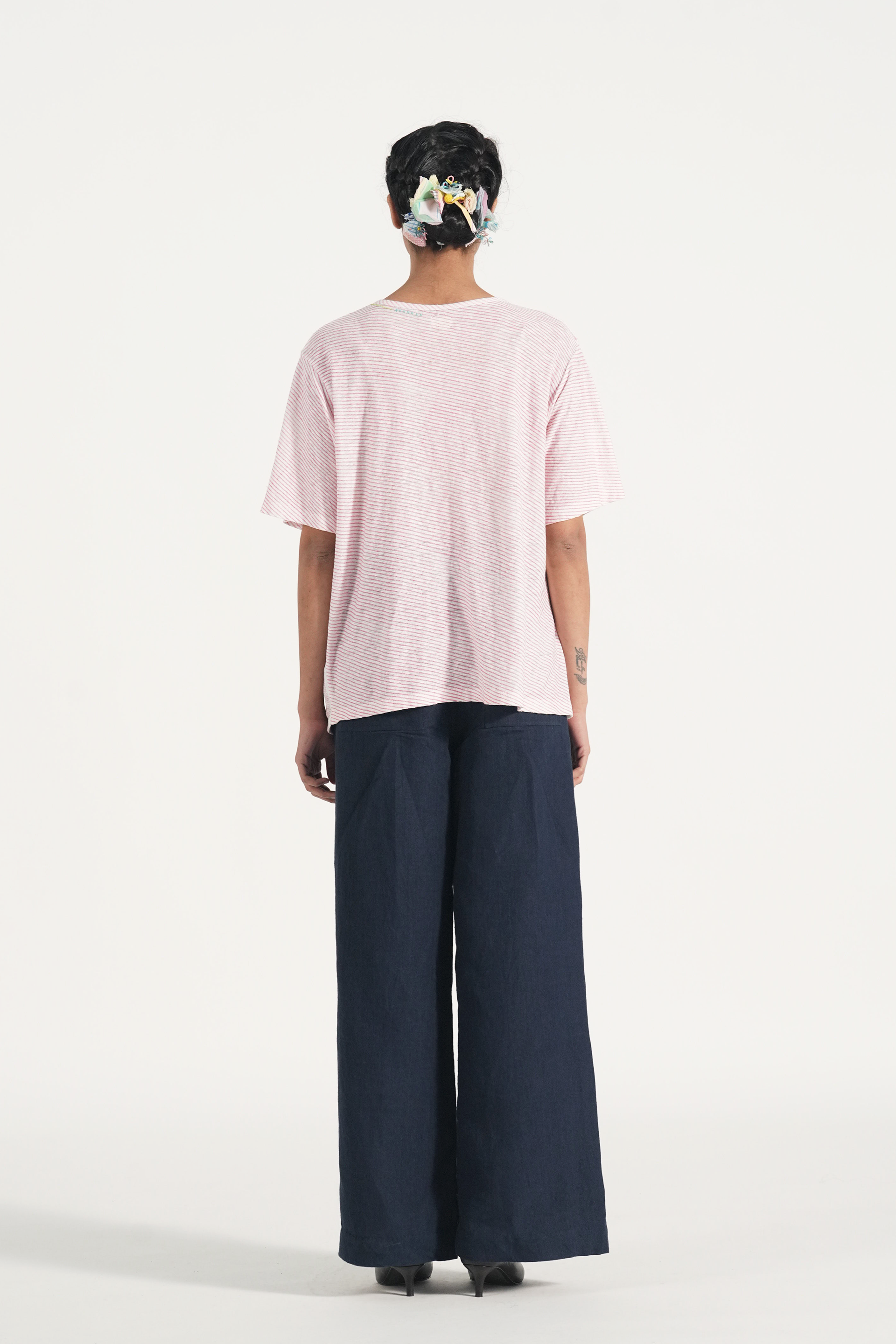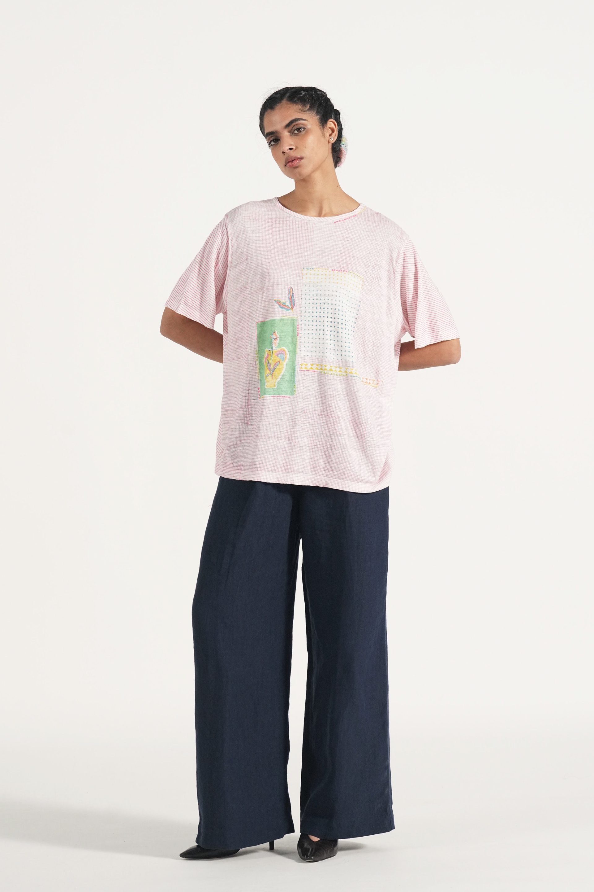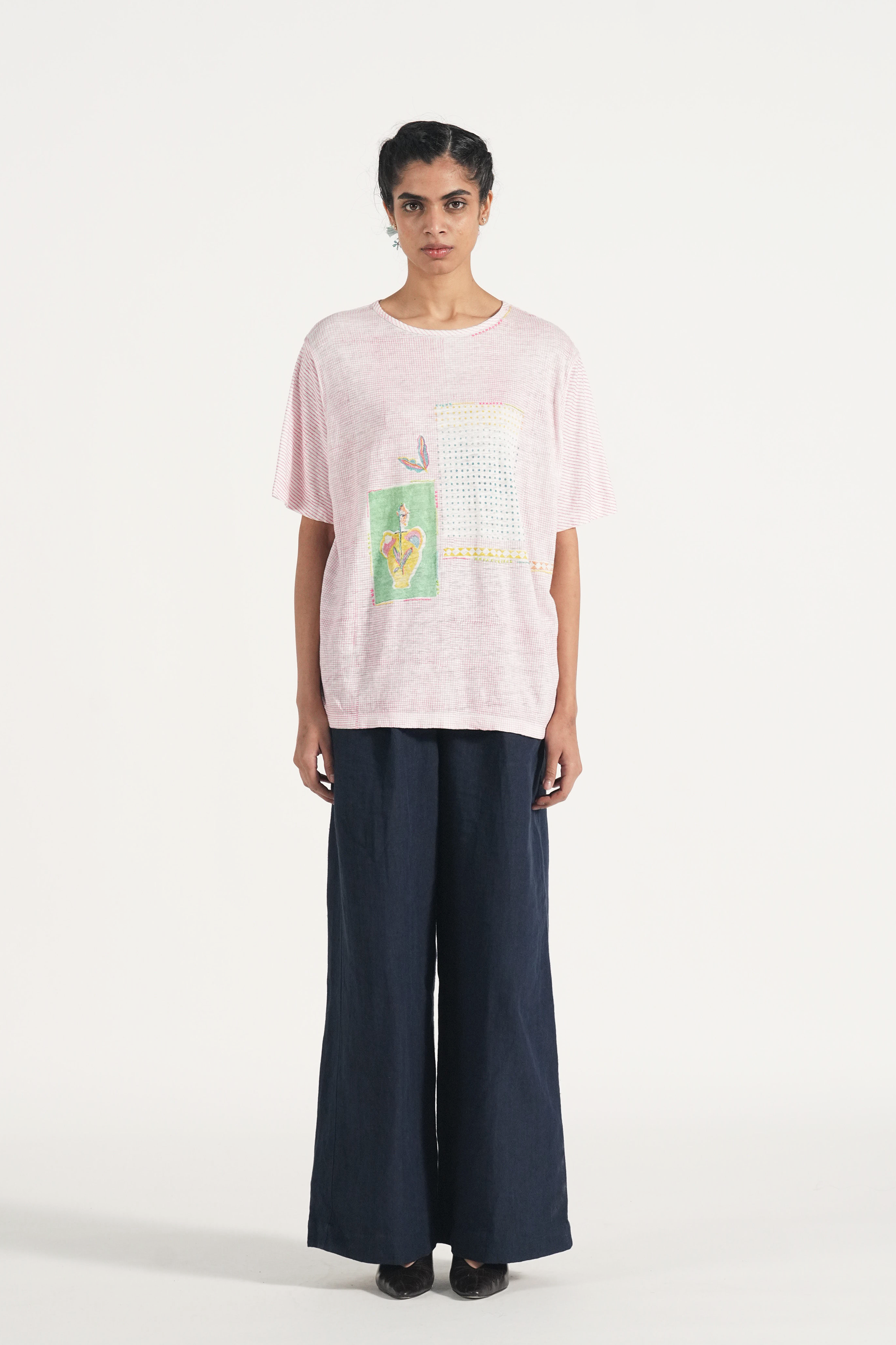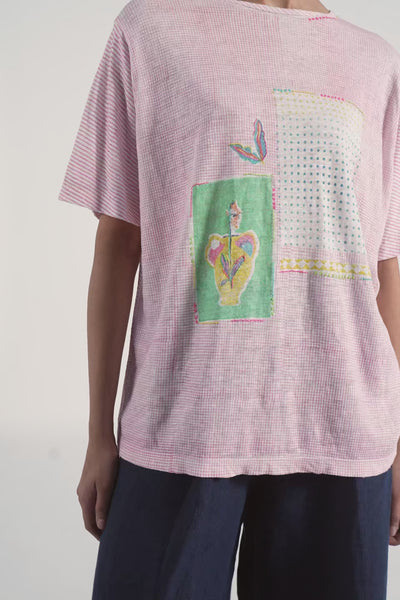 Straight summer t shirt in hand blocked diagonal stripes and placement motifs print with hand embroidery