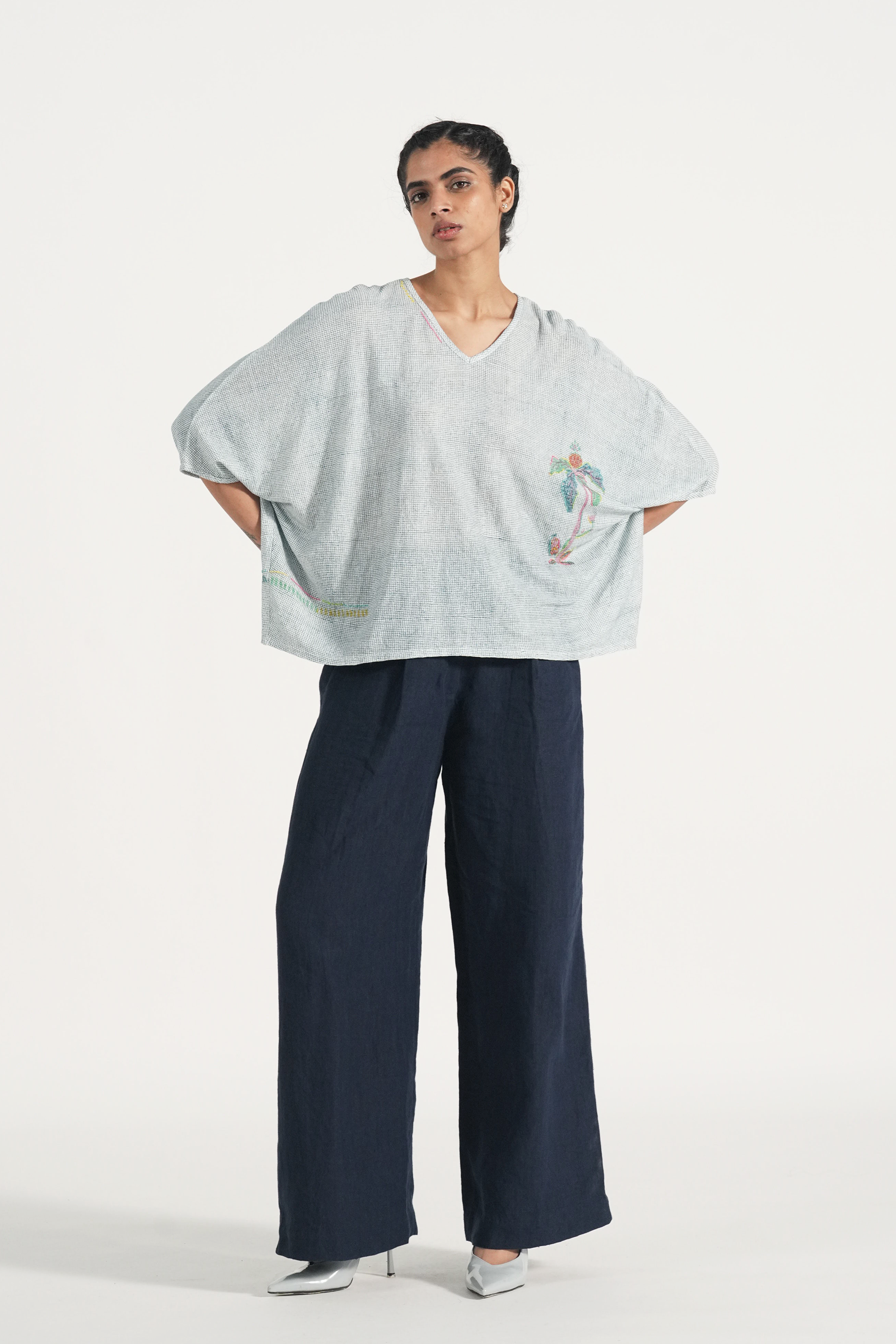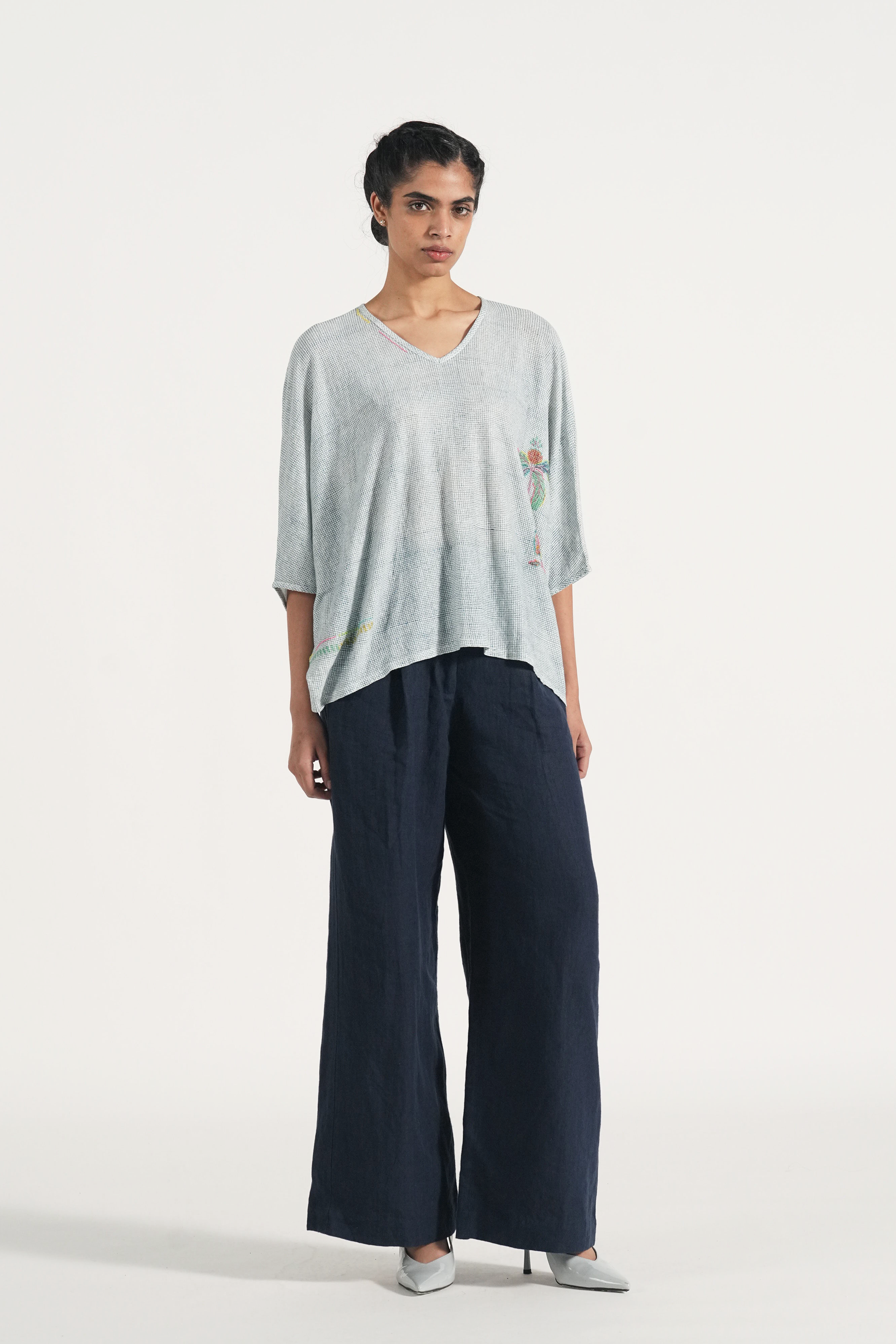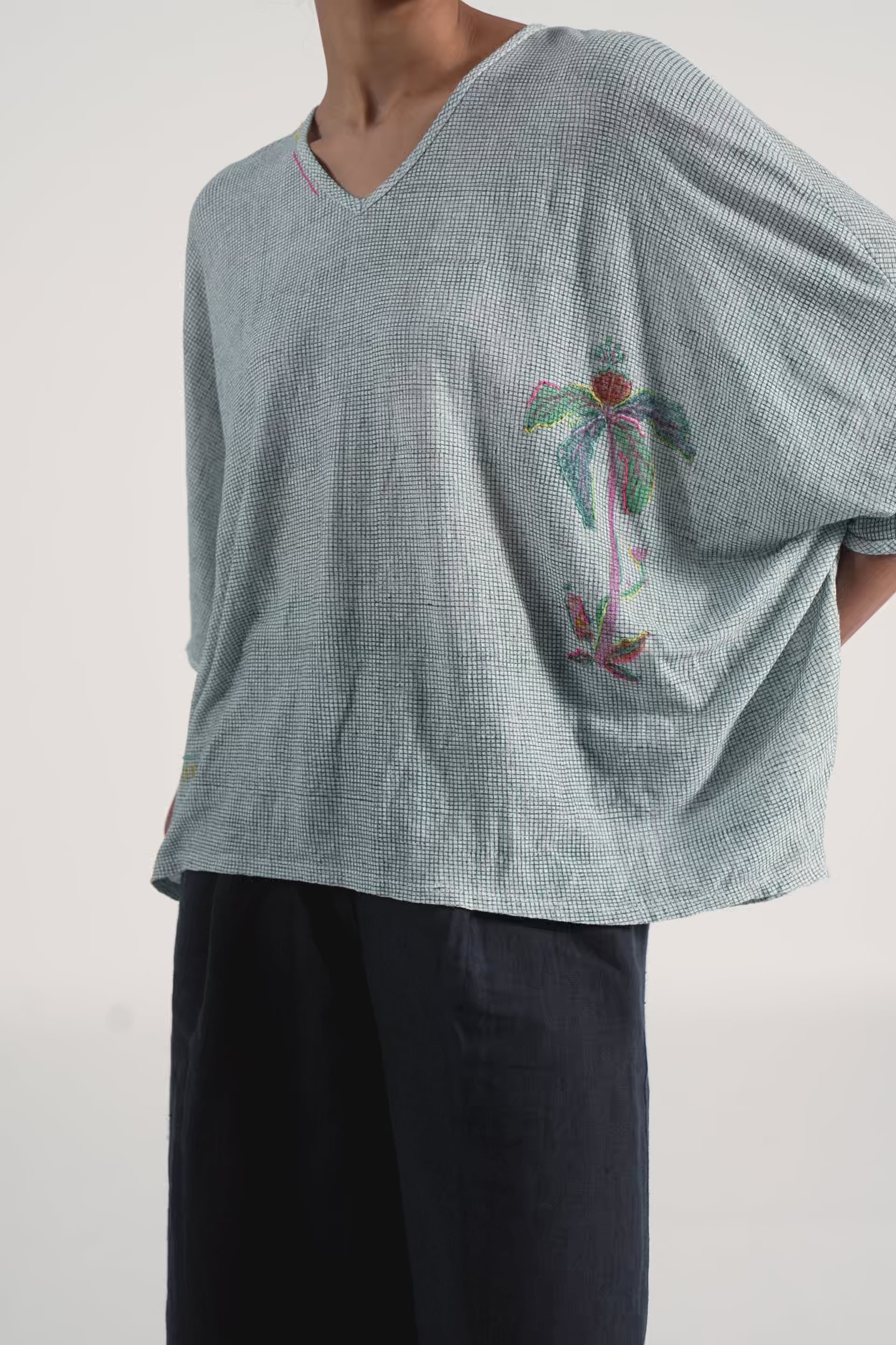 Batwing v neck tee in hand blocked fine checks and placement motifs print with hand embroidery