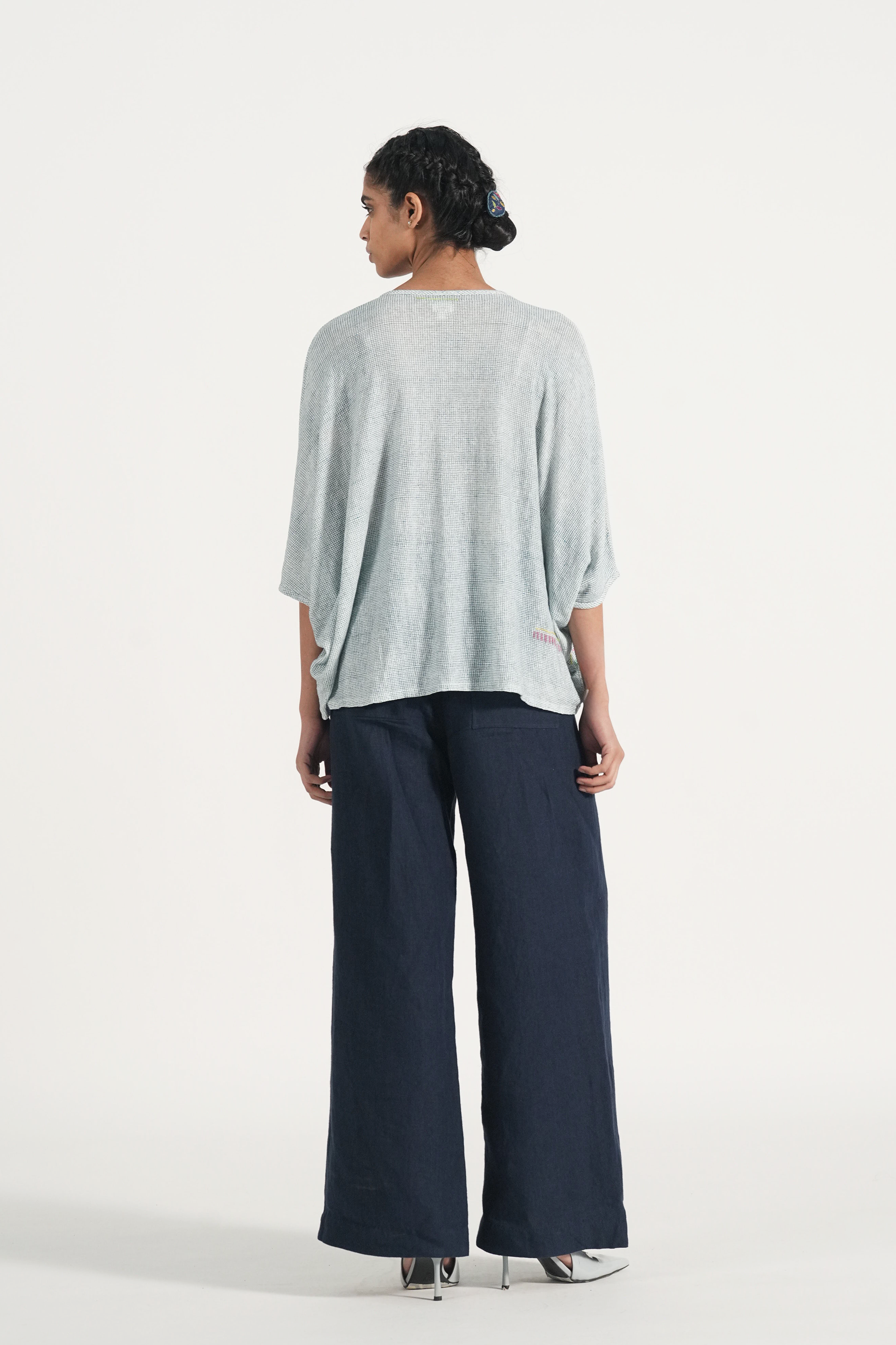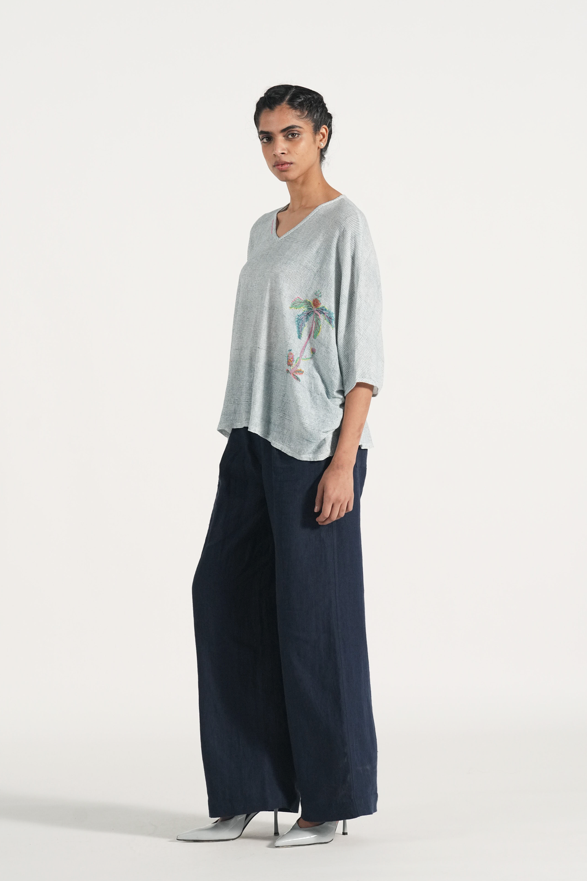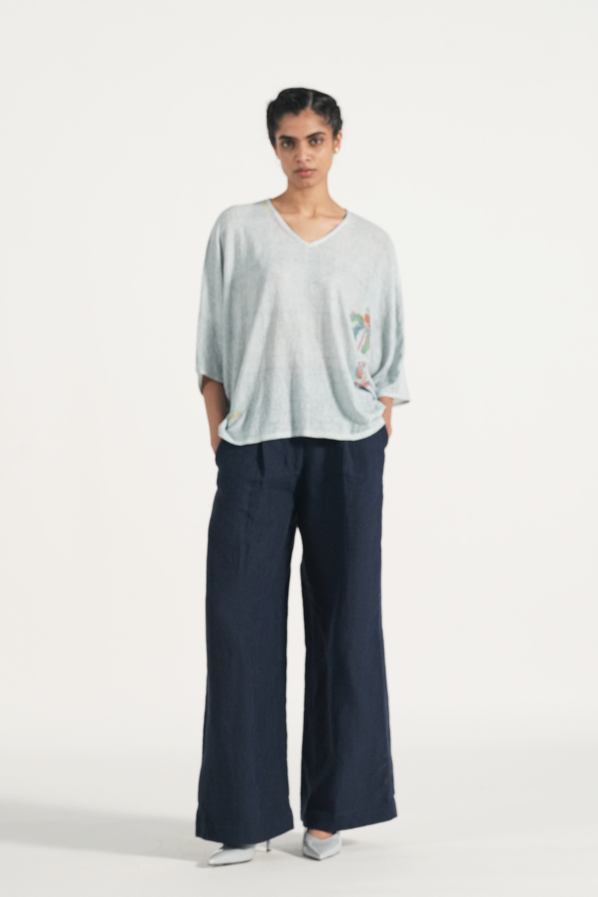Batwing v neck tee in hand blocked fine checks and placement motifs print with hand embroidery