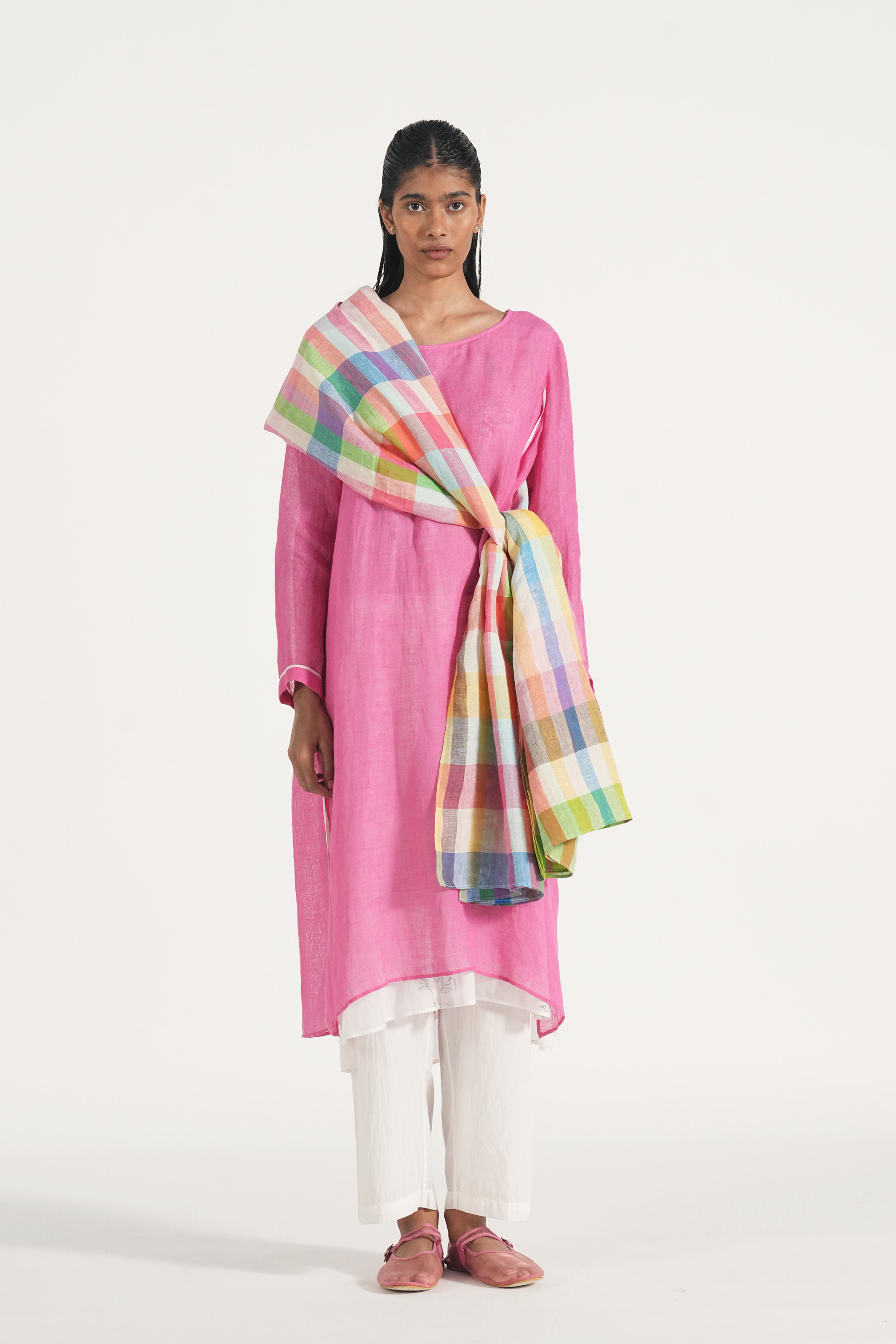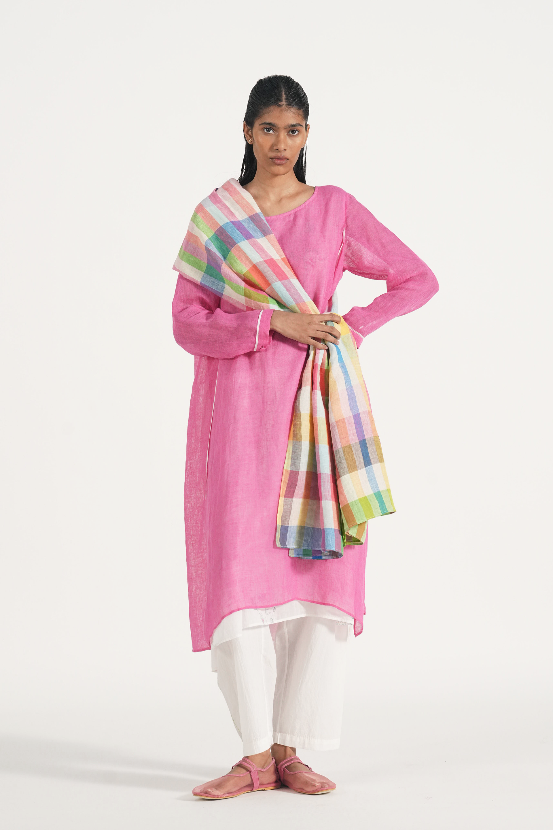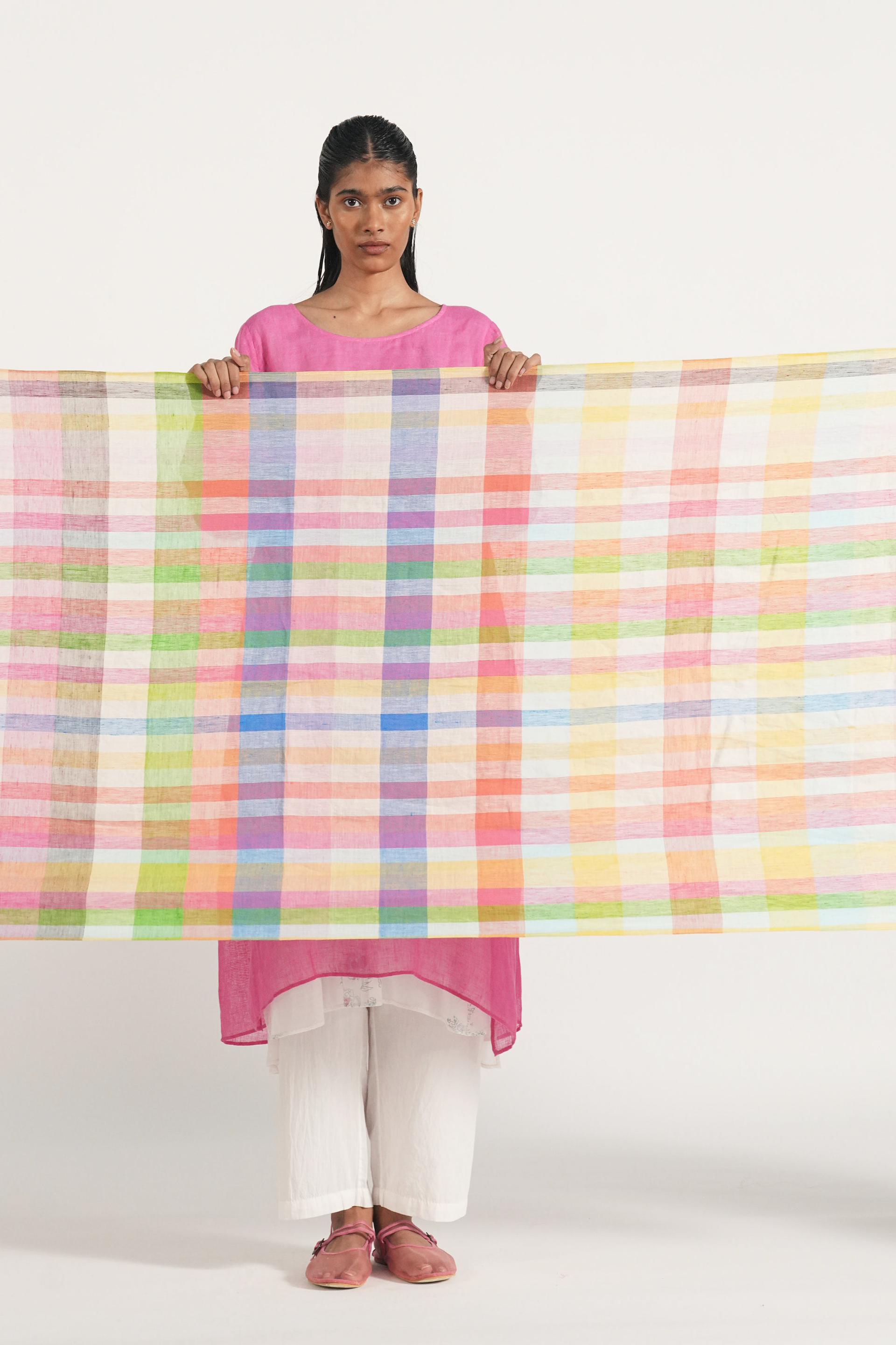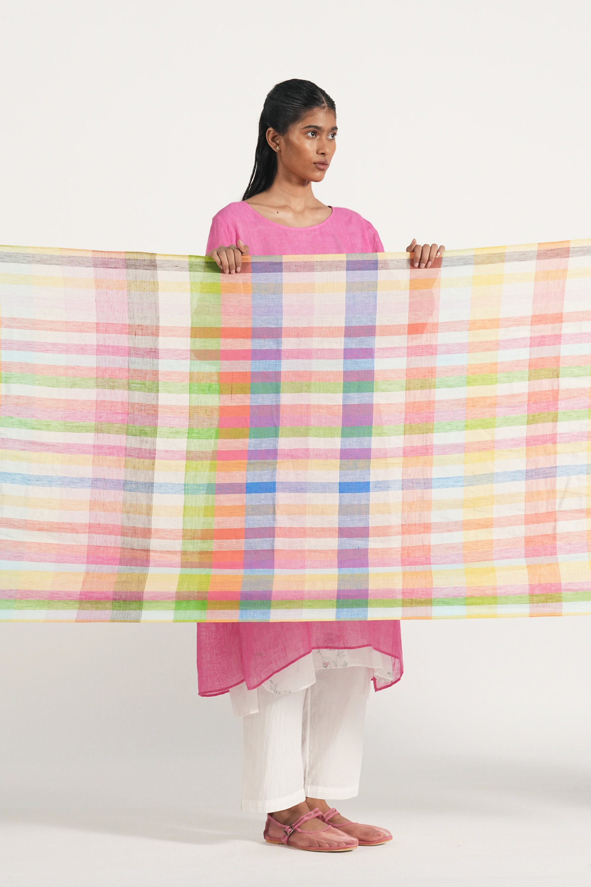 Easy summer stole in multicolor handwoven linen checks