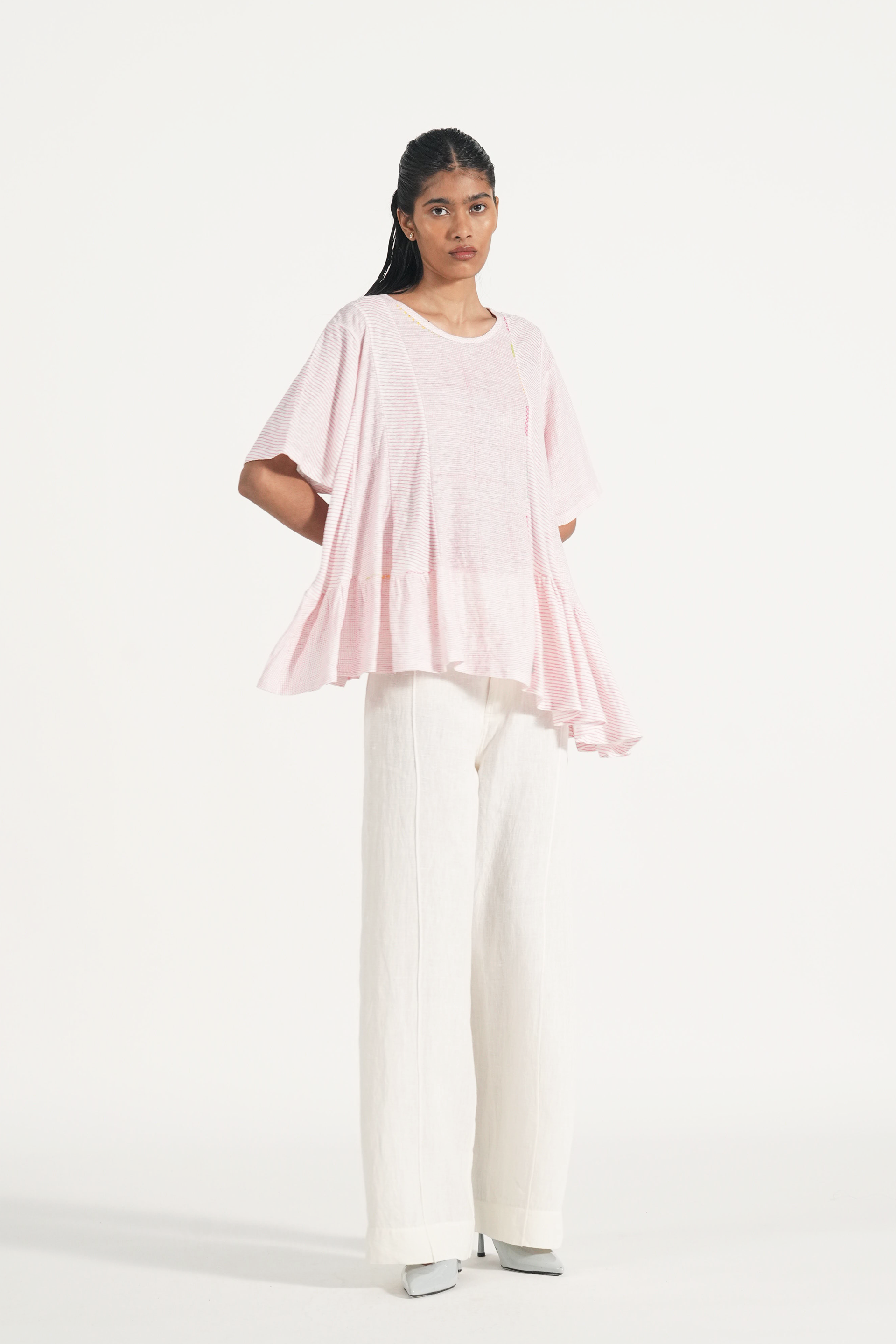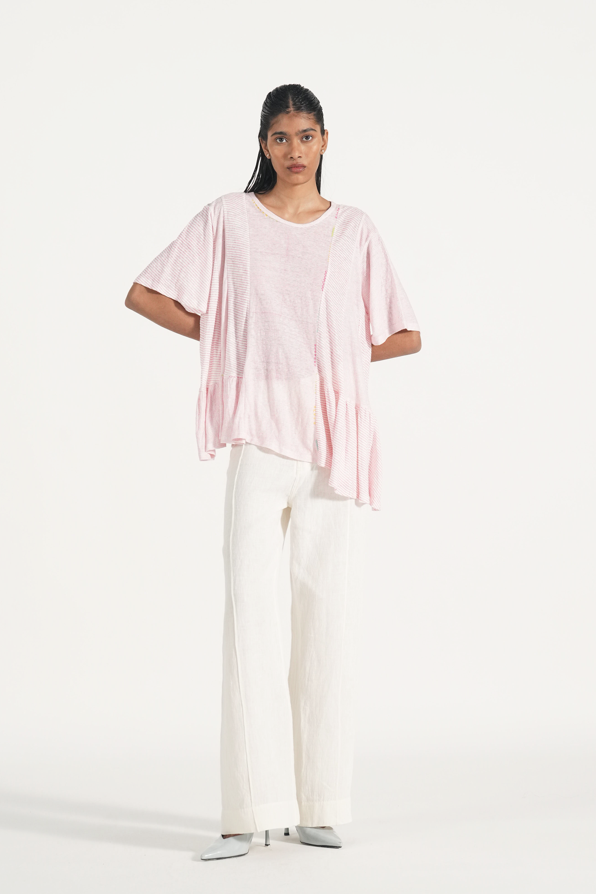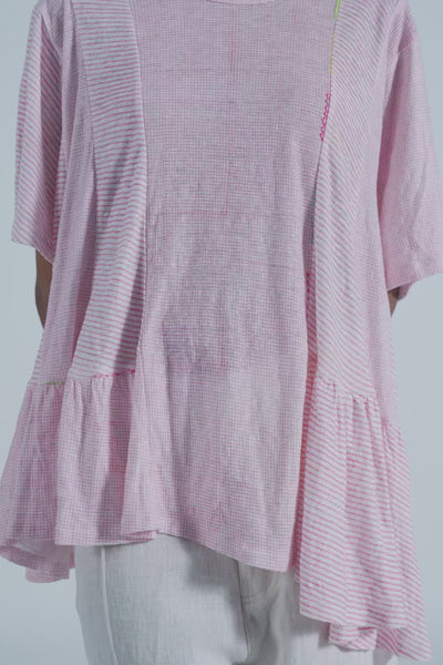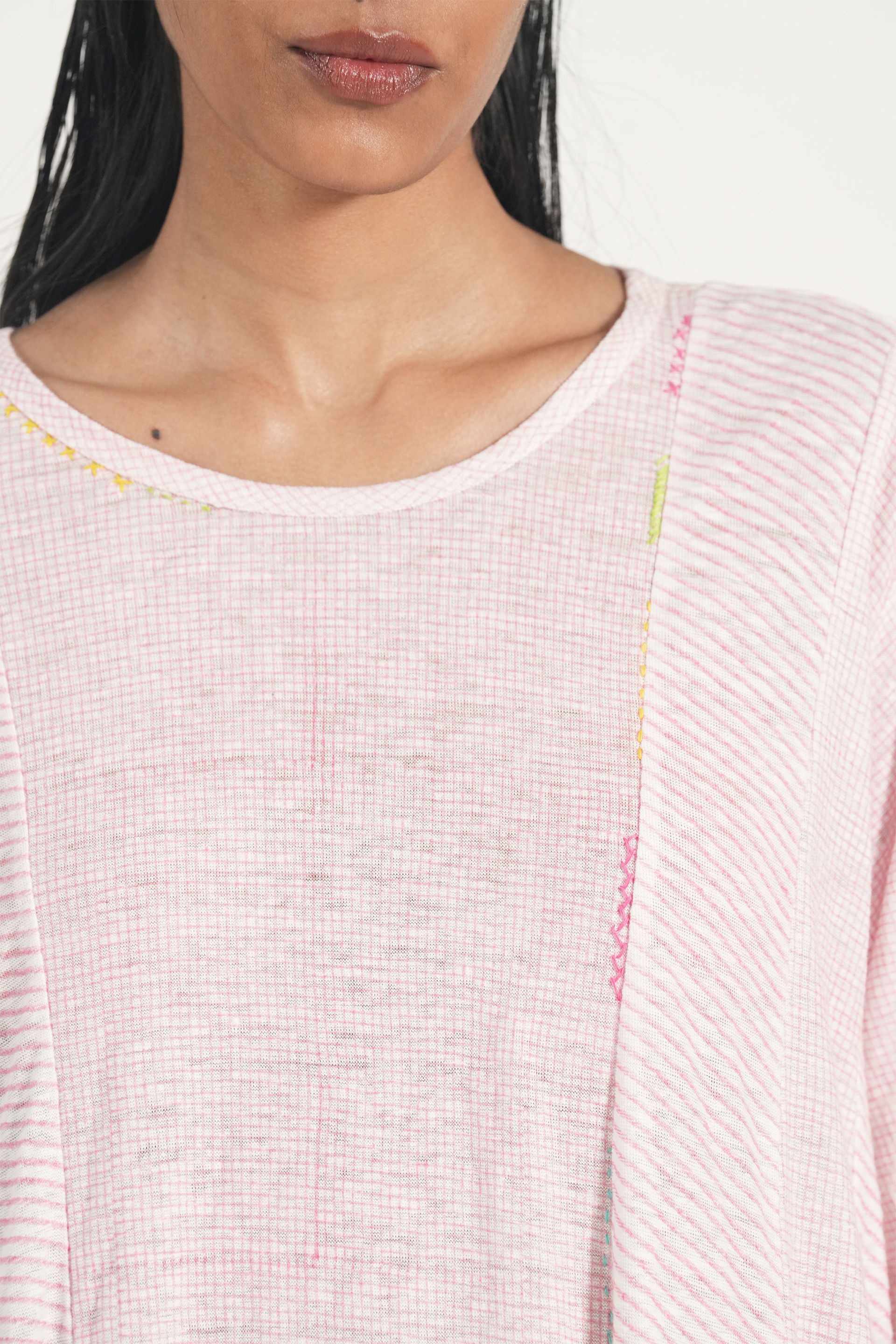 Flared patchwork long tee in hand block print diagonal stripes and checks