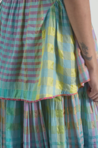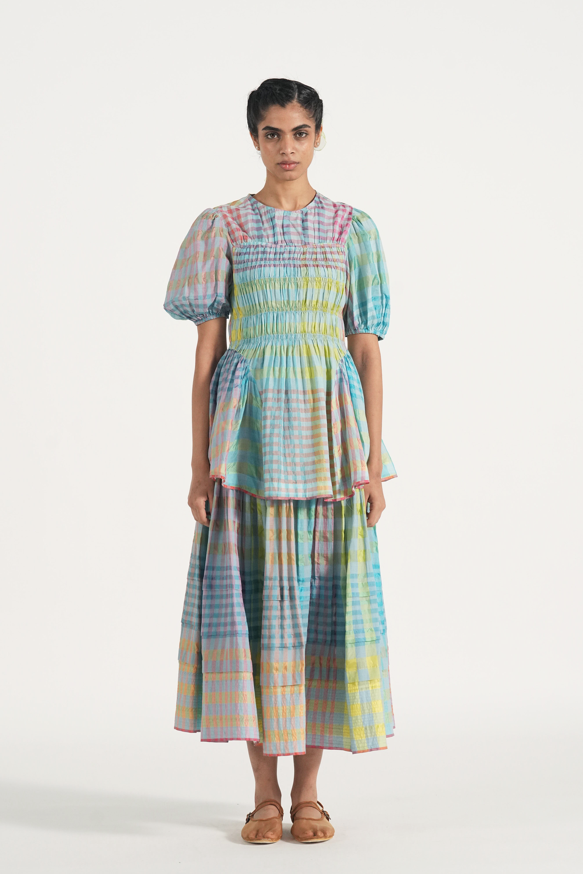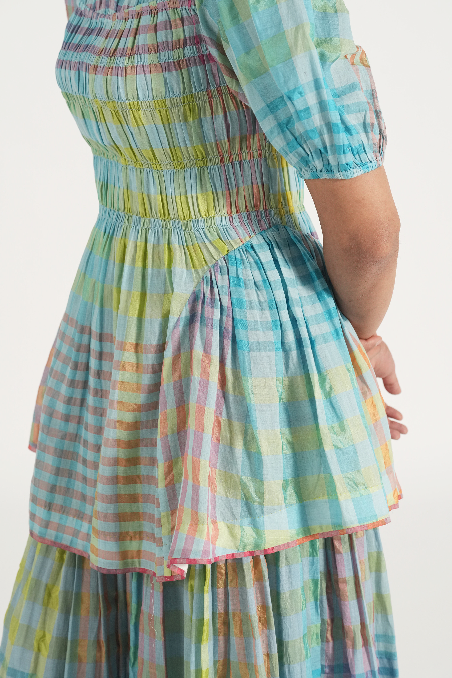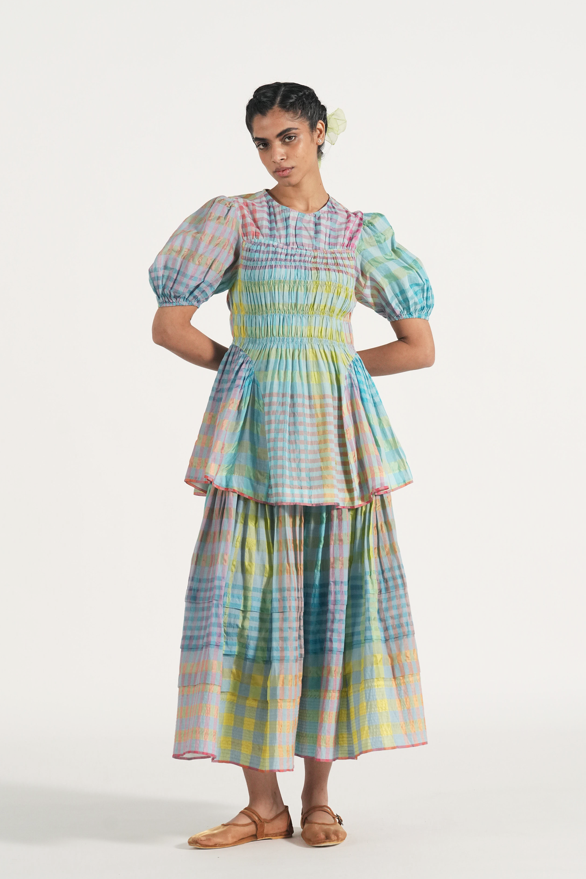 Rouched top with puff sleeves and a snug waist in multicolor handwoven cotton silk checks with contrast selvage