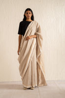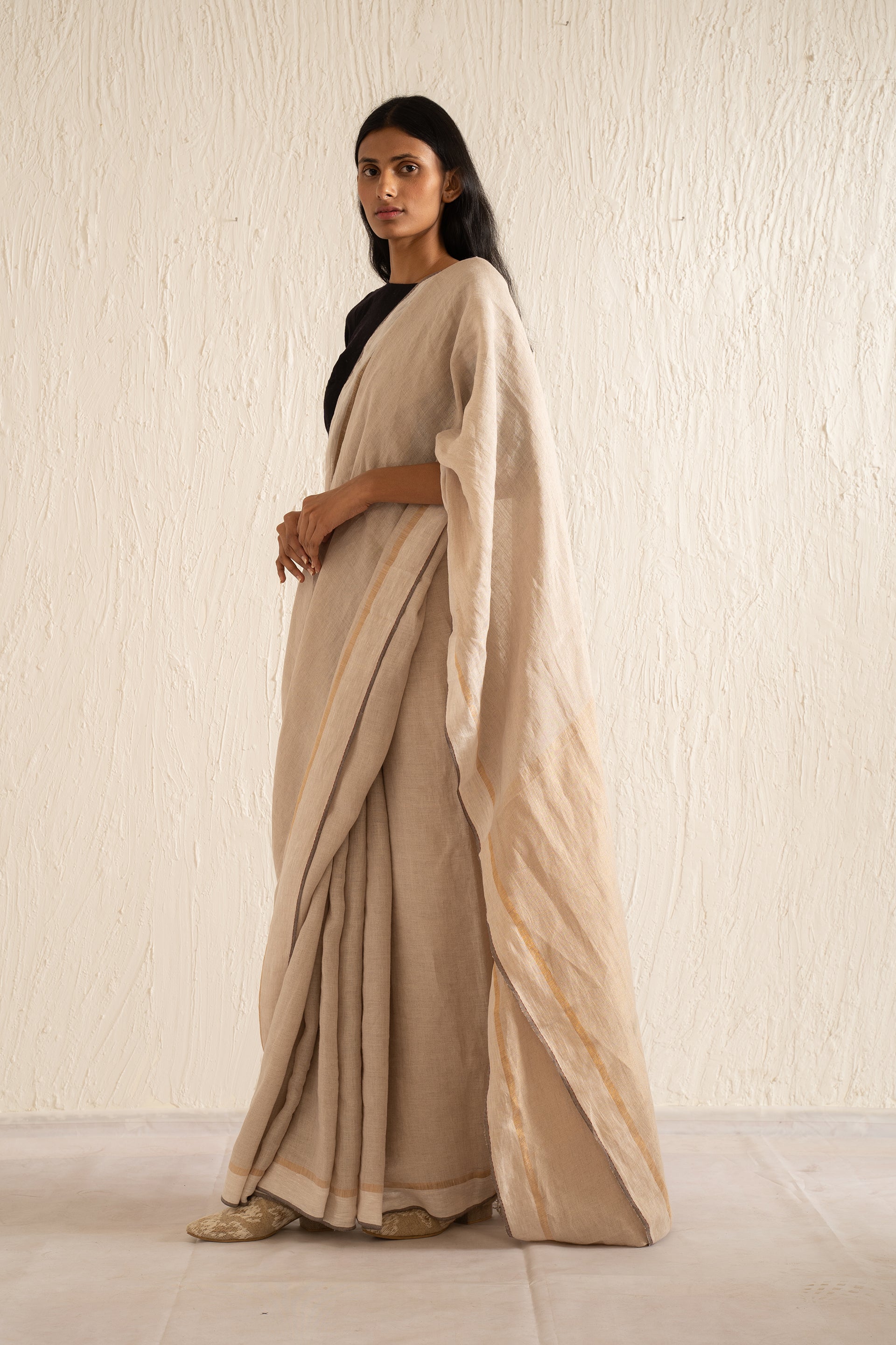 Linen saree with gold zari stripe on contrast border, accented with fringe on edge