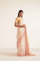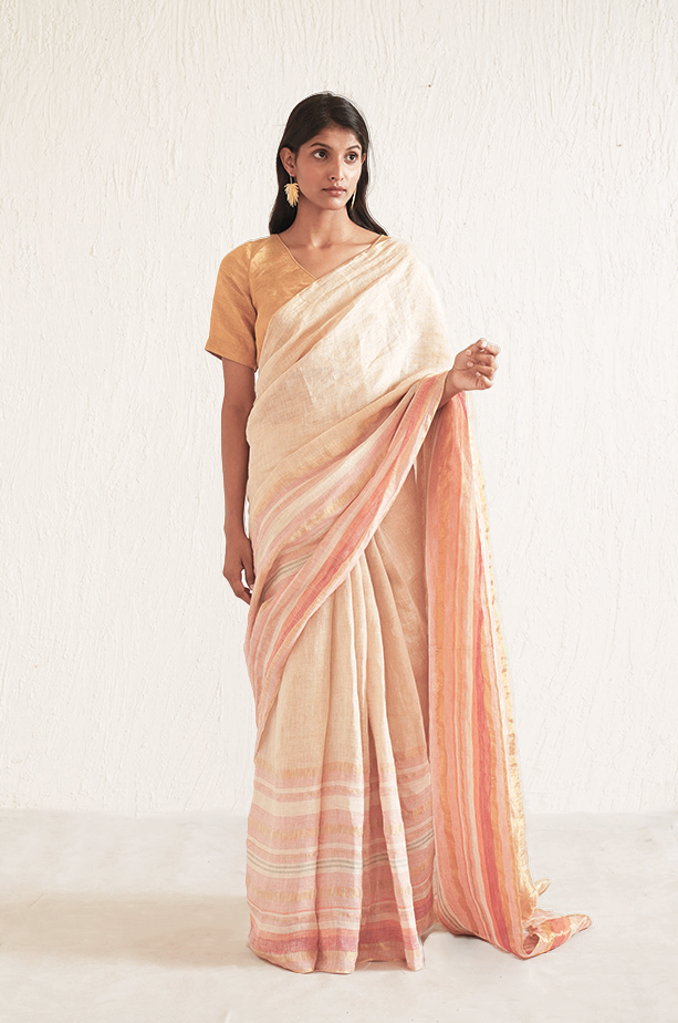Saree with multicolor zari stripes and gold selvedge detail constructed in linen-zari blend