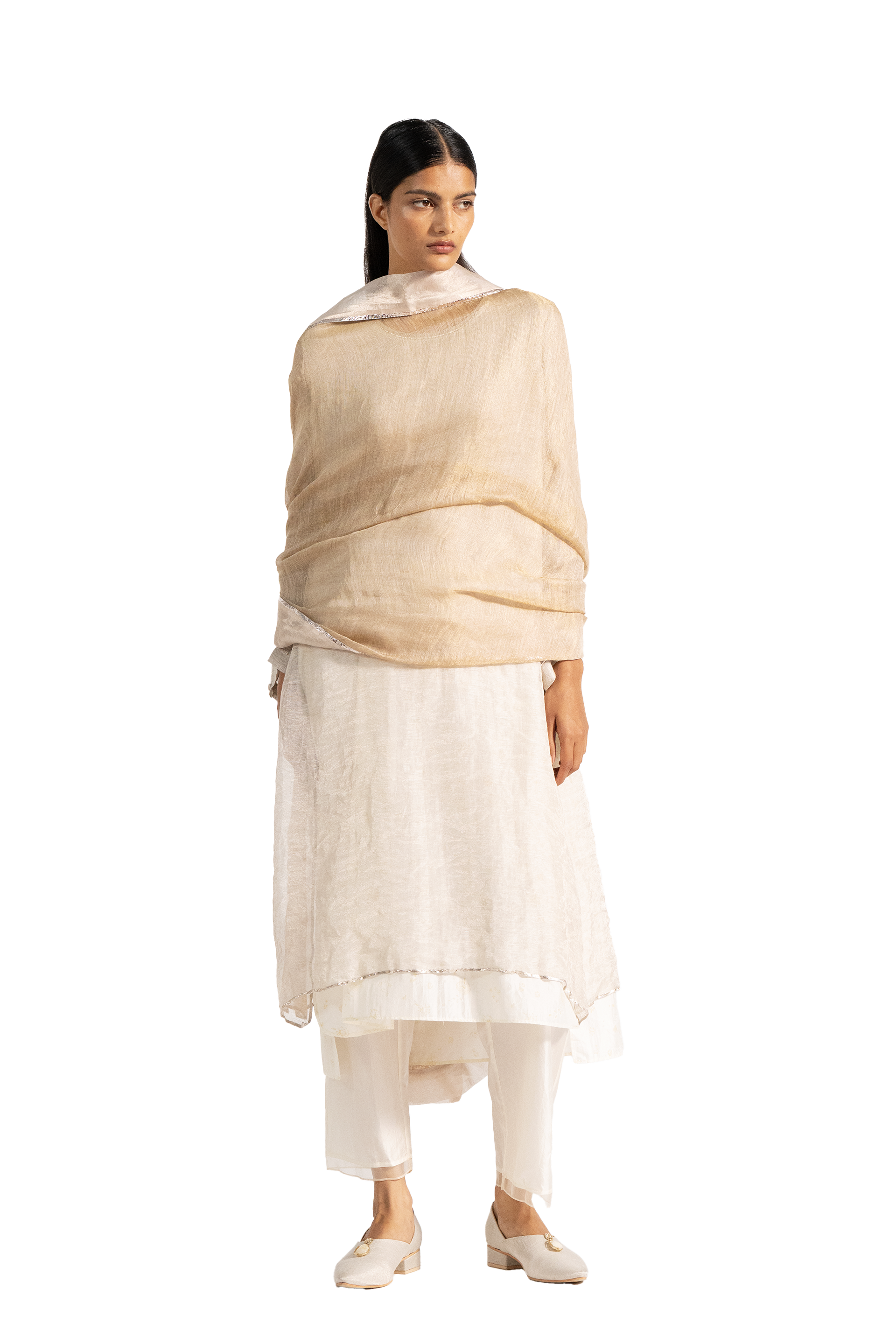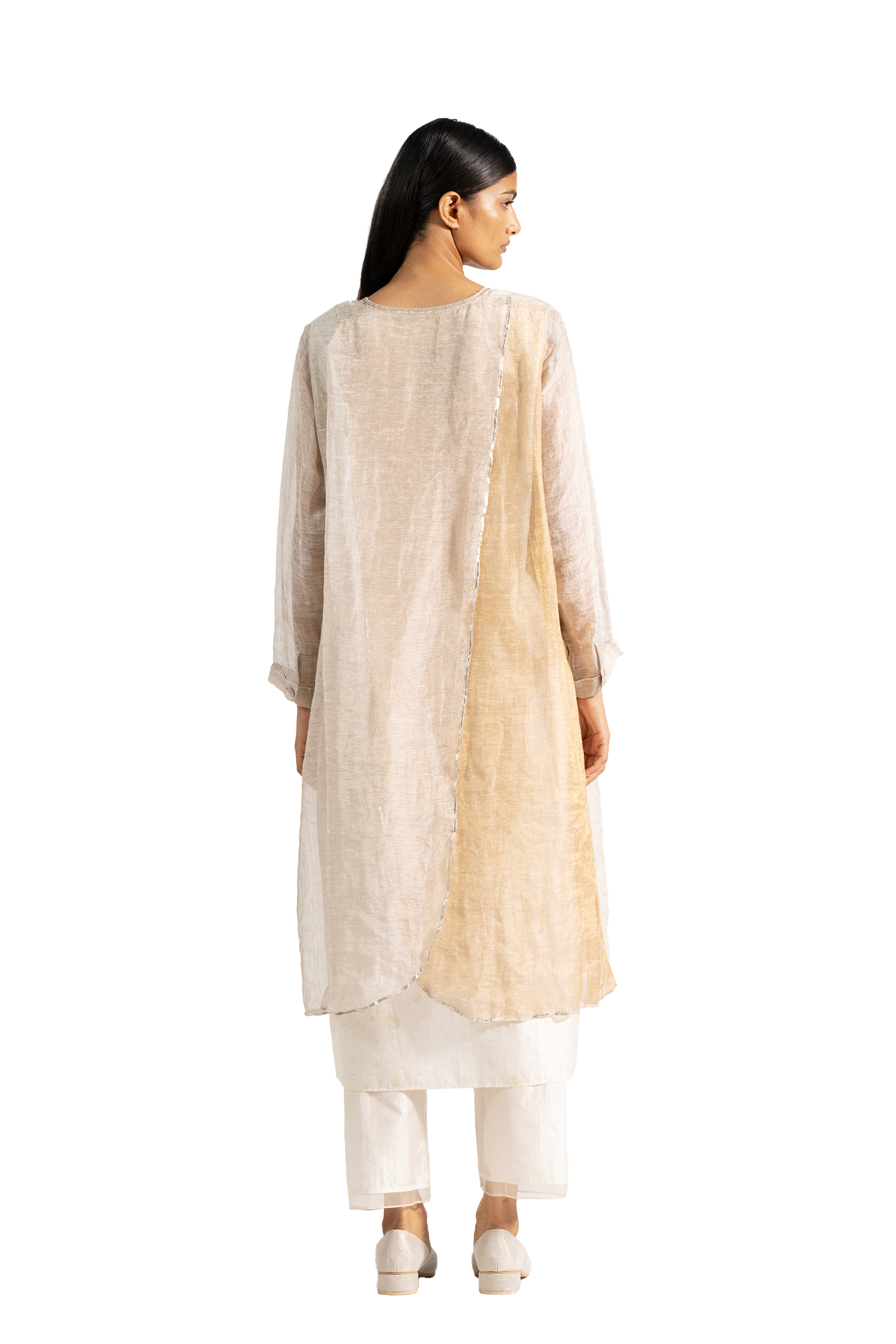Linen zari gauze dress with two-colored panels at back and gota finishes at the hem. Comes with a separate silk trouser.