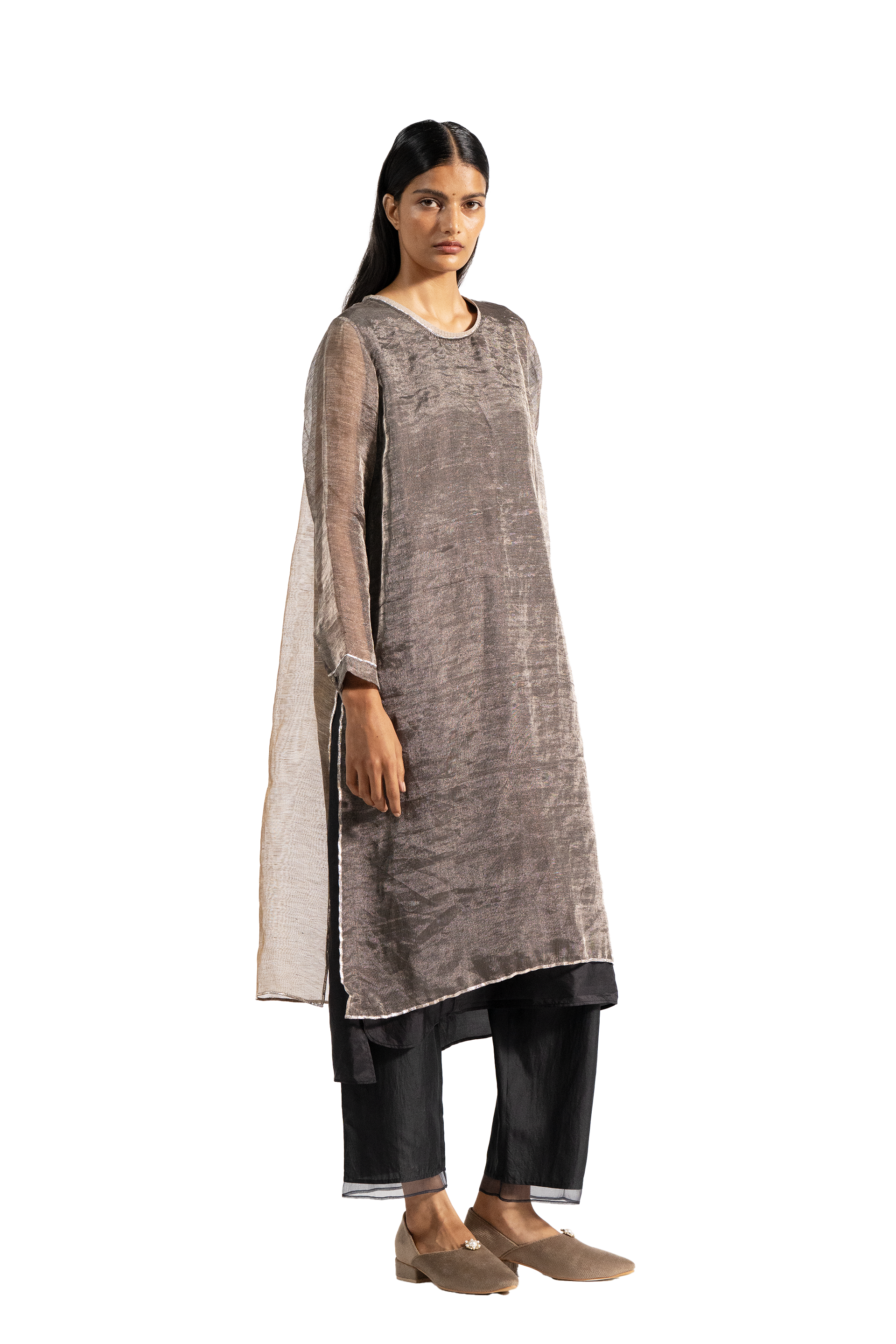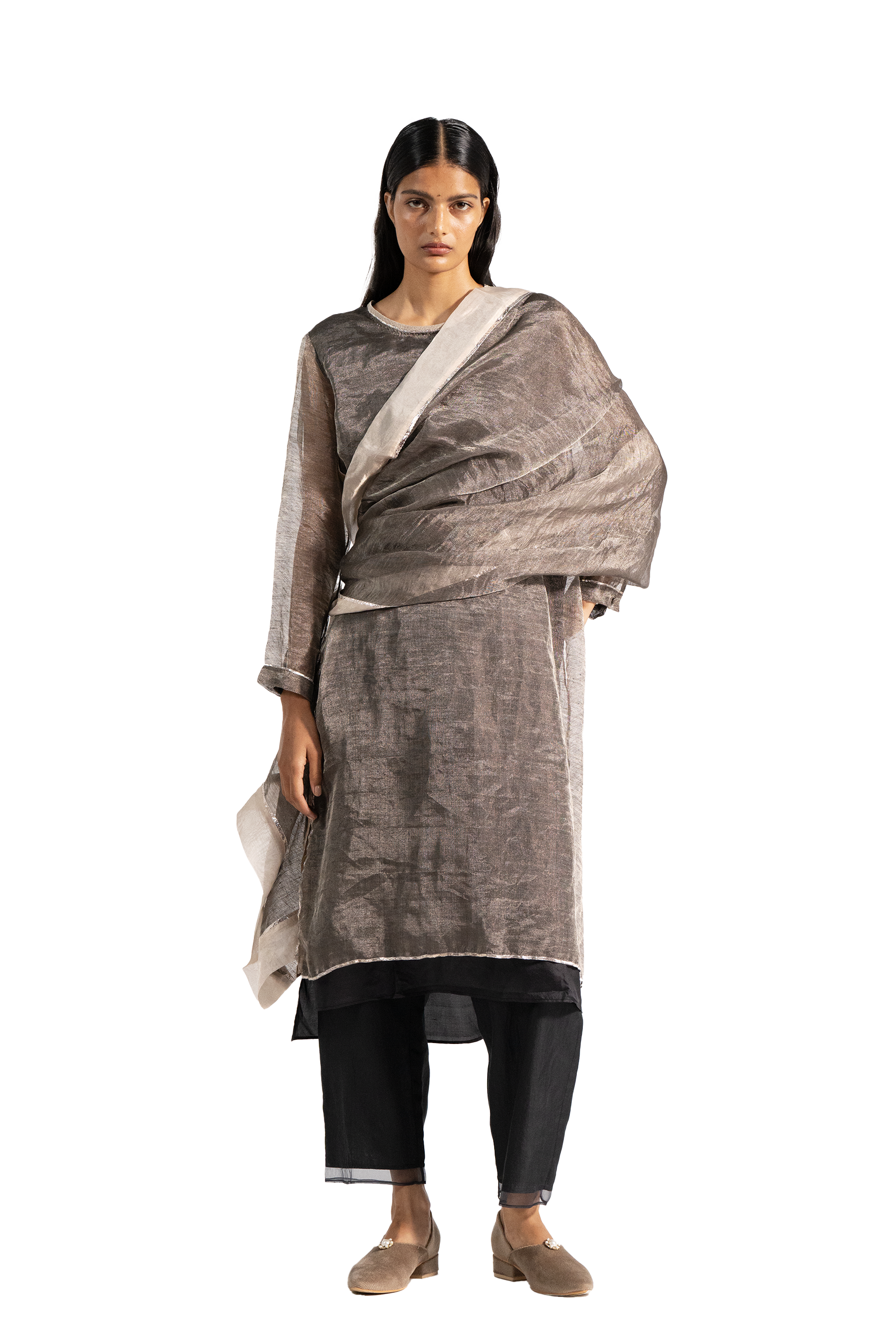 Linen zari gauze dress with two-colored panels at back and gota finishes at the hem. Comes with linen zari trousers with tissue order on hem.