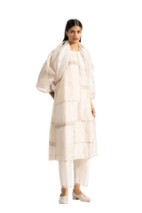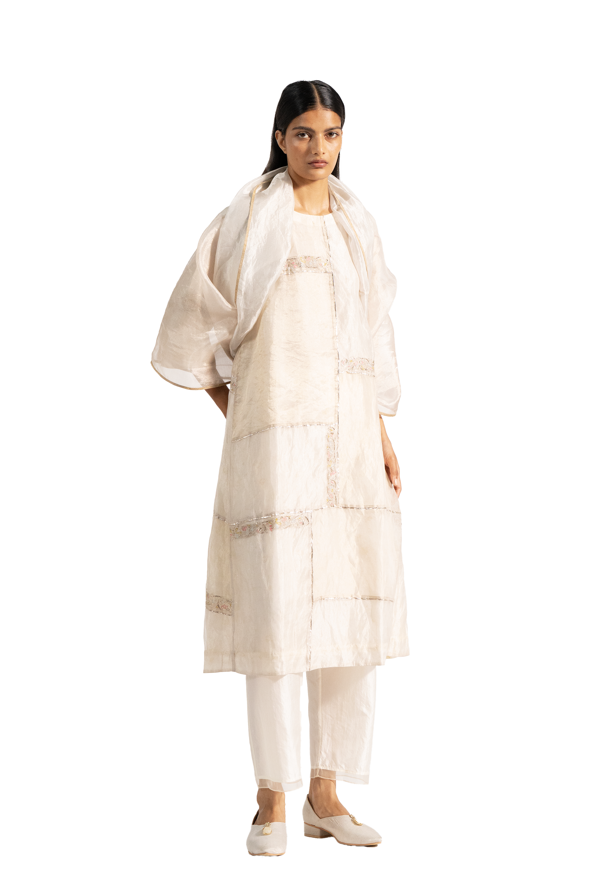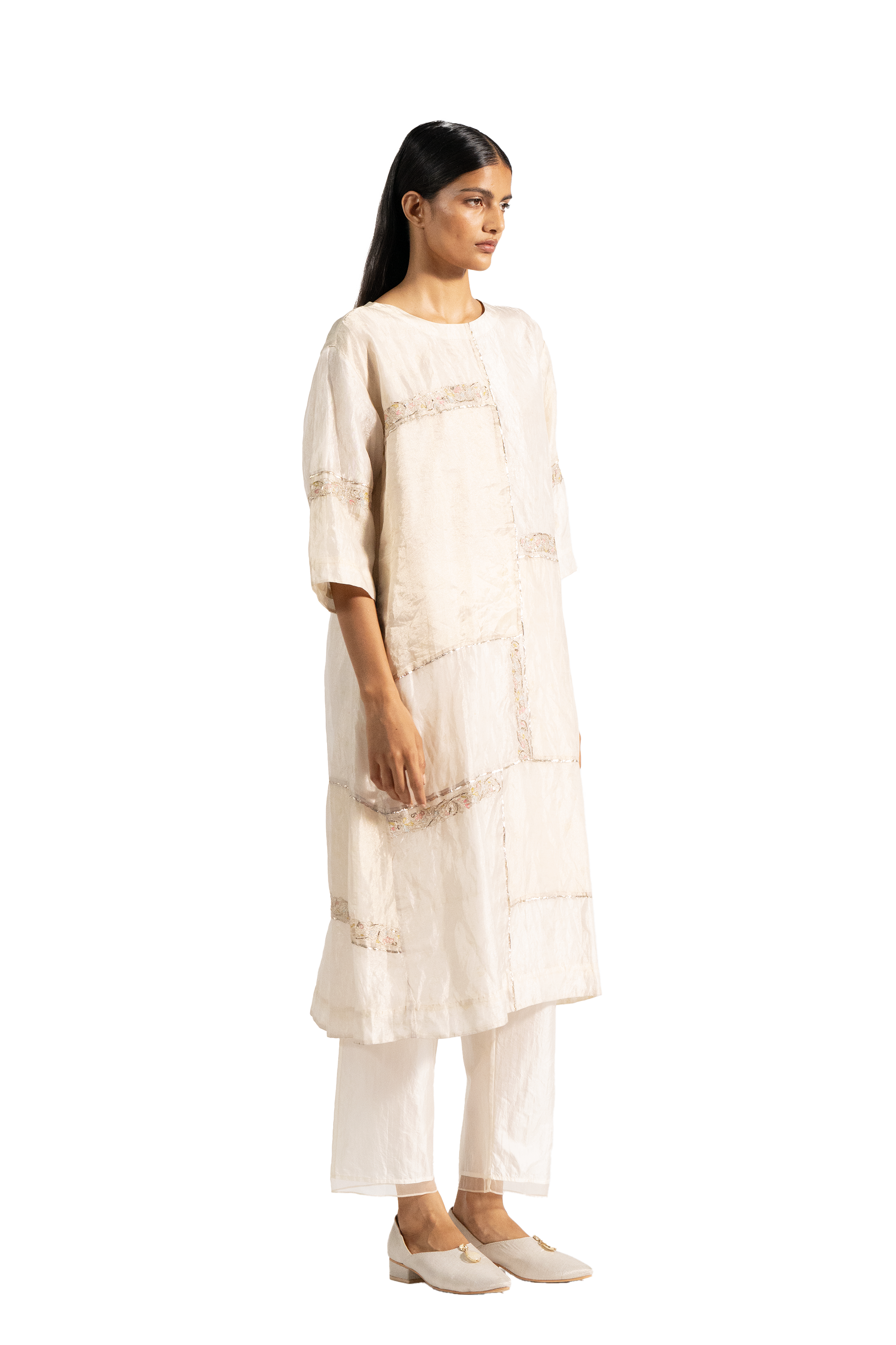 Multicolor patchwork kurta with attached block printed silk lining. Comes with straight fit linen silk trouser with organza border on hem.