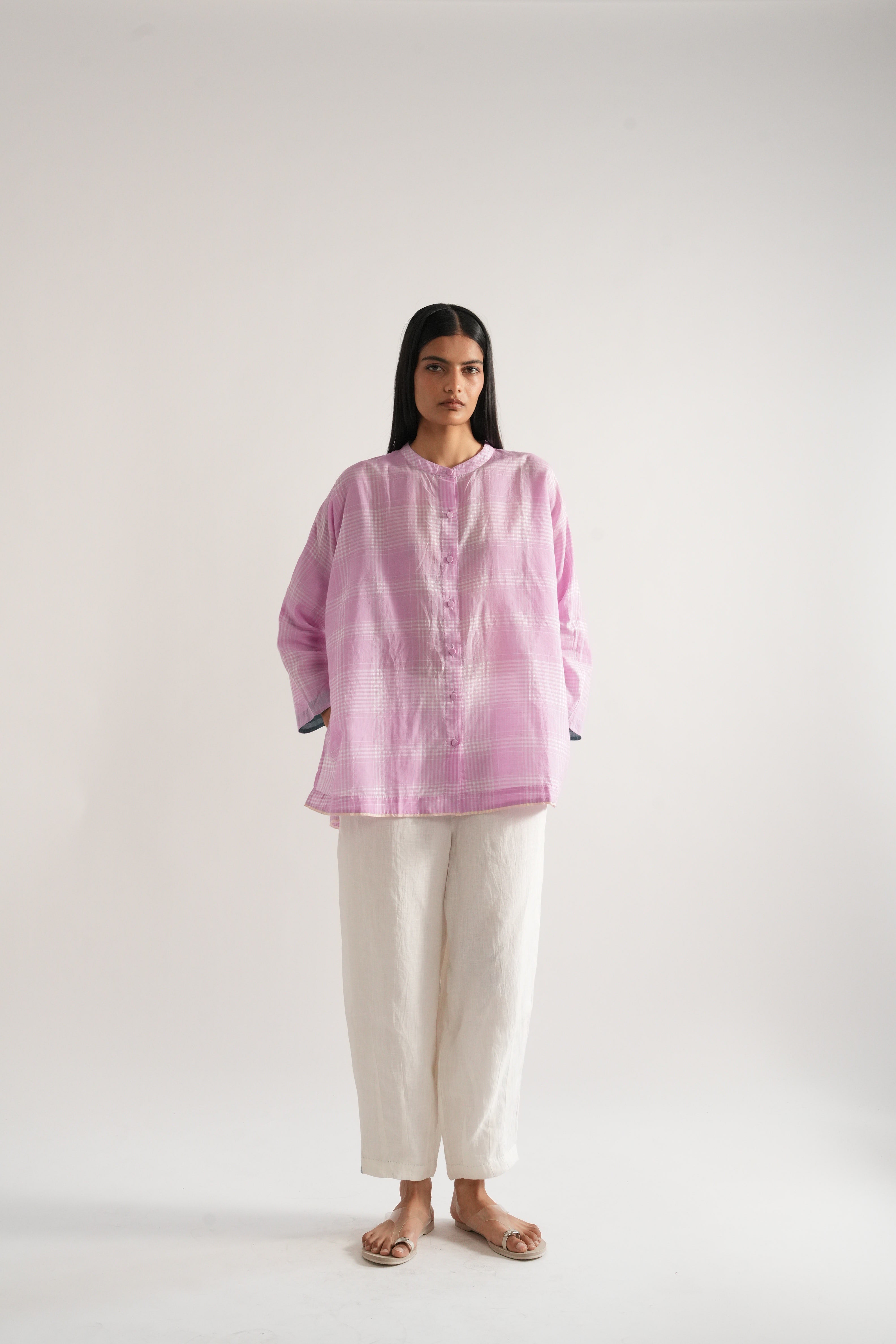 Straight fit shirt in handwoven cotton silk checks with selvage details