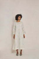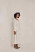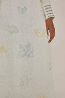 White straight dress with all over hand block quarantine theme printed motifs and smocking details on the cuff, made in linen