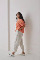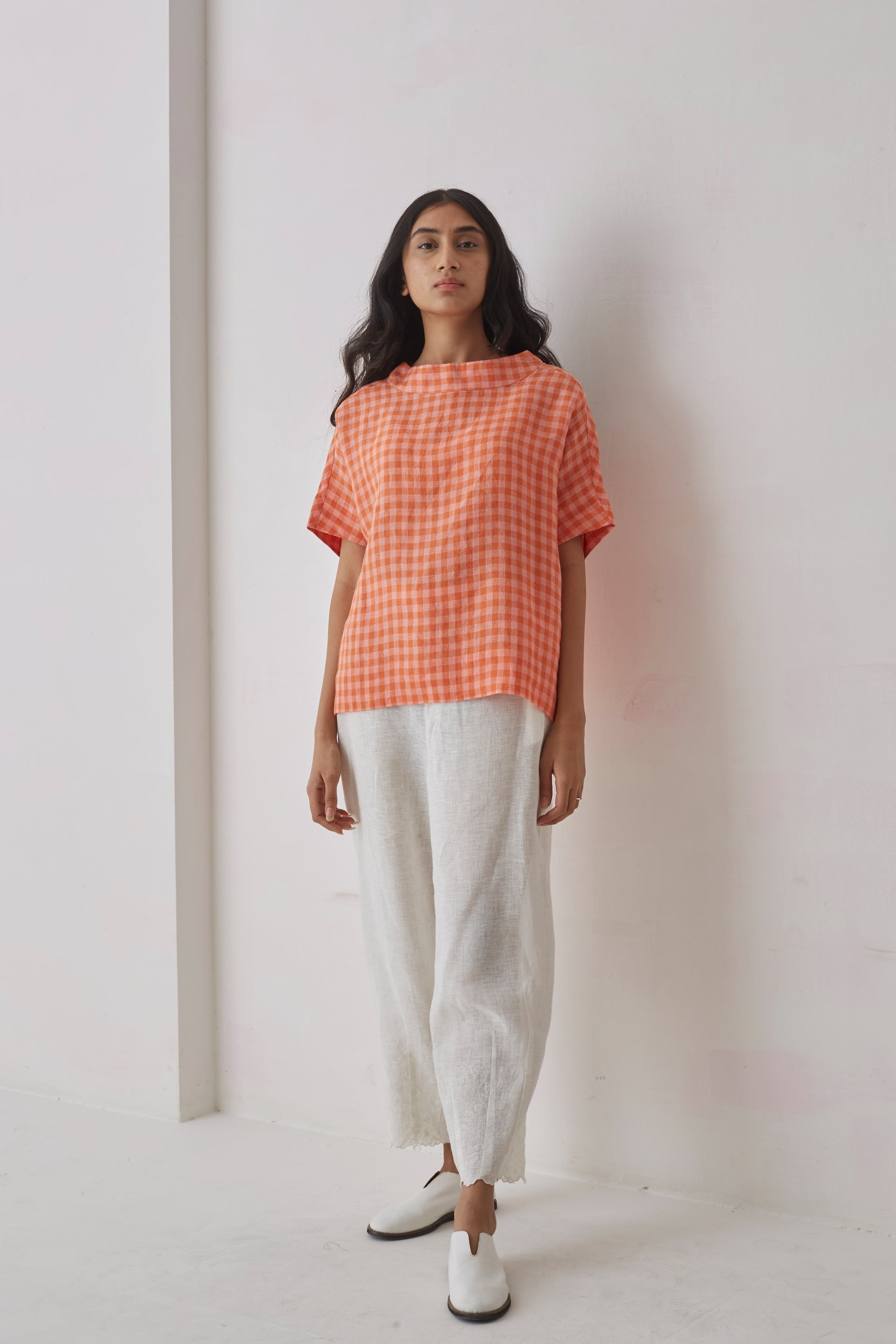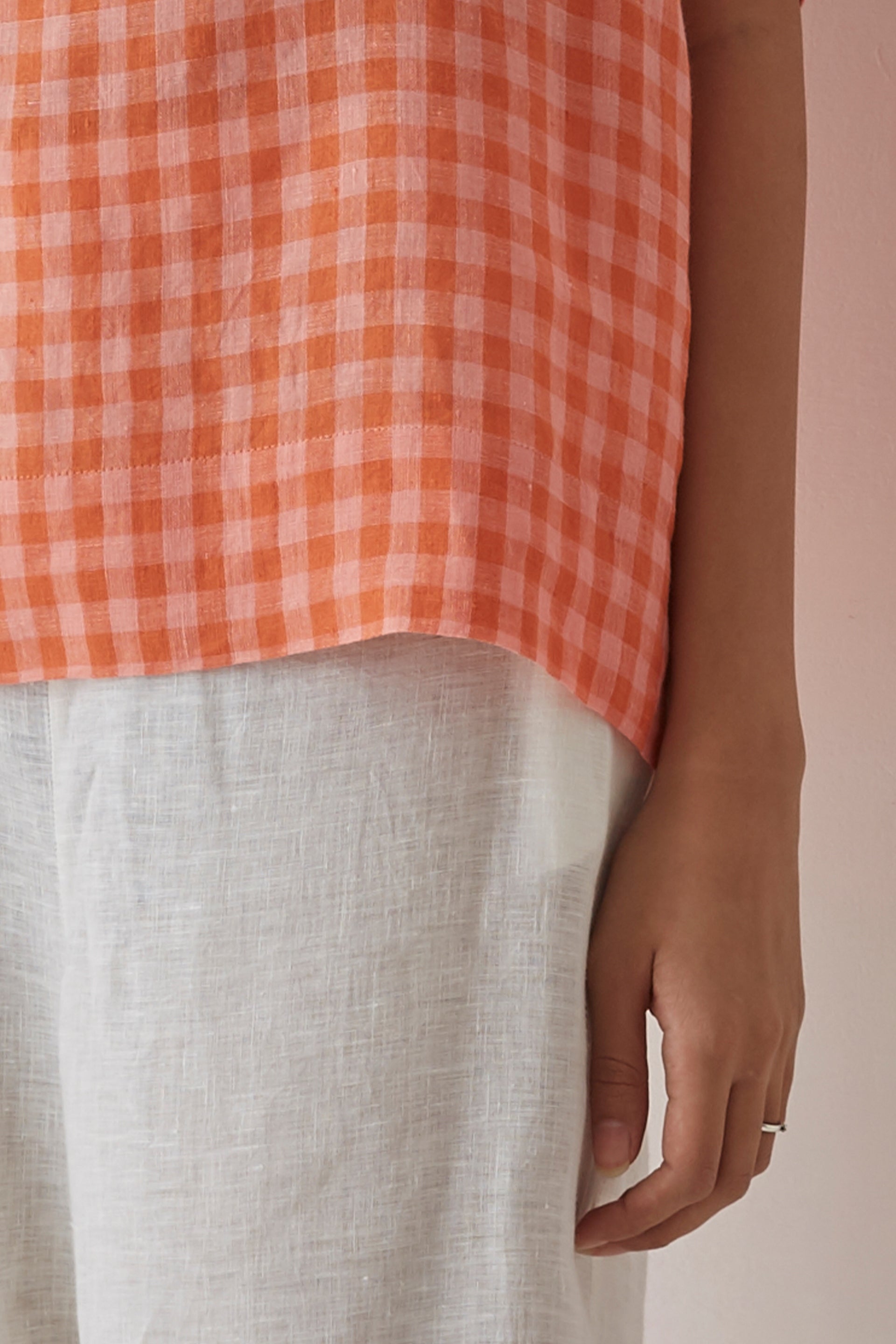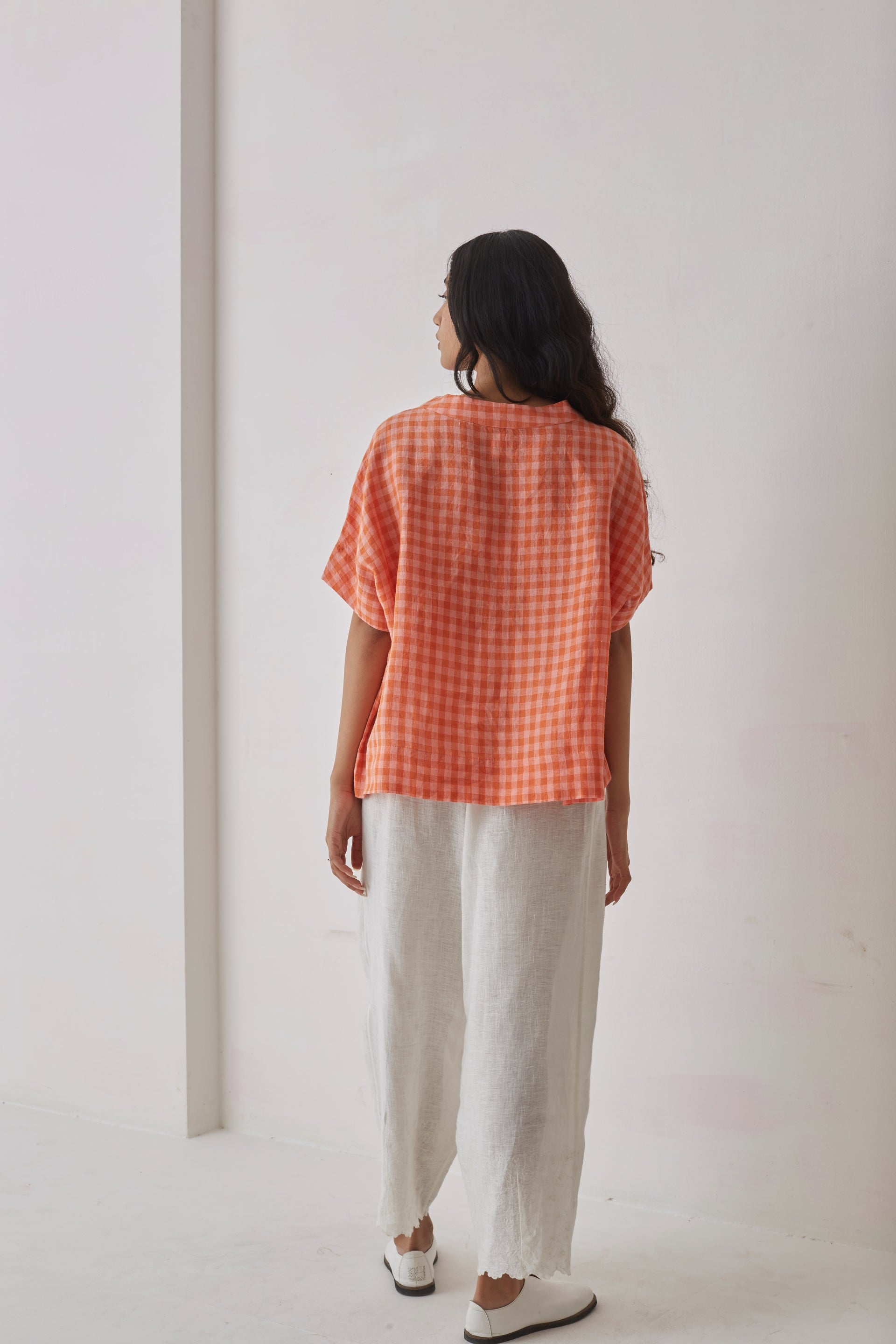 Orange check handwoven linen loose-fit top with mid length sleeves