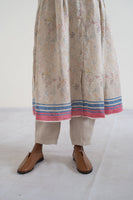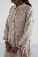 Collared buton-down jacket in handwoven, block-printed linen with gathered waist and contrast selvedge border on the hem