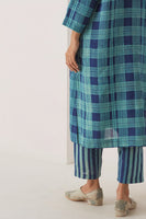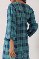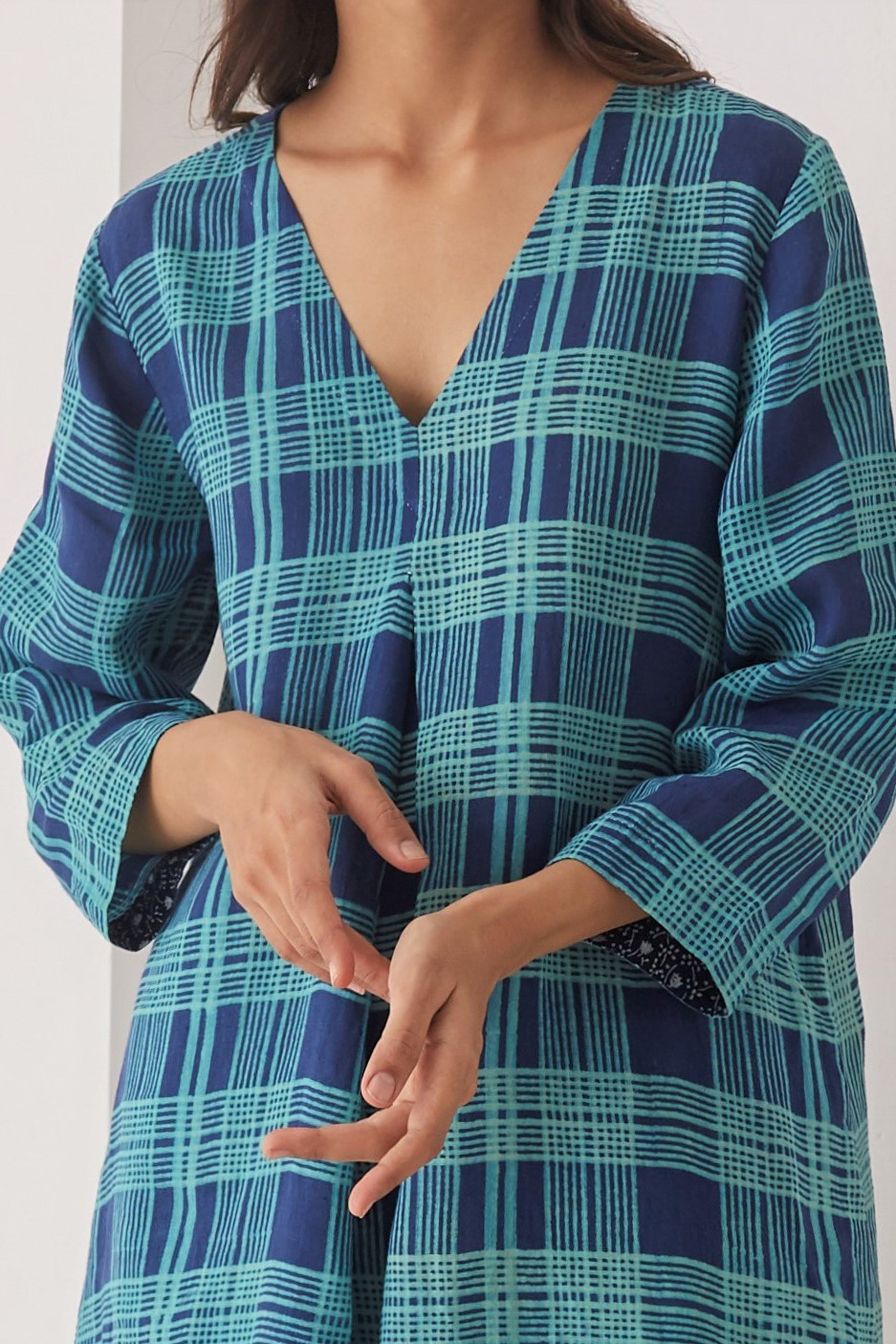 V-neck tunic in handwoven indigo linen with discharge printed checks